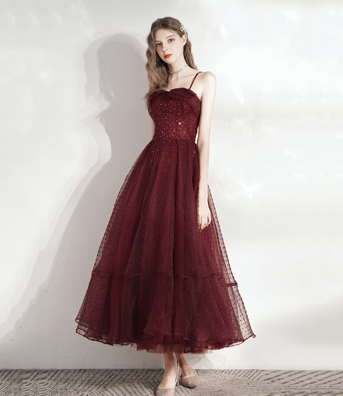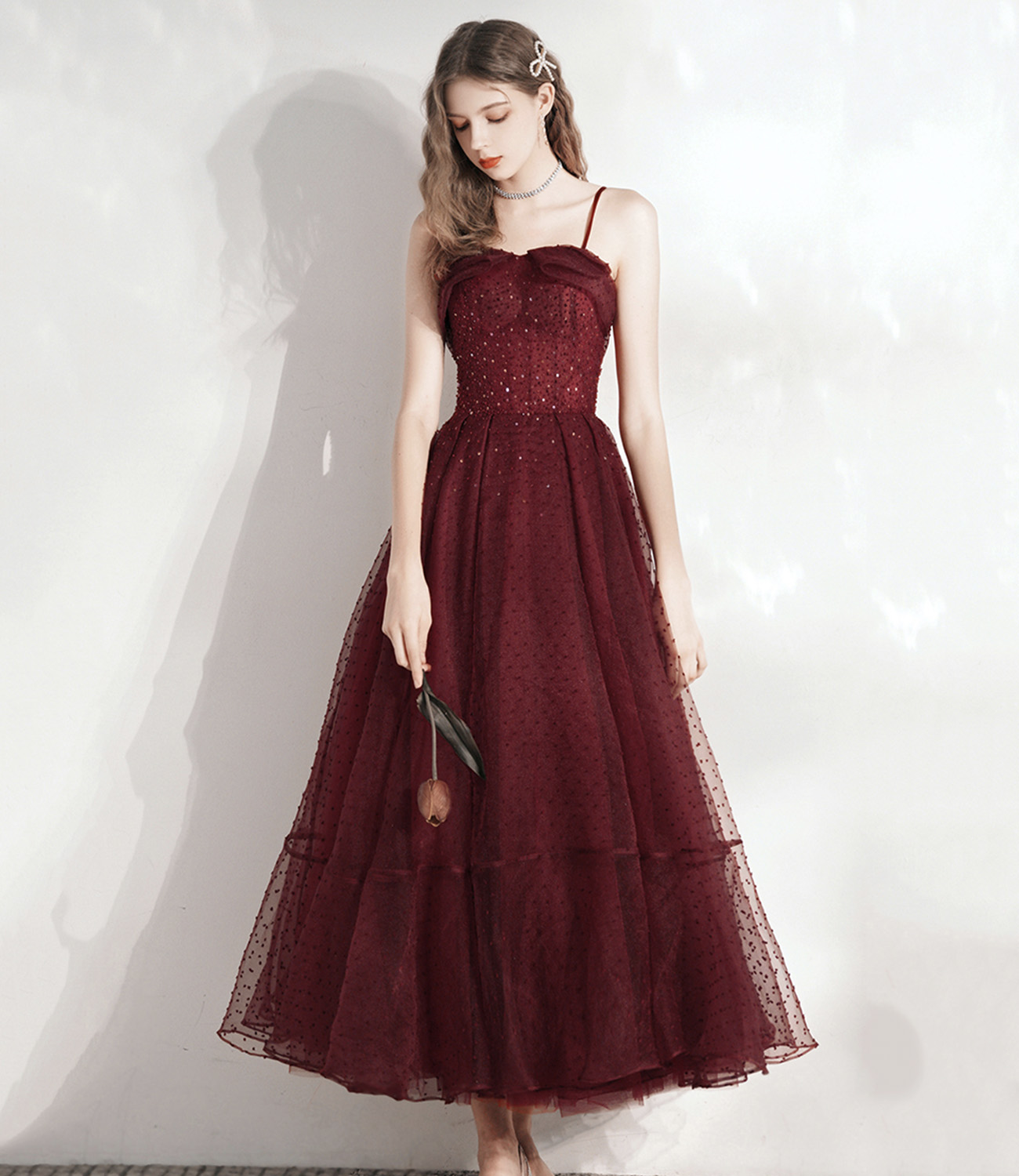 - Burgundy tulle beads short prom dress homecoming dress -