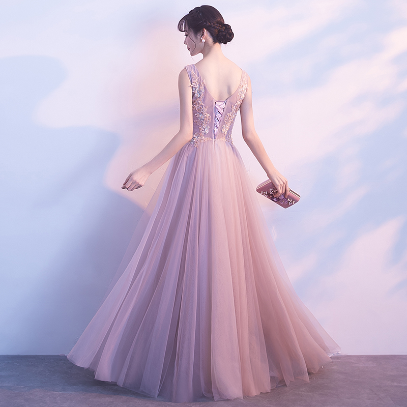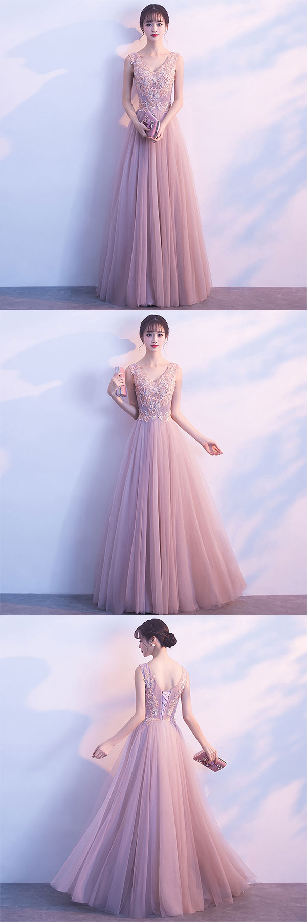 - Pink lace tulle A line long prom dress, cheap evening dresses -