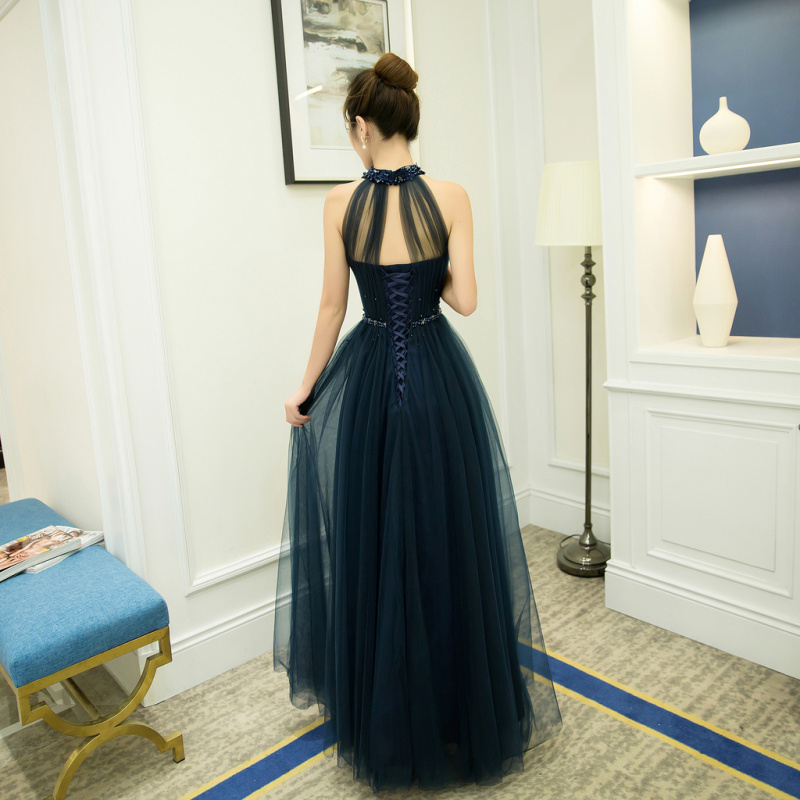 - Dark blue high neck tulle lace long prom dress, evening dress -