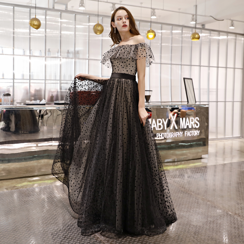 - Cute black tulle long prom dress, evening dress -