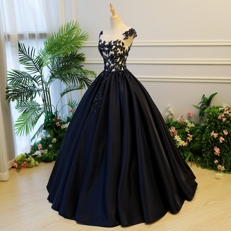 - Dark blue lace long prom gown, evening dress -