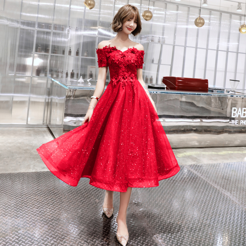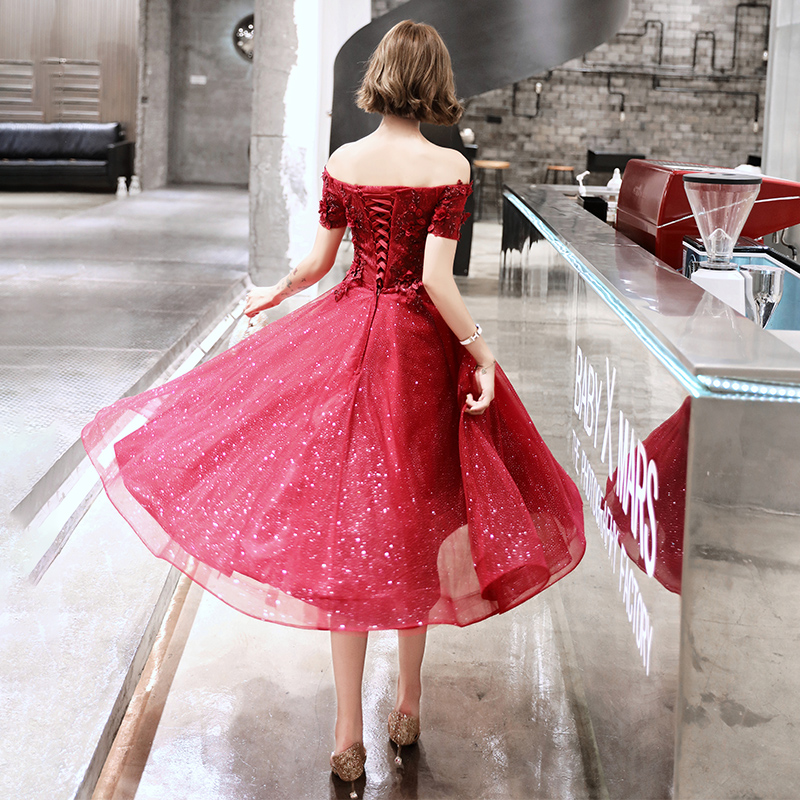 - Burgundy tulle lace short A line prom dress, evening dress -
