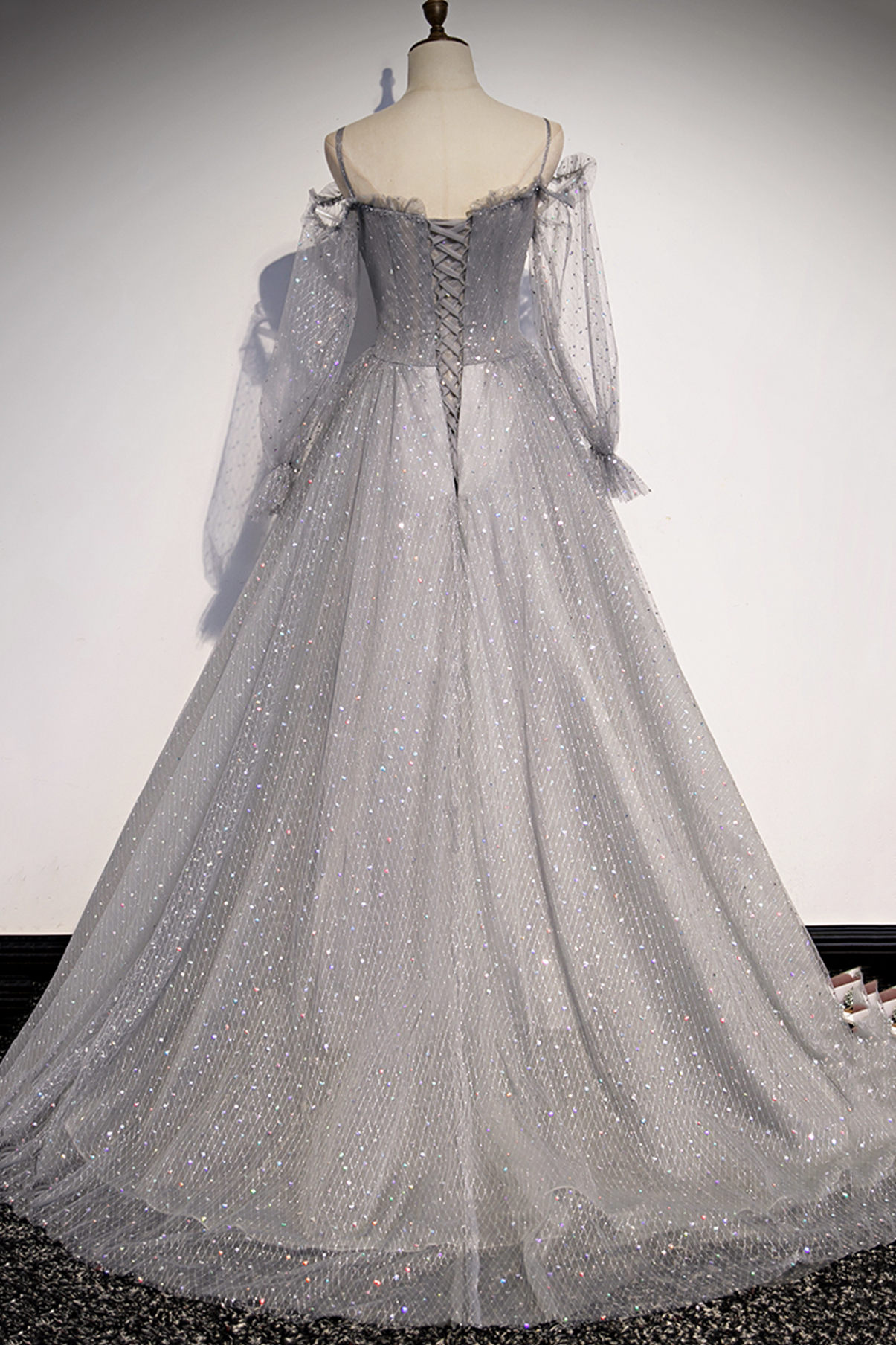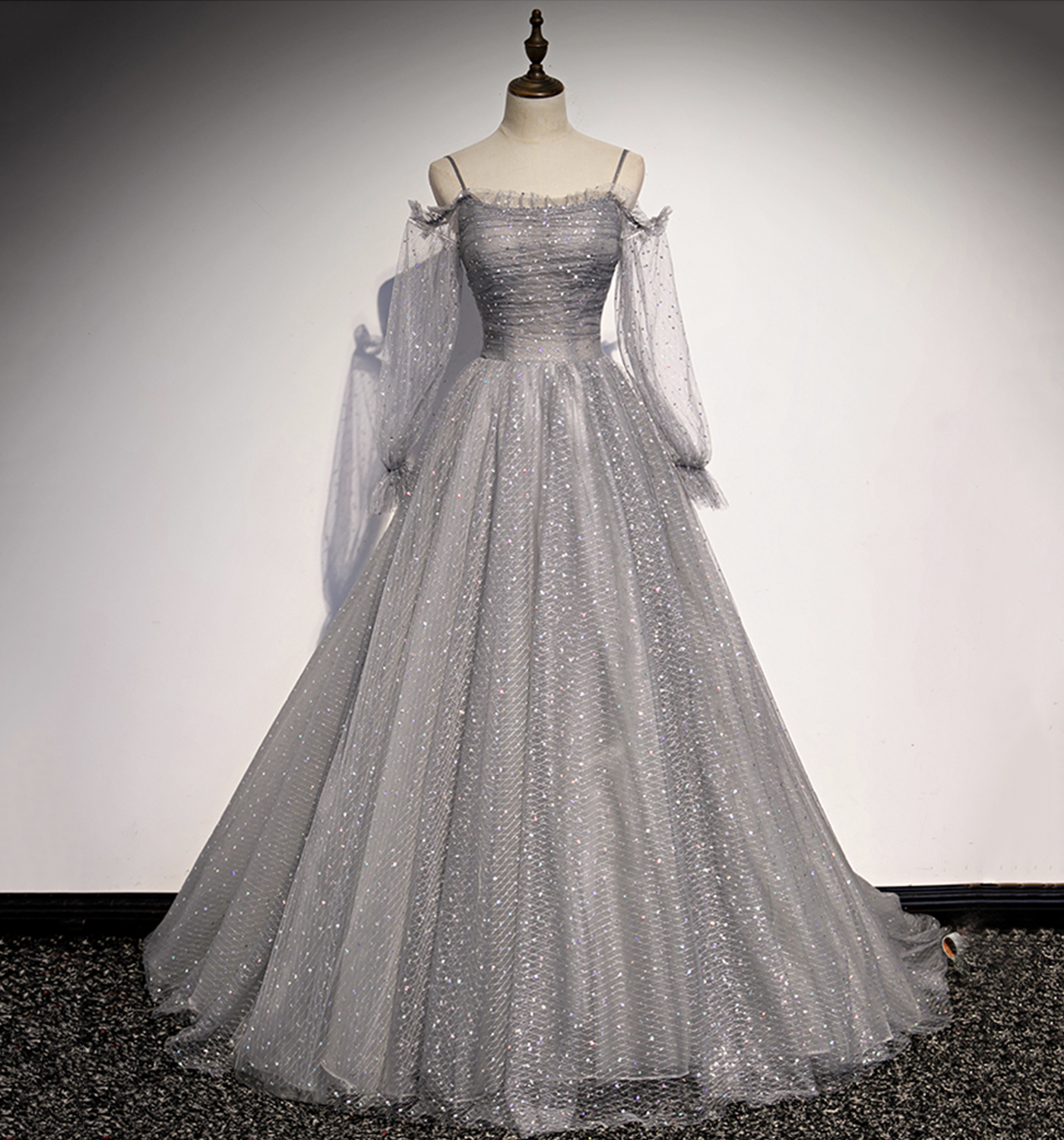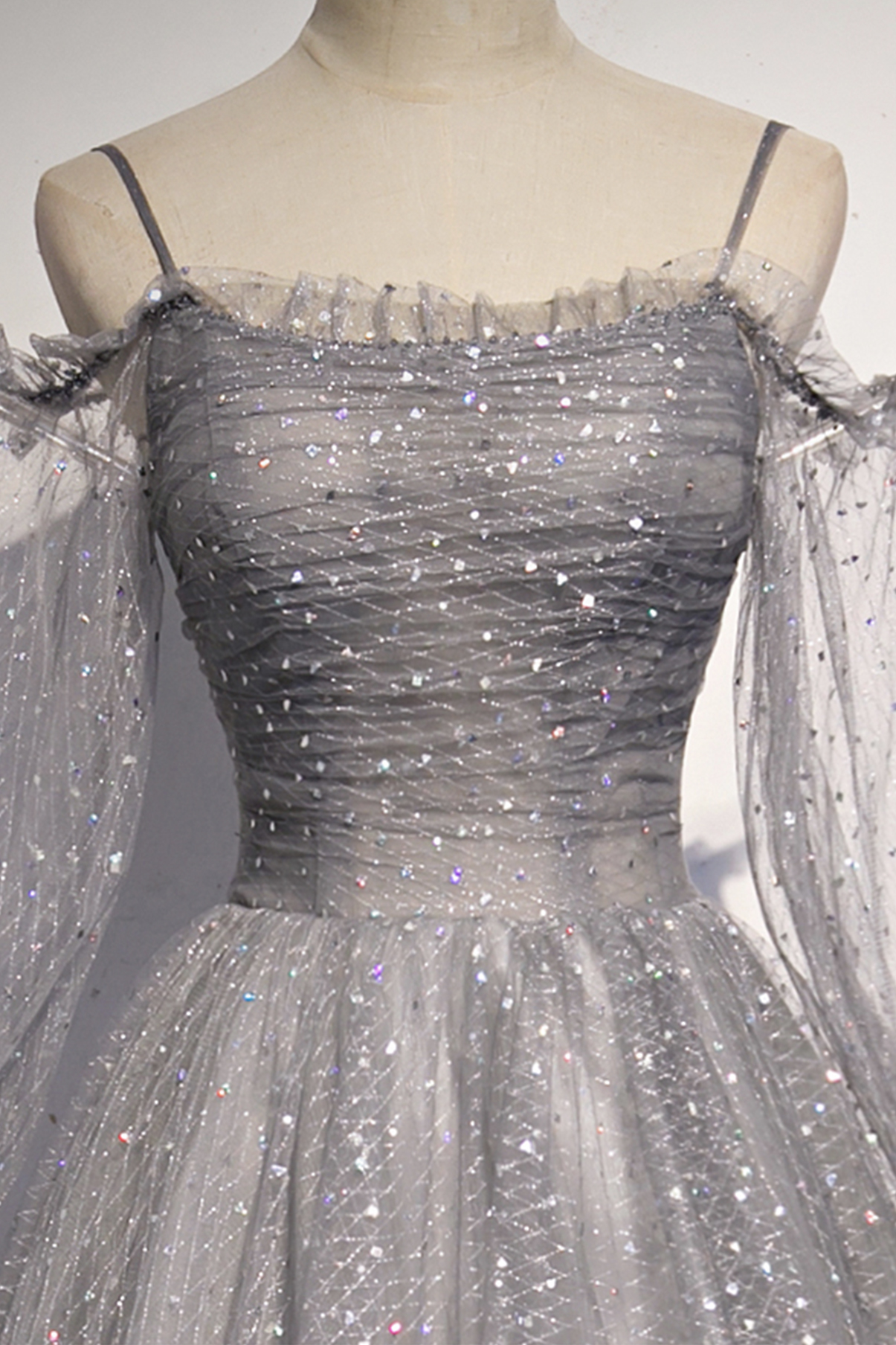 - Gray Tulle Sequins Long A Line Prom Dress Evening Dress -