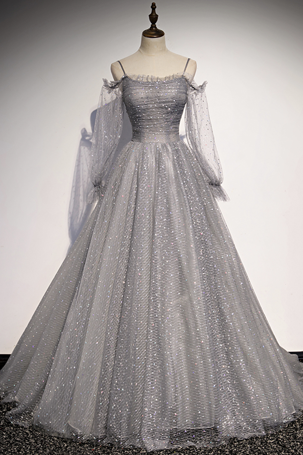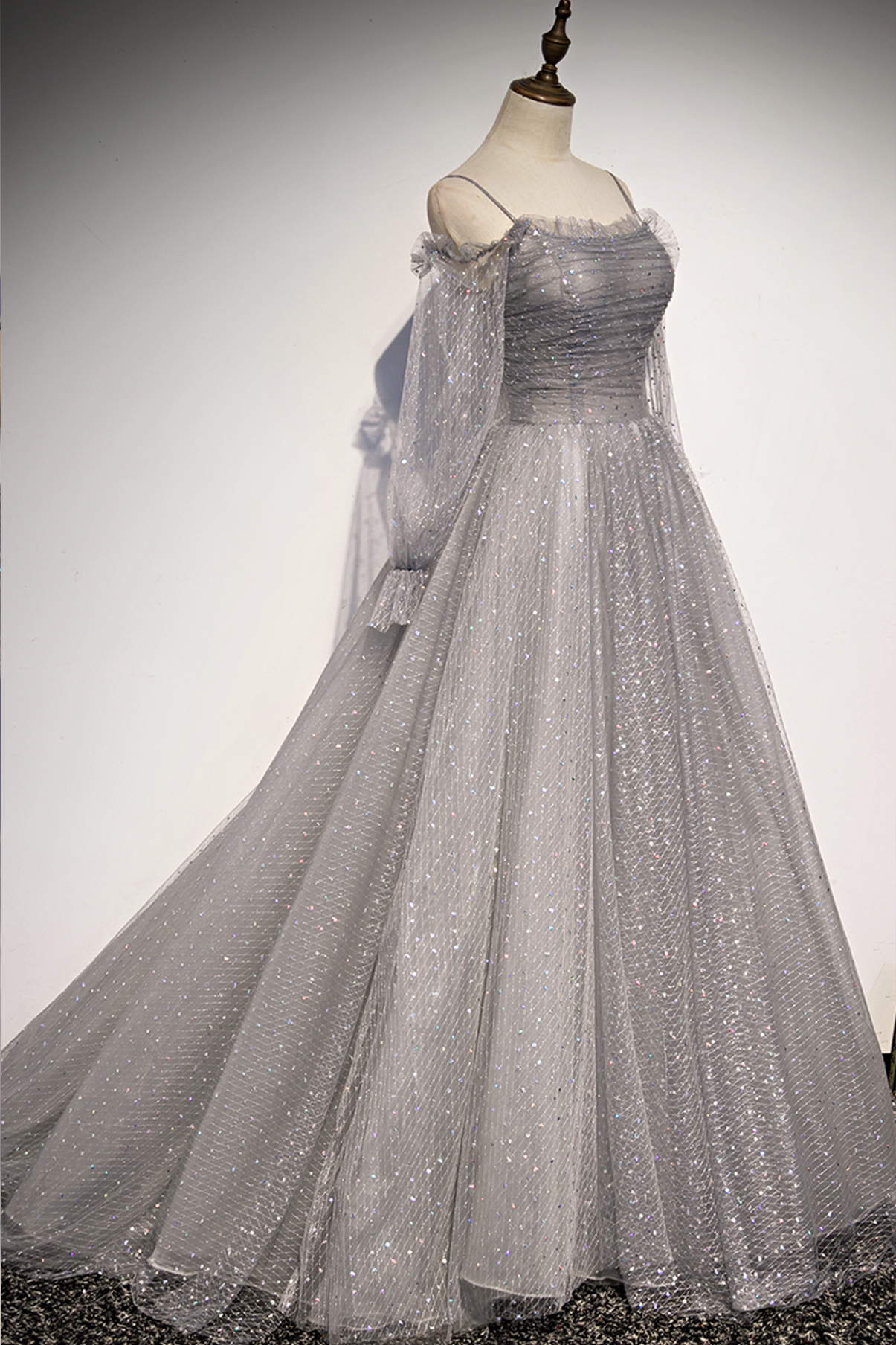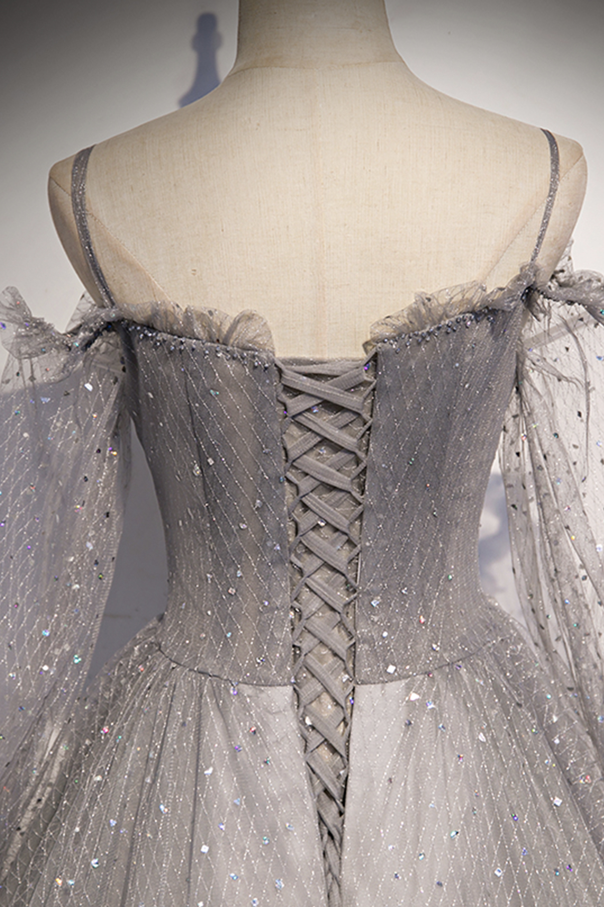 - Gray Tulle Sequins Long A Line Prom Dress Evening Dress -