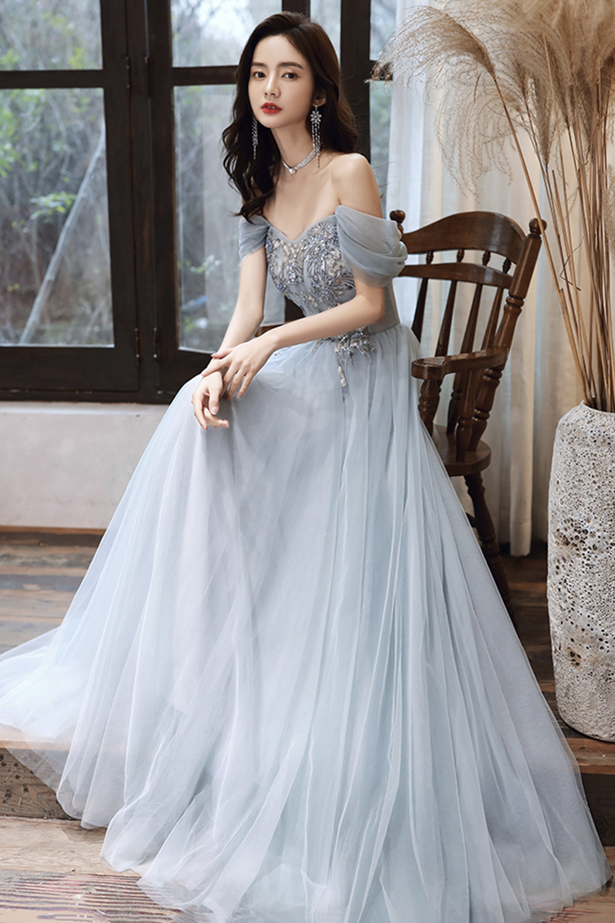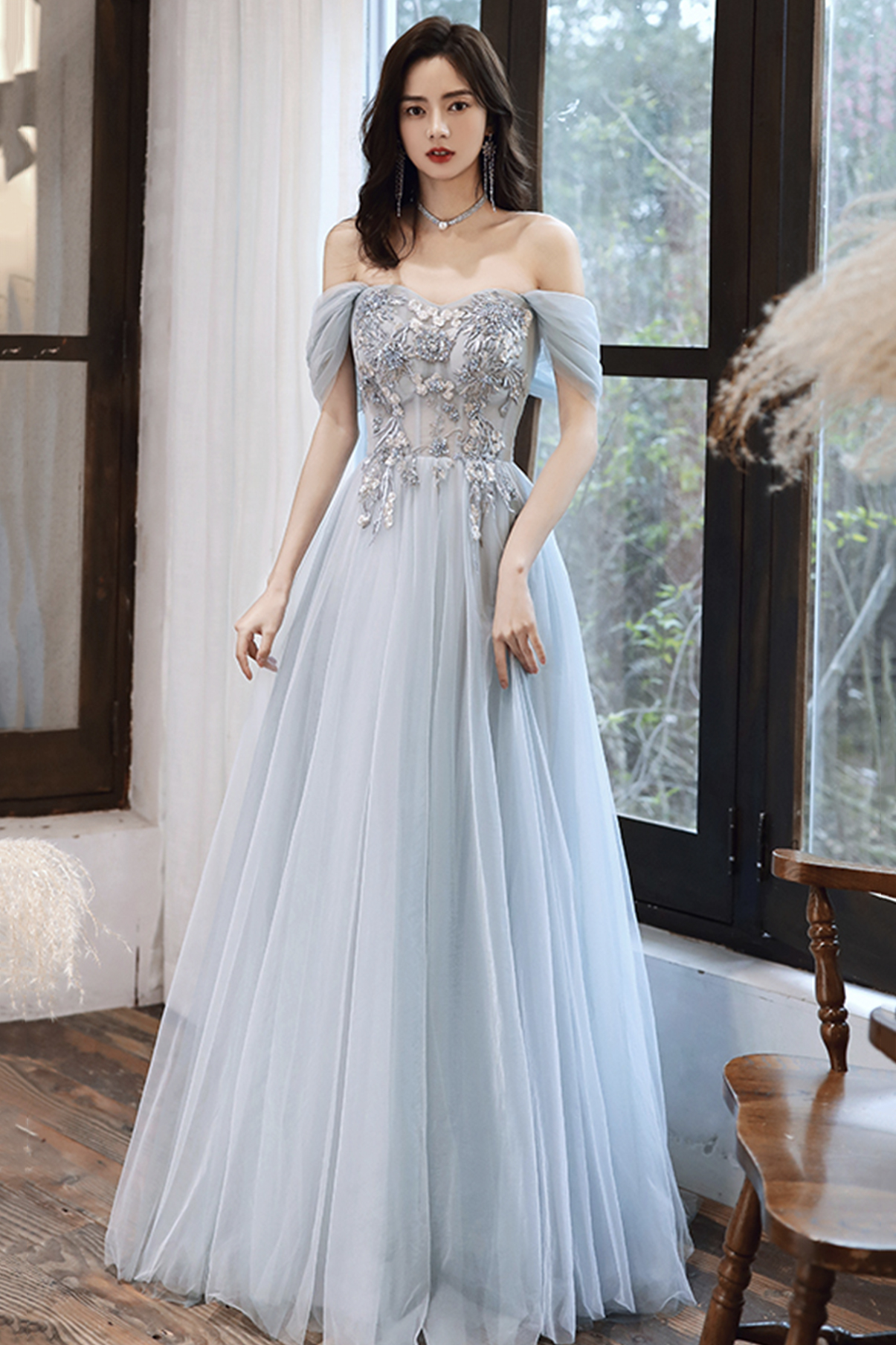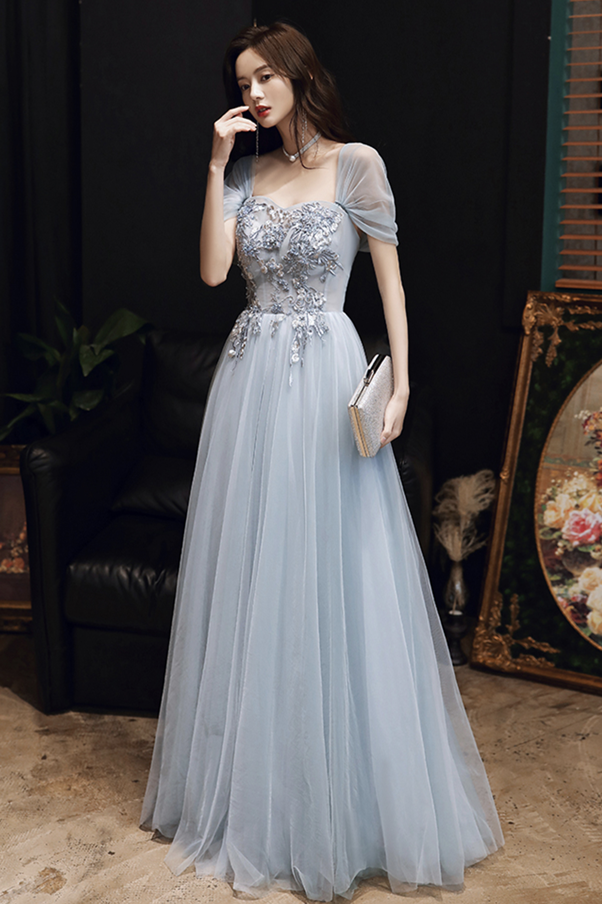 - Gray tulle lace long A line prom dress evening dress -
