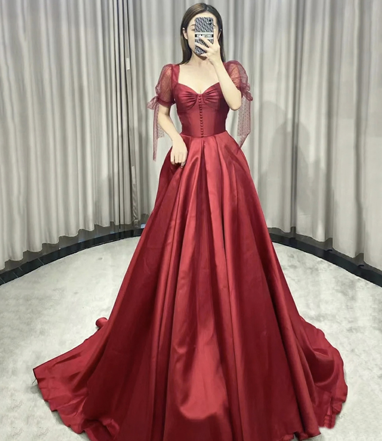 - Red satin long prom dress A line evening gown -
