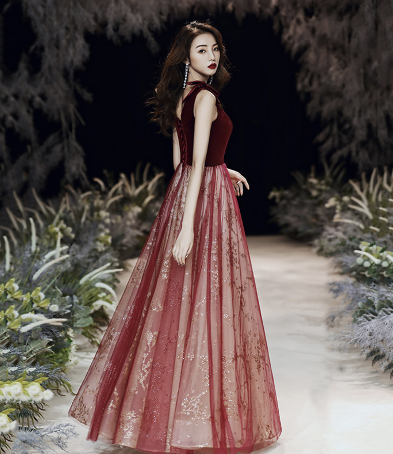 - Burgundy velvet long prom dress A line evening gown -