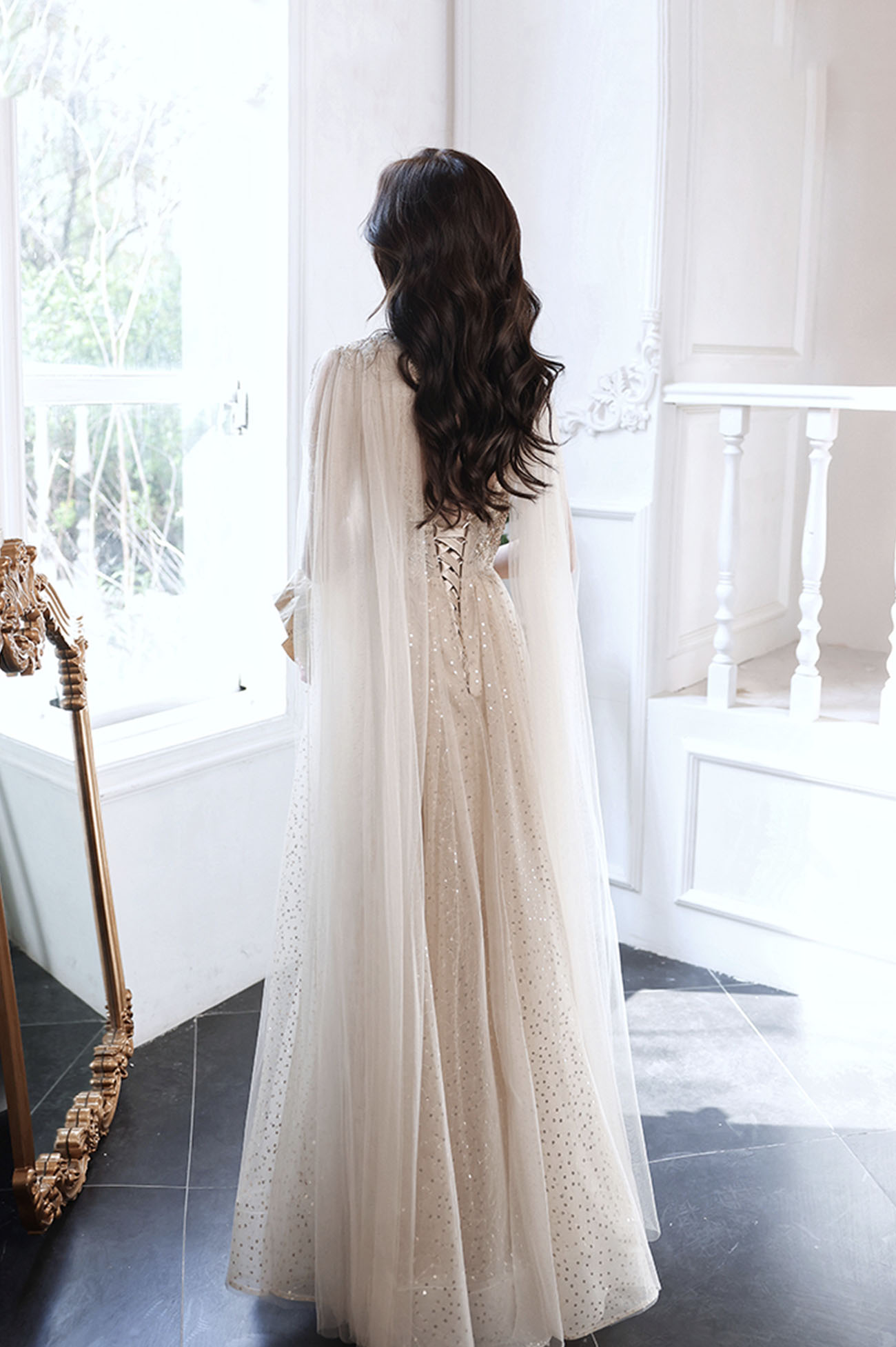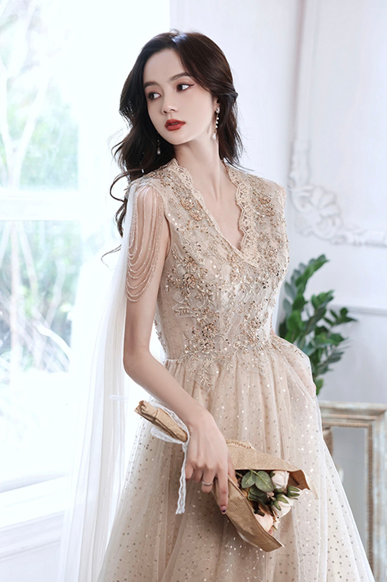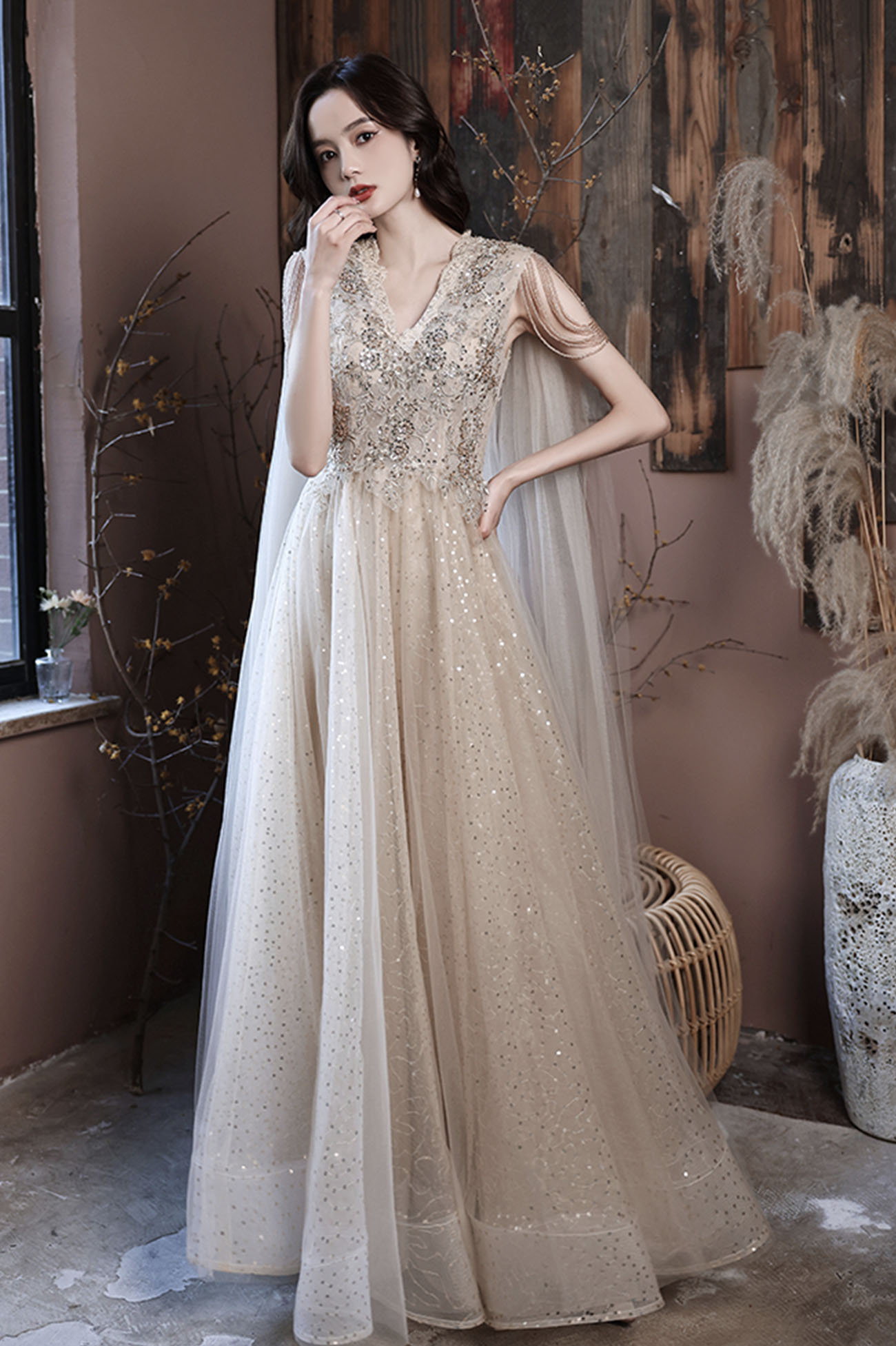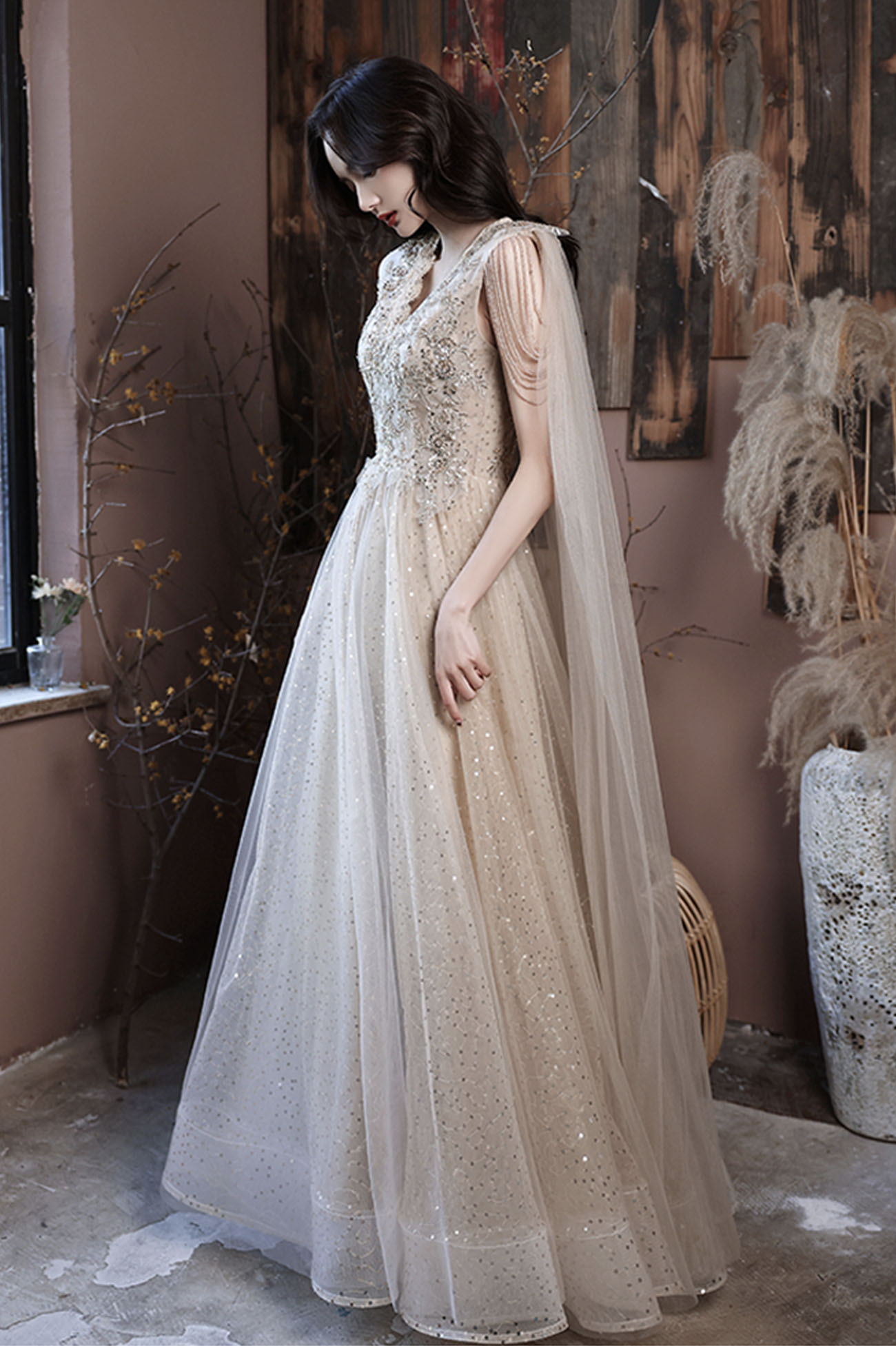 - Champagne tulle sequins long prom dress evening dress -