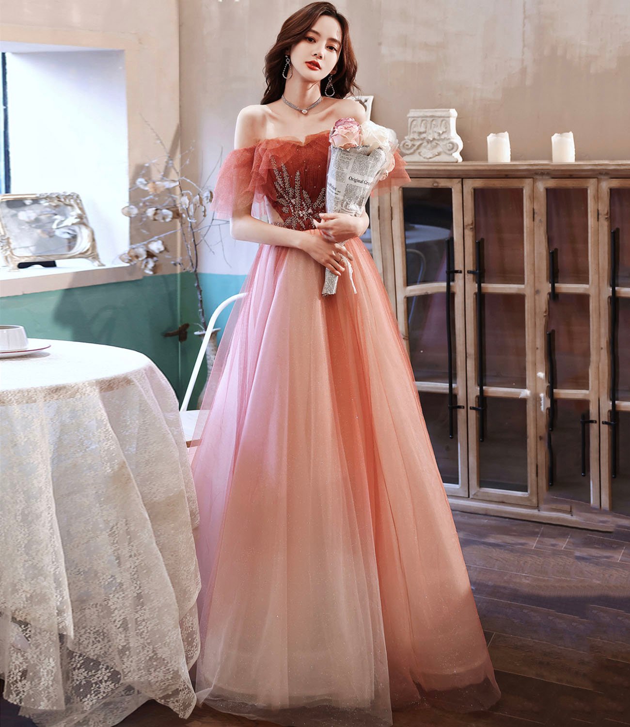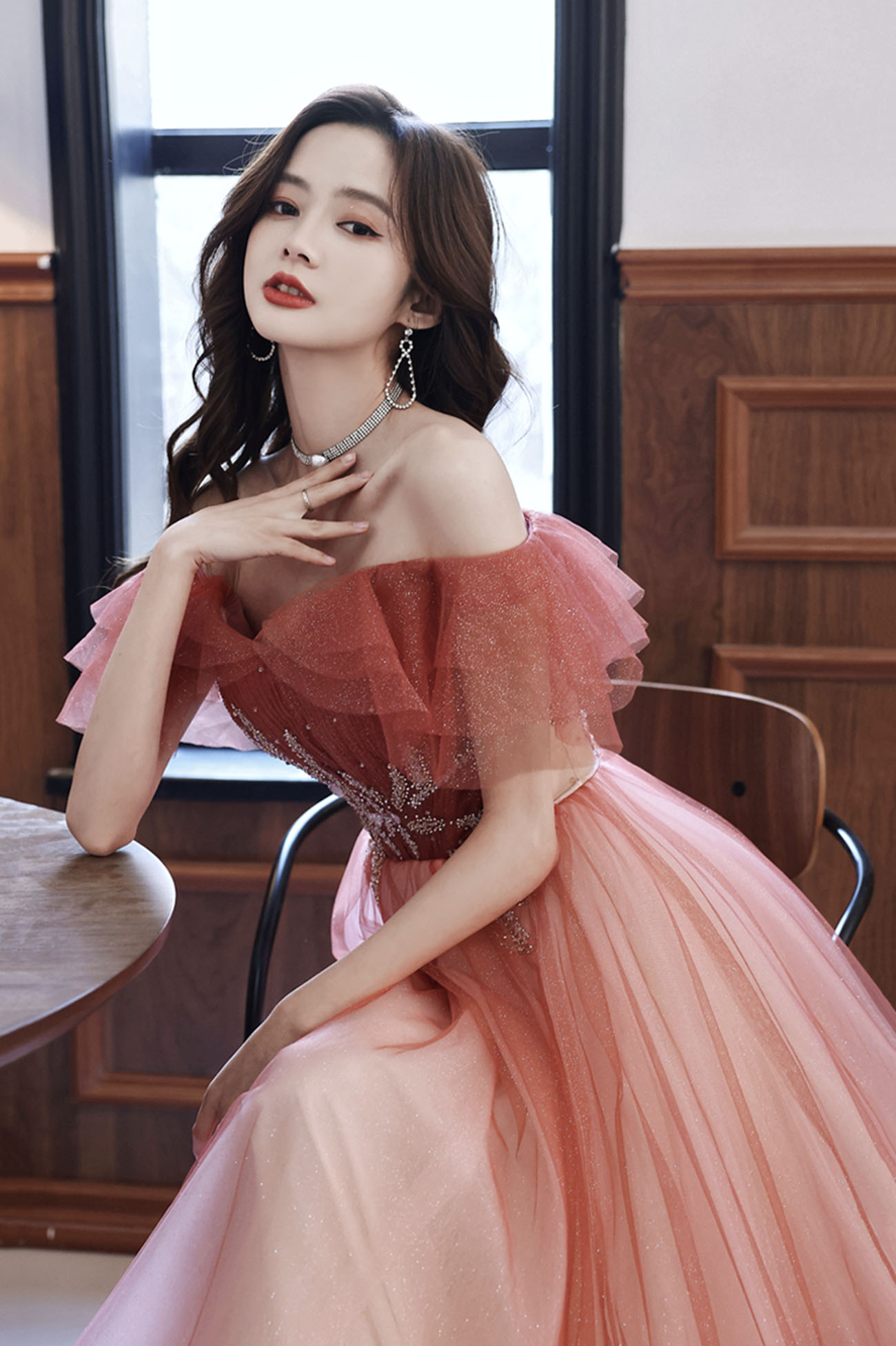 - Burgundy tulle sequins long prom dress A line evening dress -