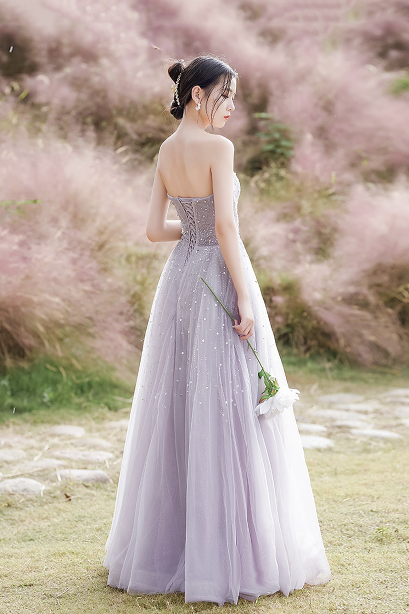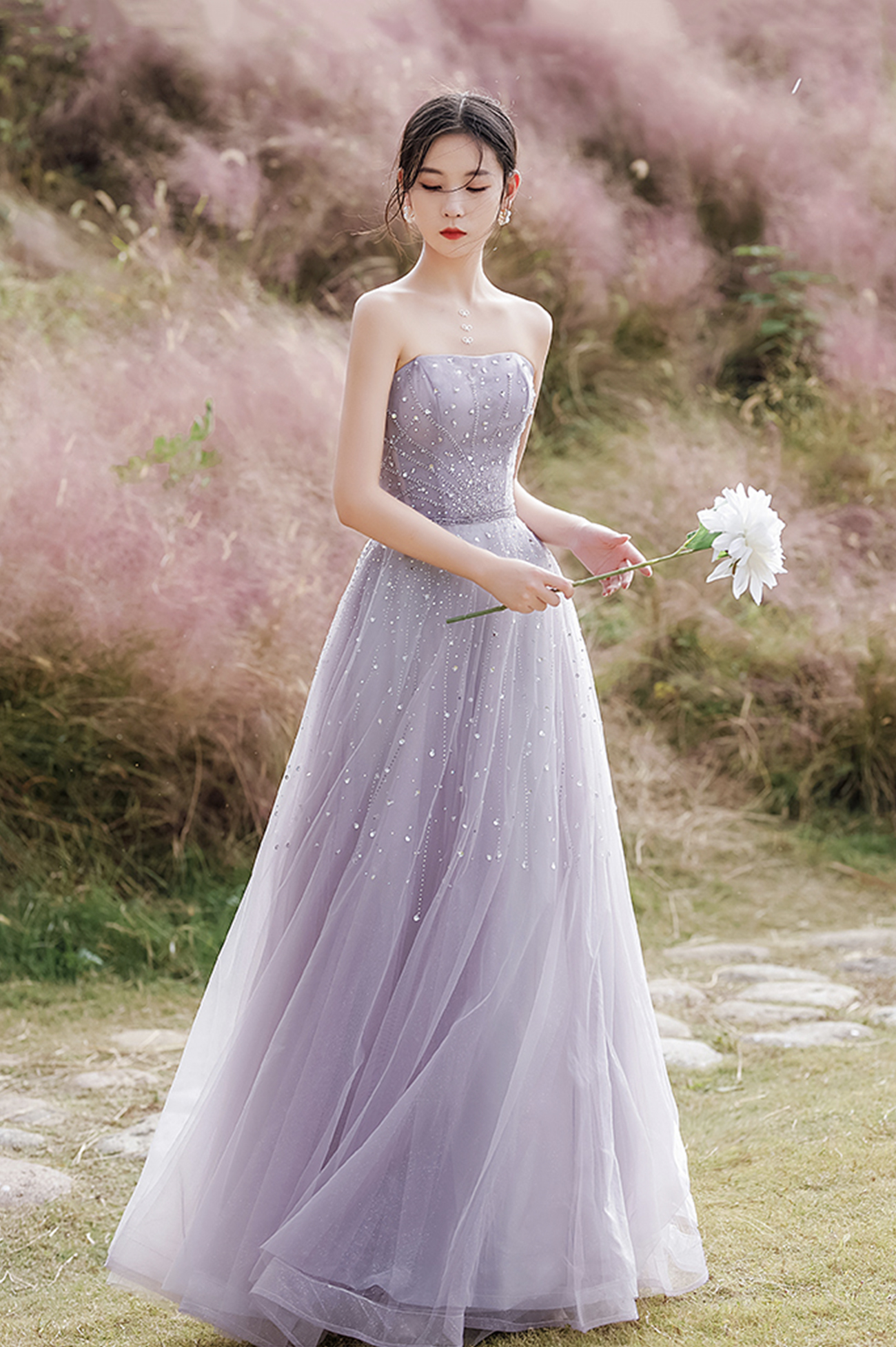 - Purple tulle beads long prom dress A line evening dress -