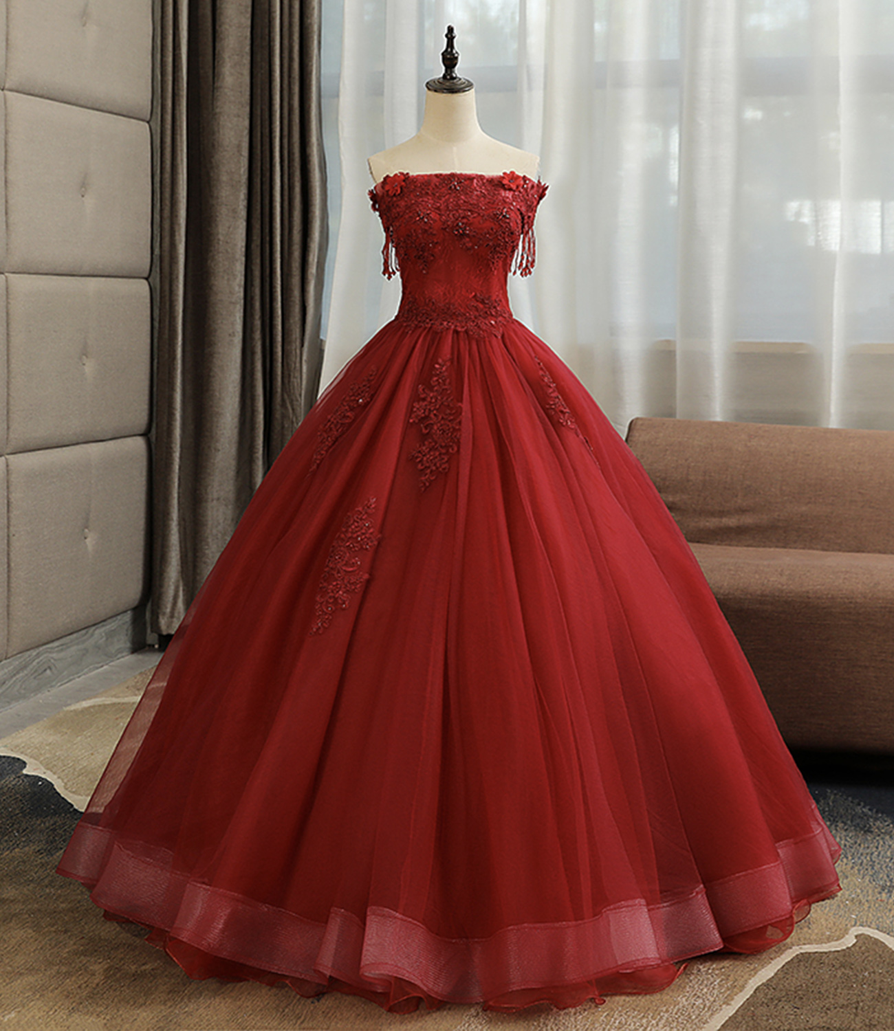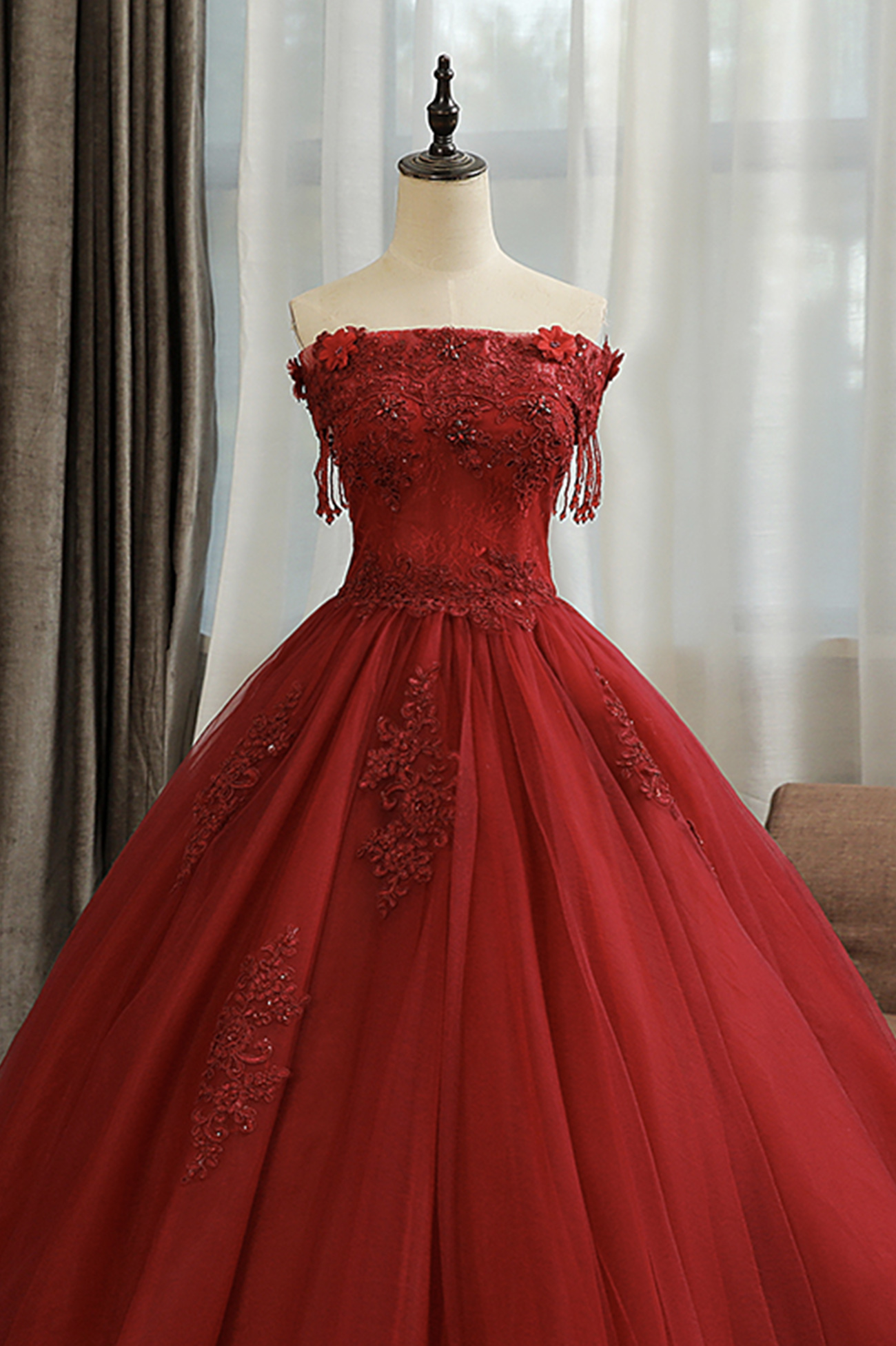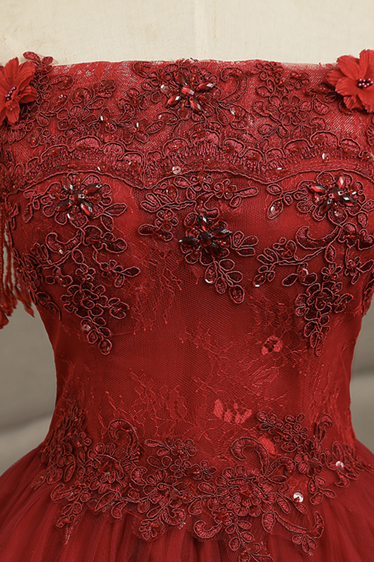 - Burgundy tulle lace long prom dress A line evening gown -