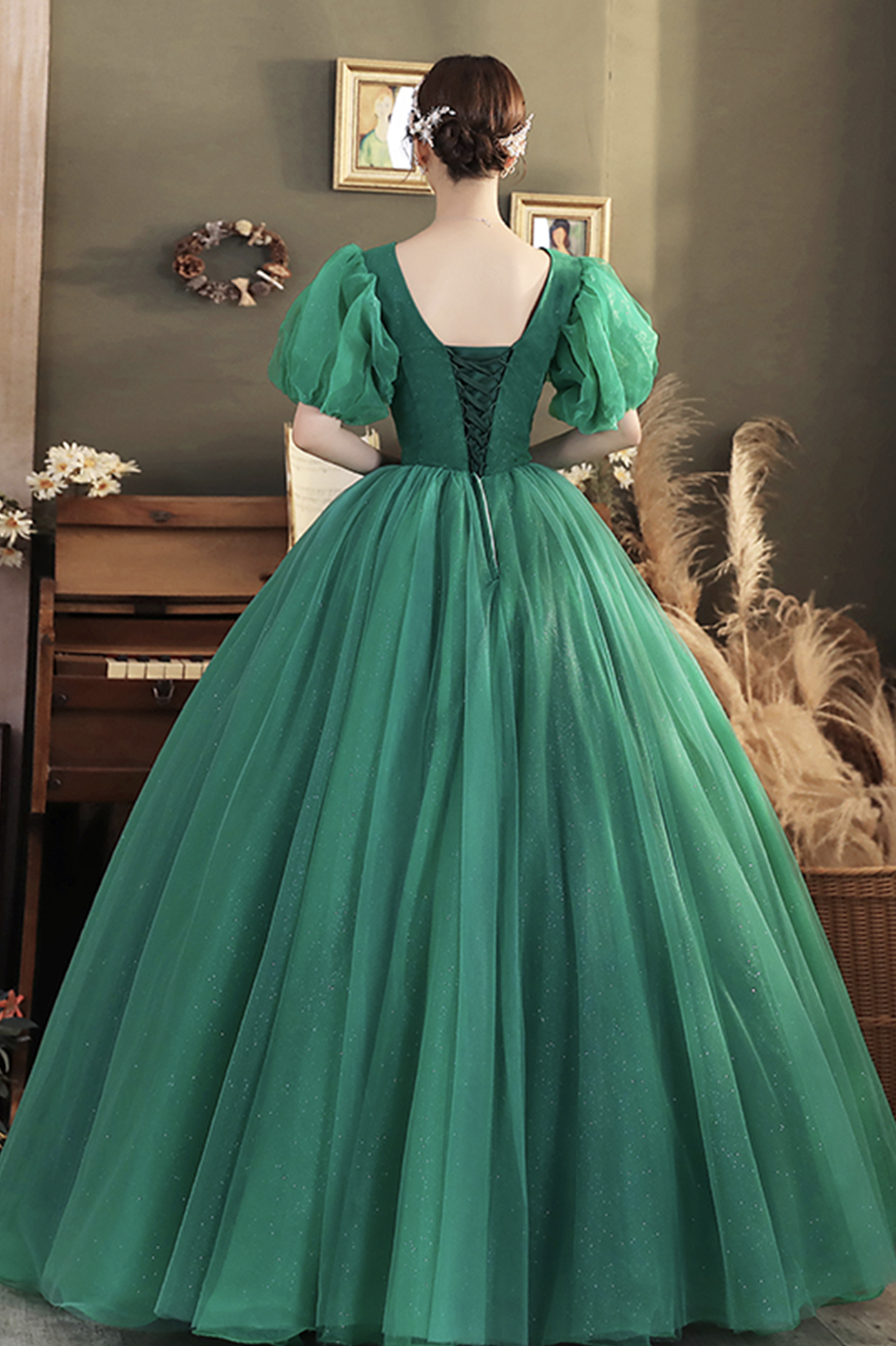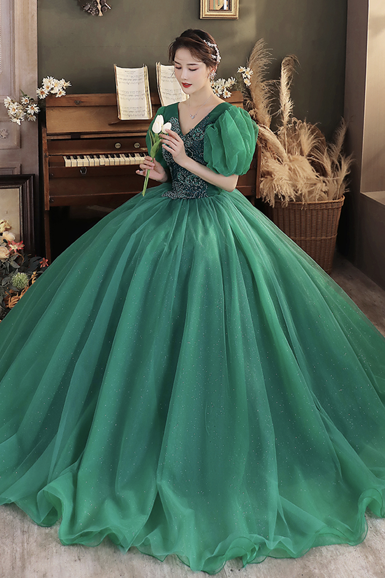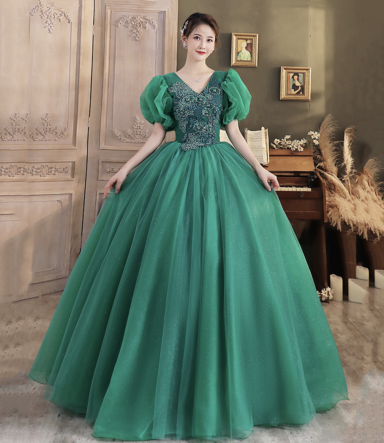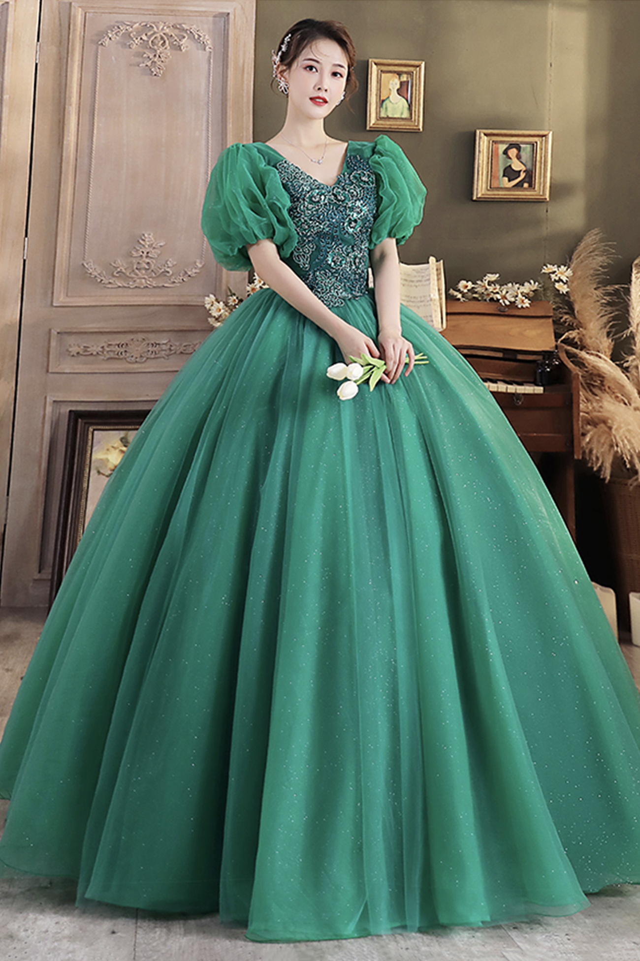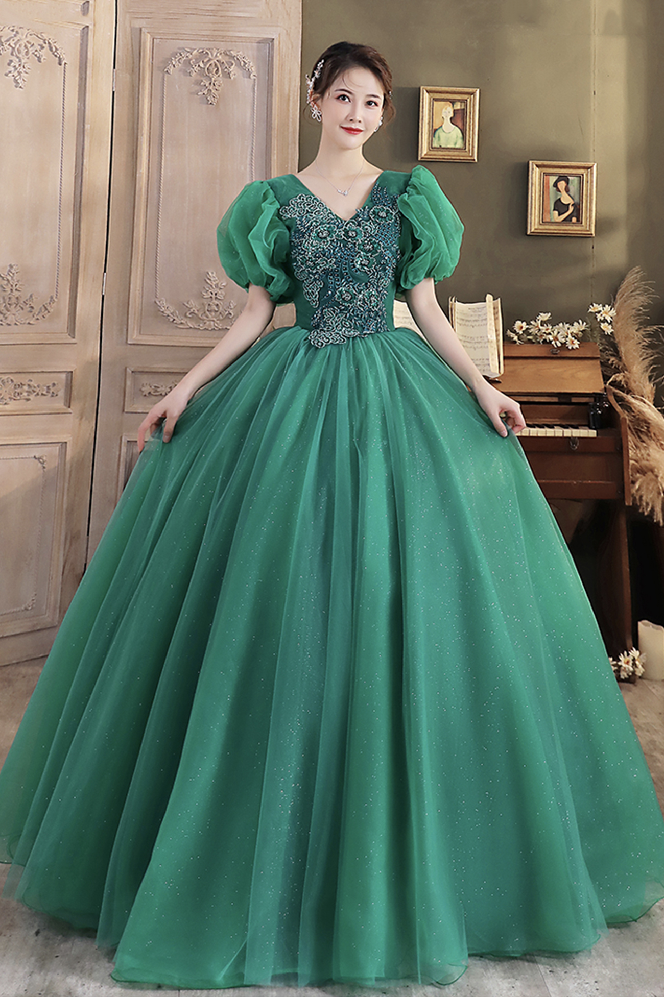 - Green v neck tulle long prom dress A line evening dress -