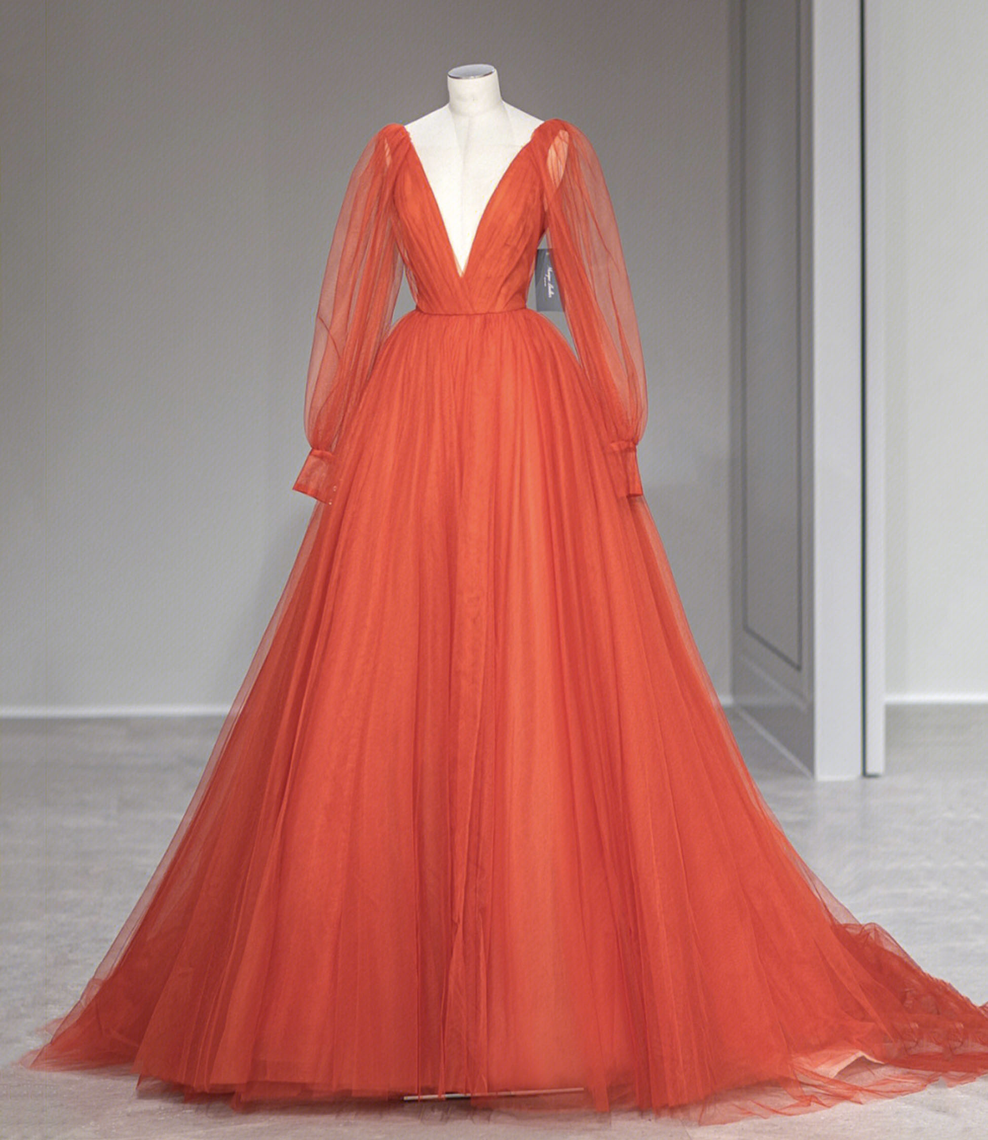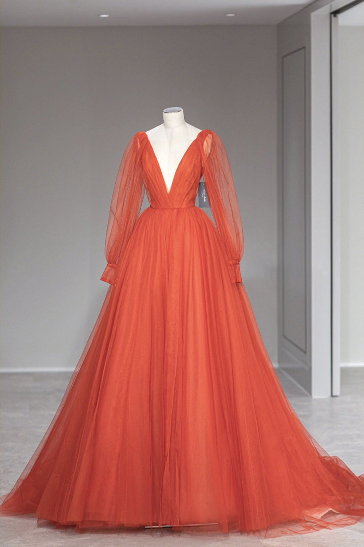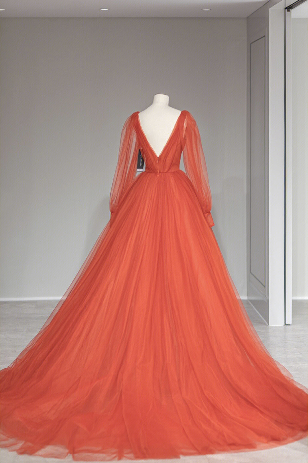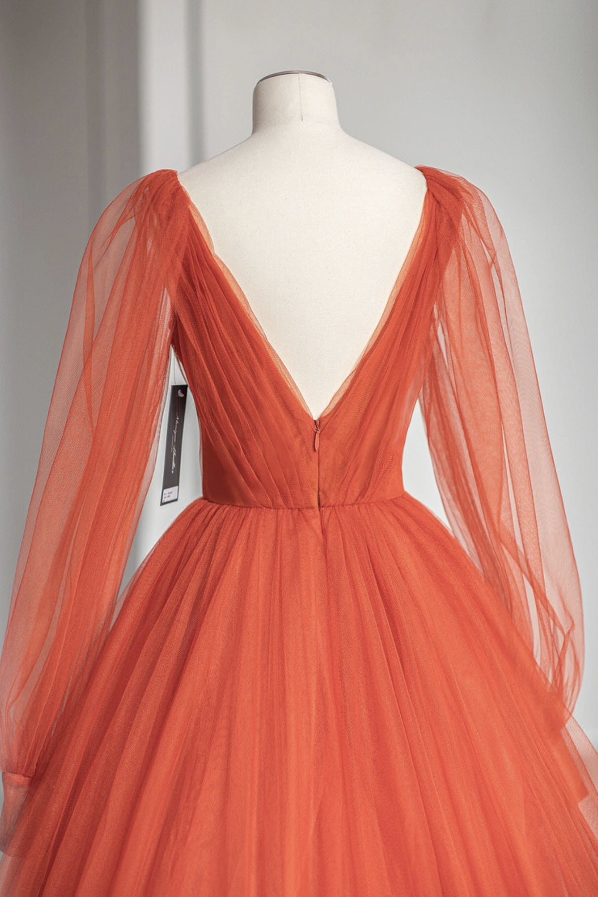 - A-line Tulle Long Sleeve Prom Dress Elegant Evening Dress -