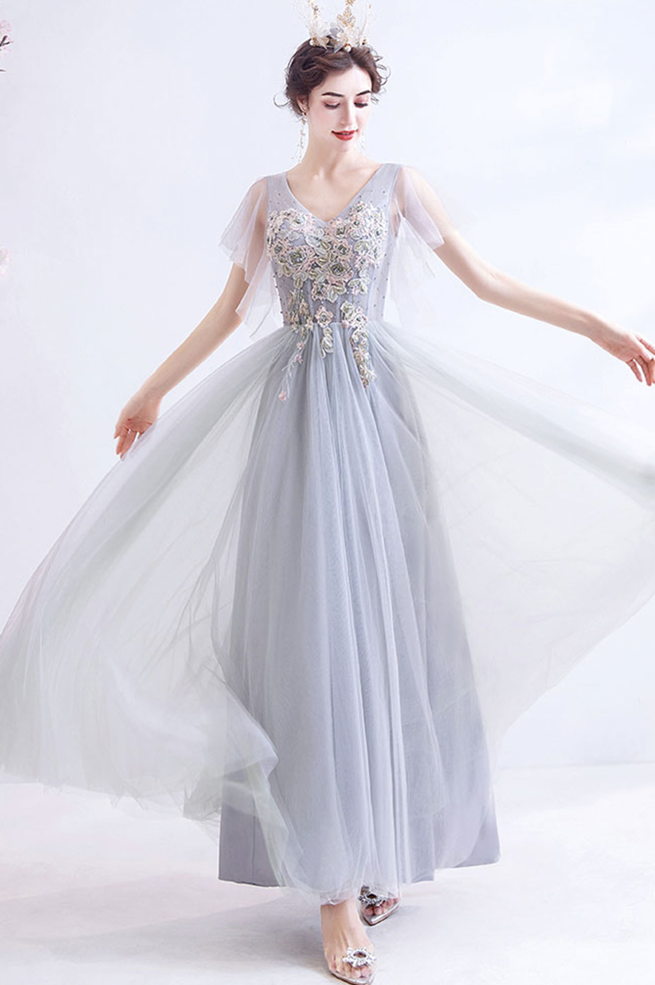 Gray V-neck lace long prom dress A-line evening dress