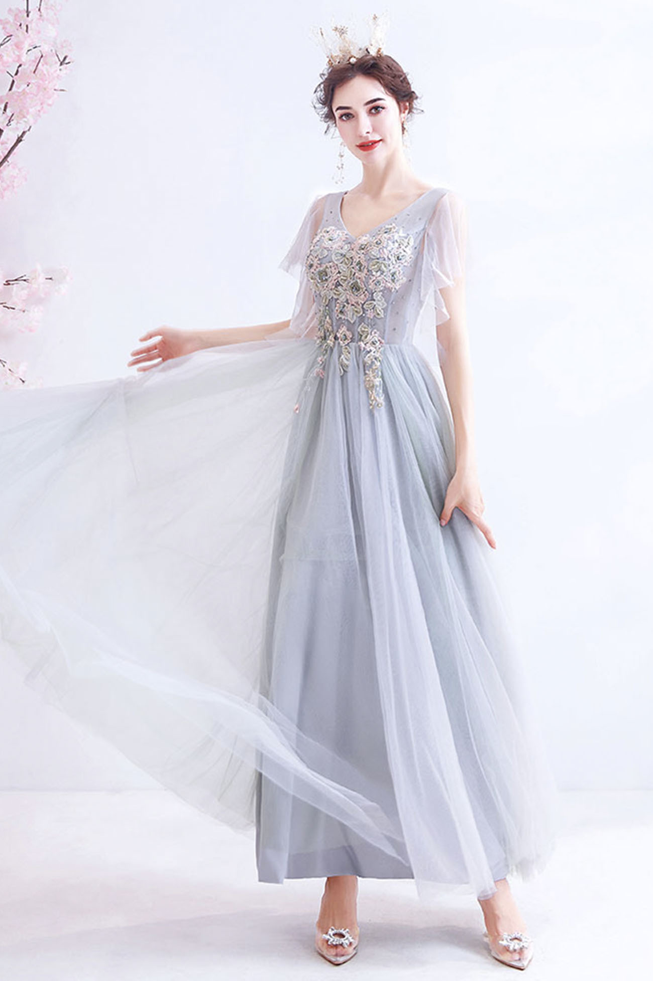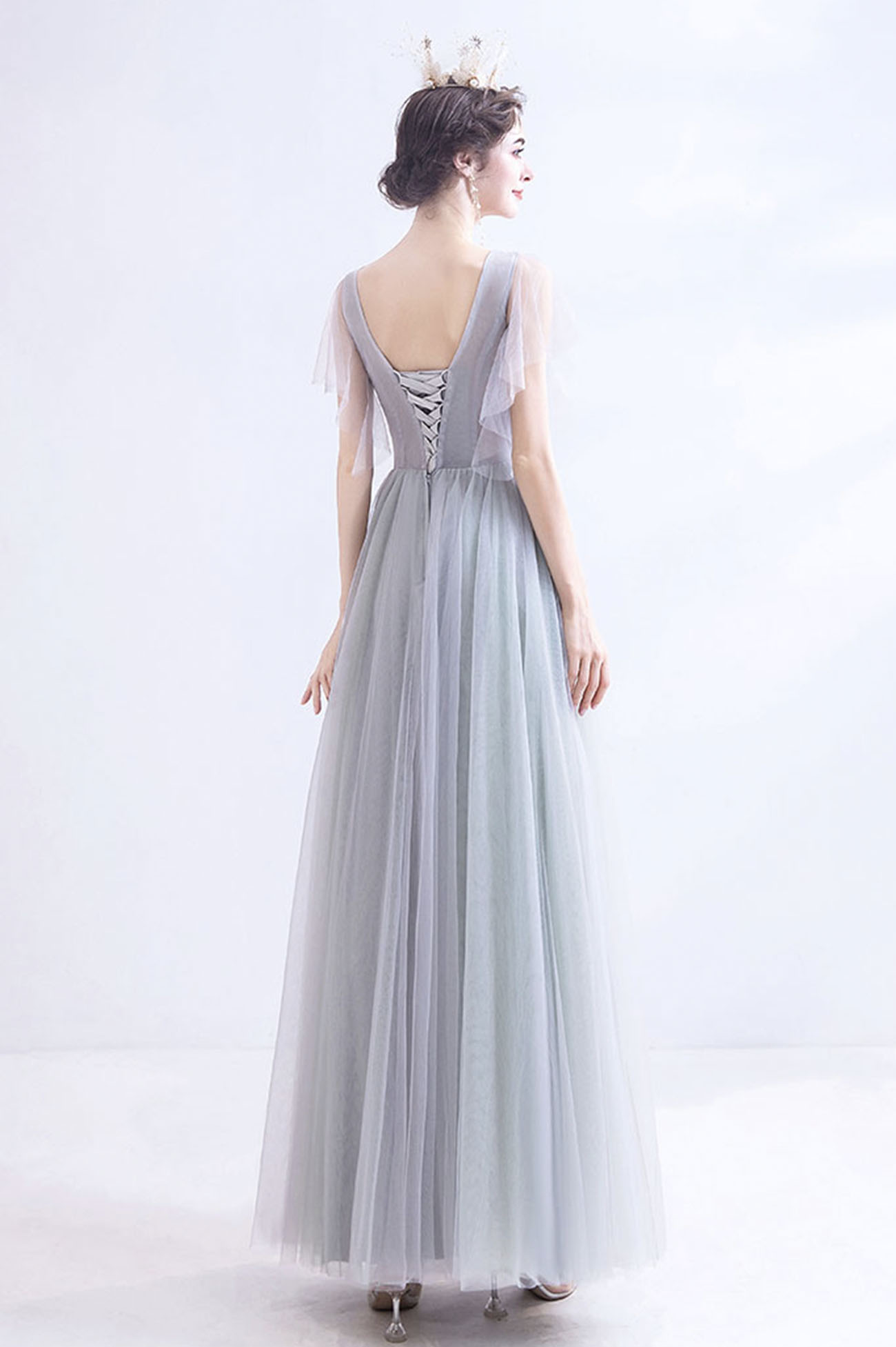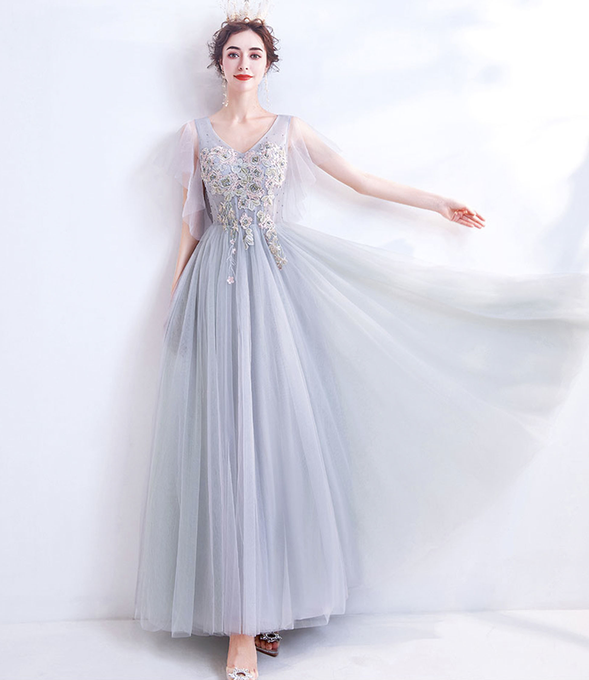- Gray V-neck lace long prom dress A-line evening dress -