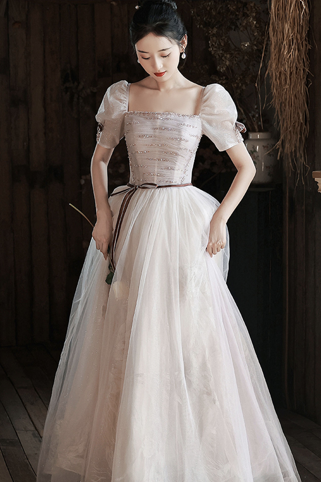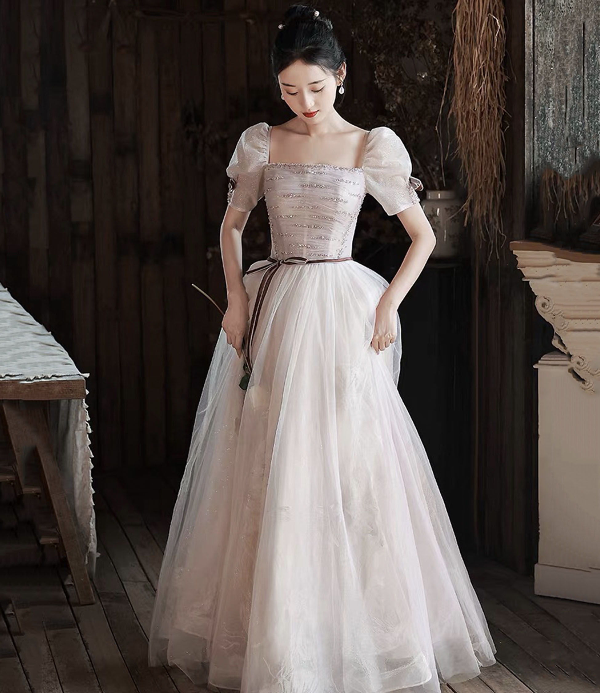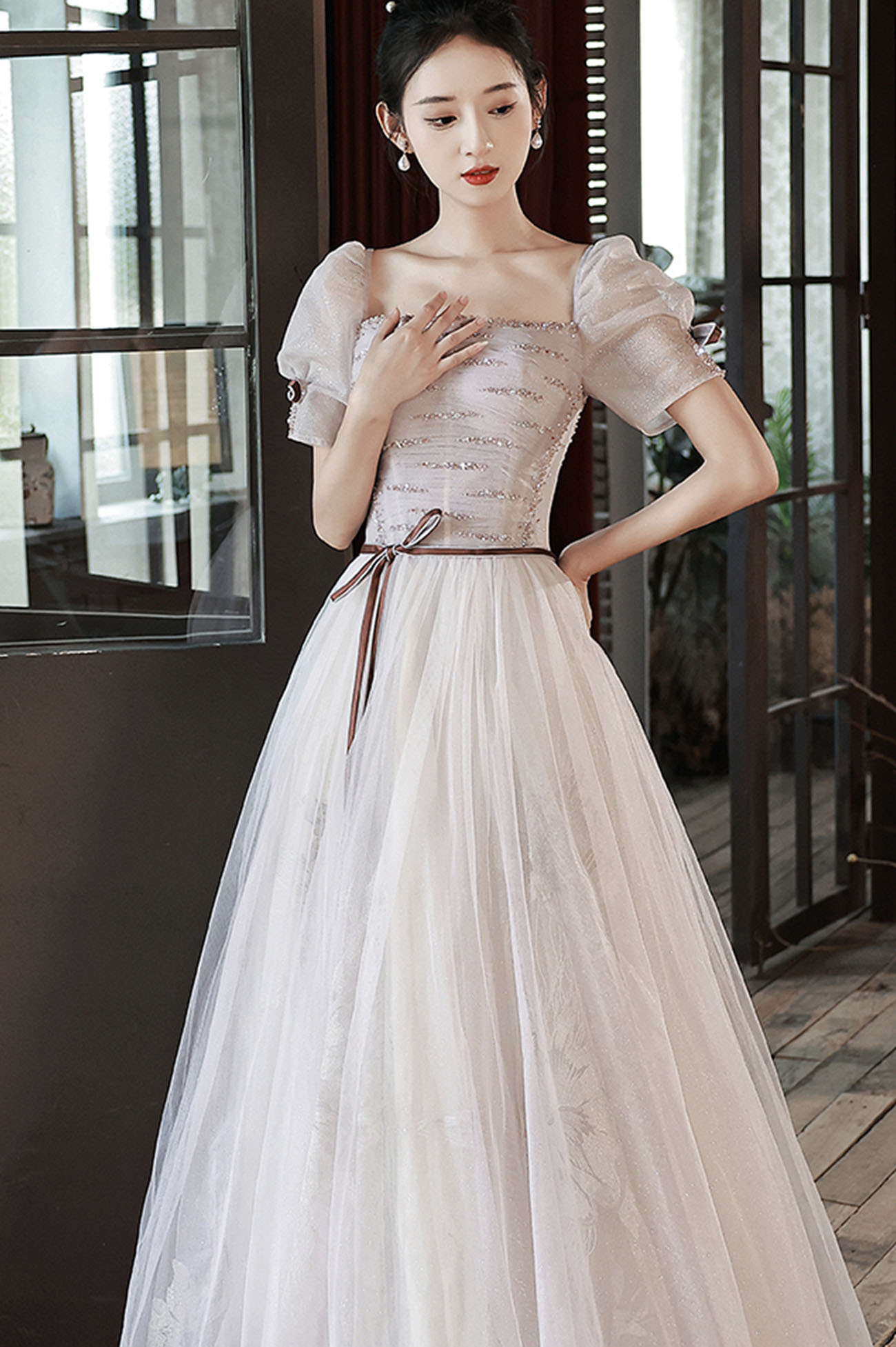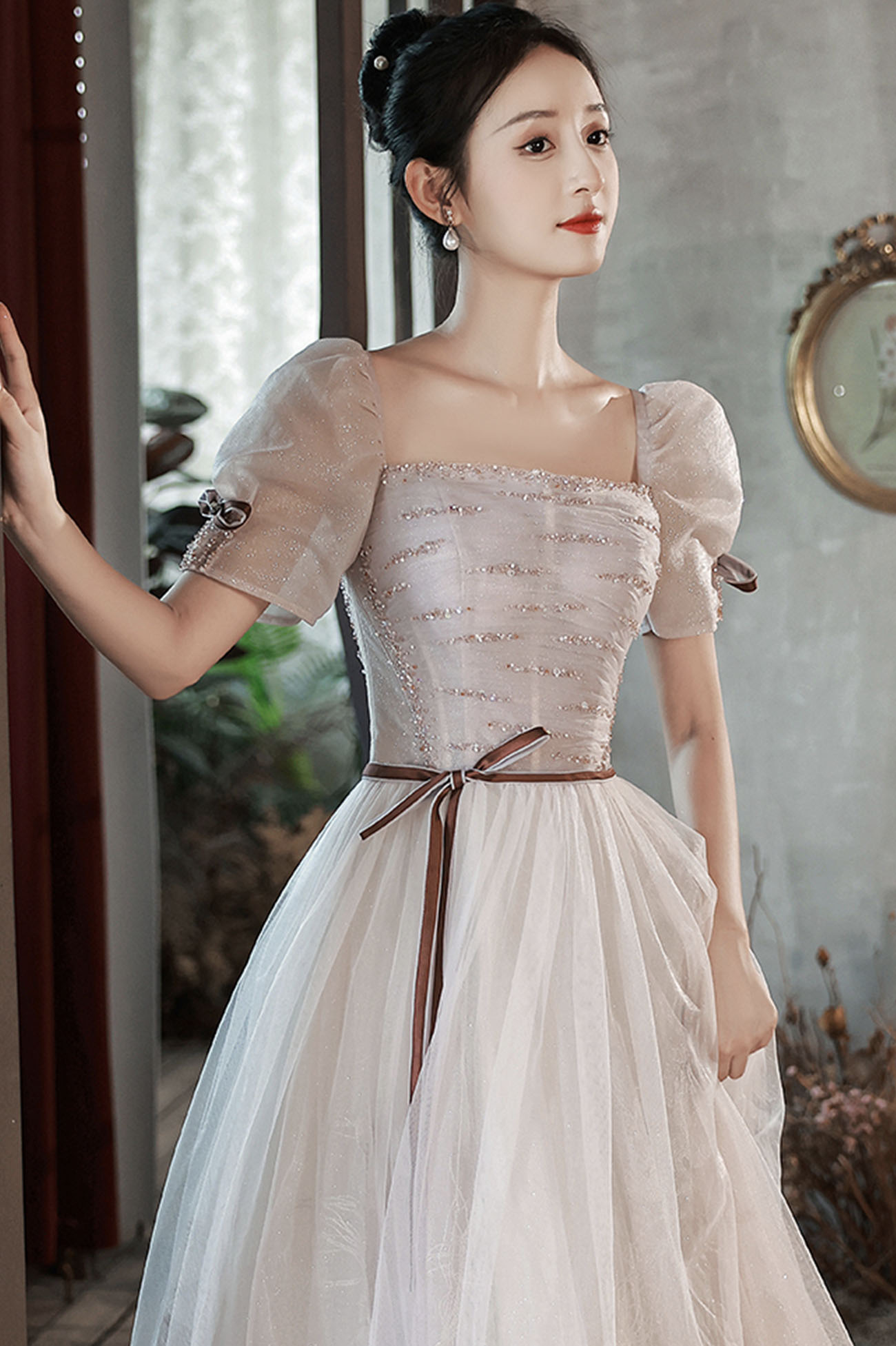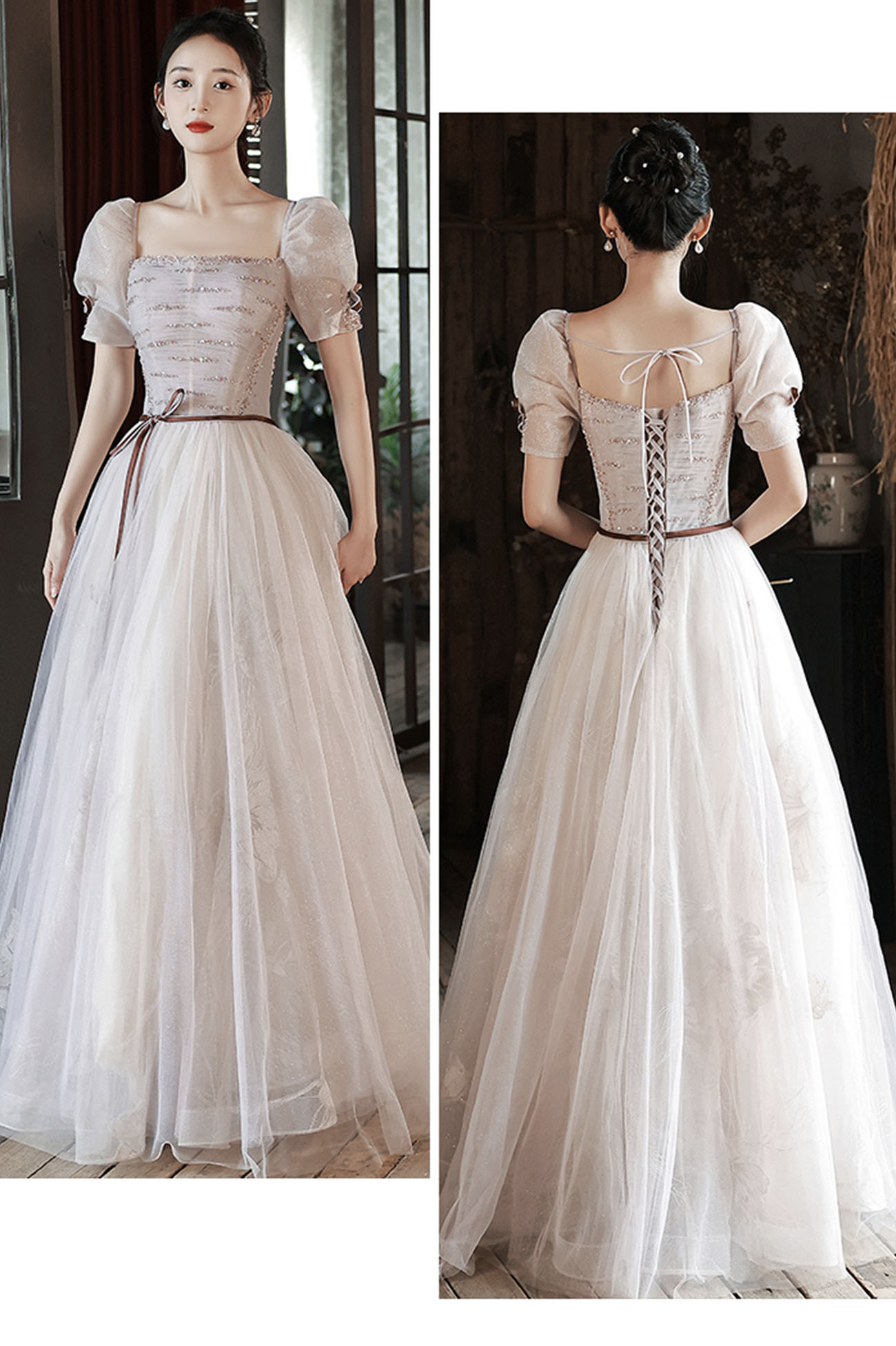 - Cute tulle sequins long prom dress A-line evening dress -