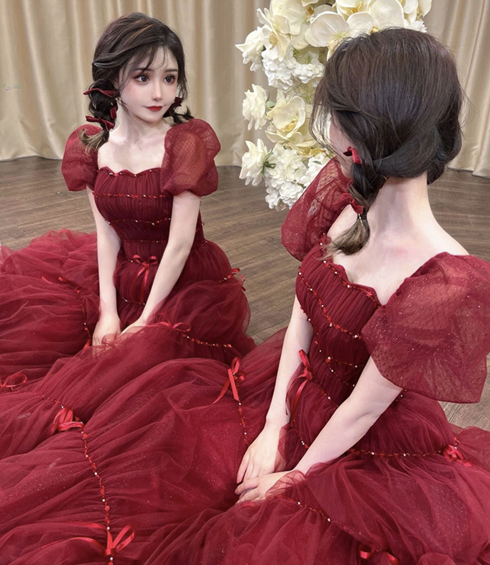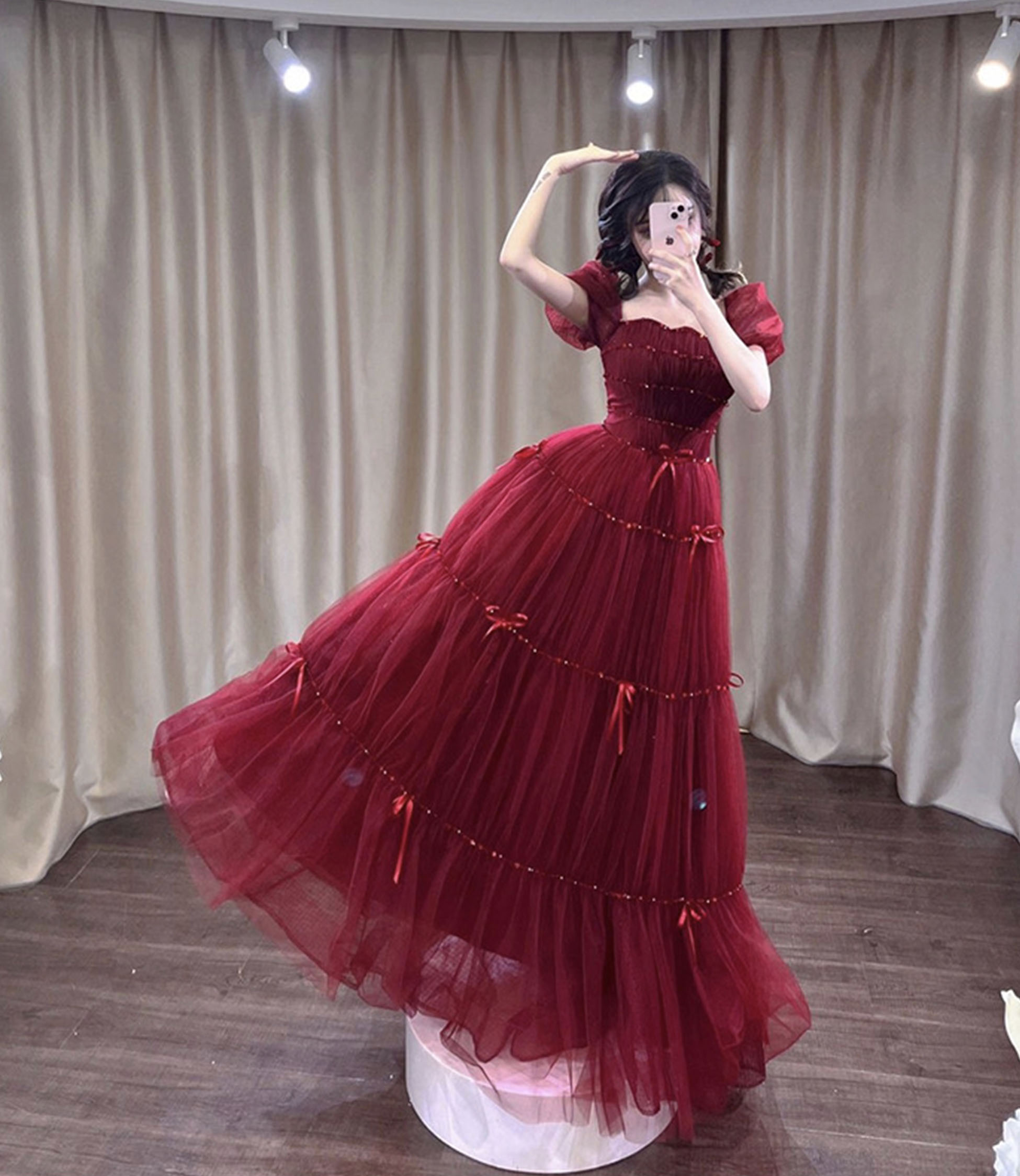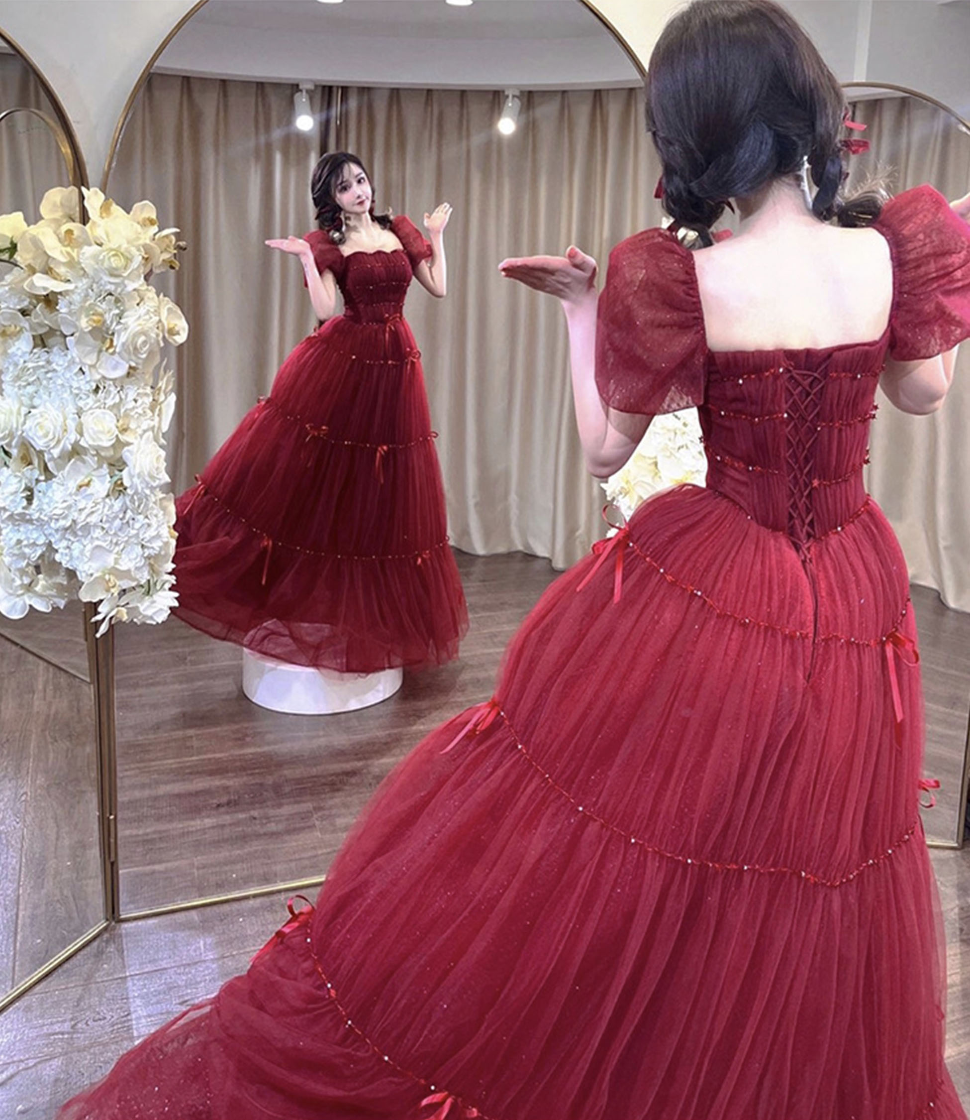 - Burgundy tulle sequins long prom dress A-line evening dress -