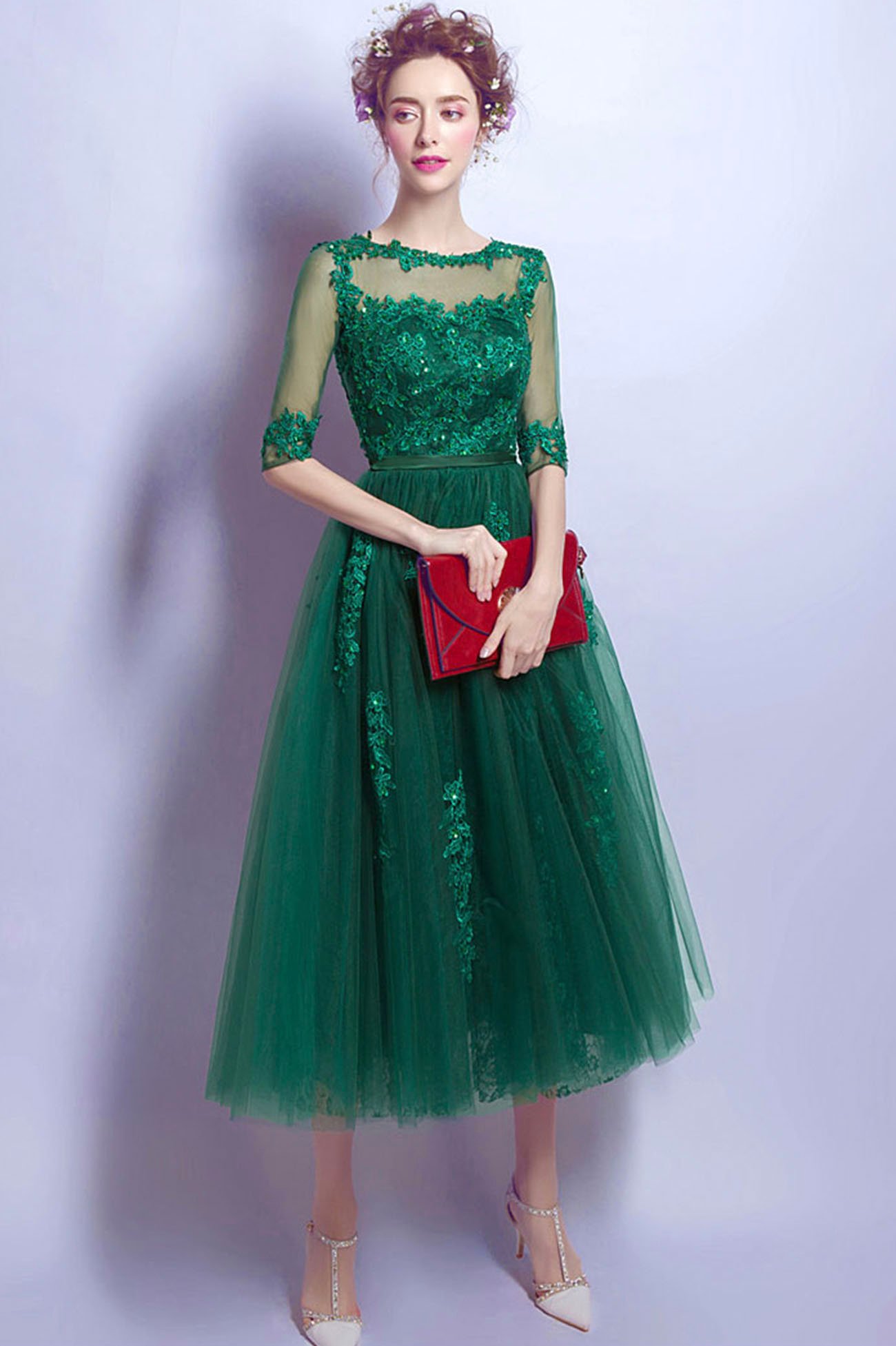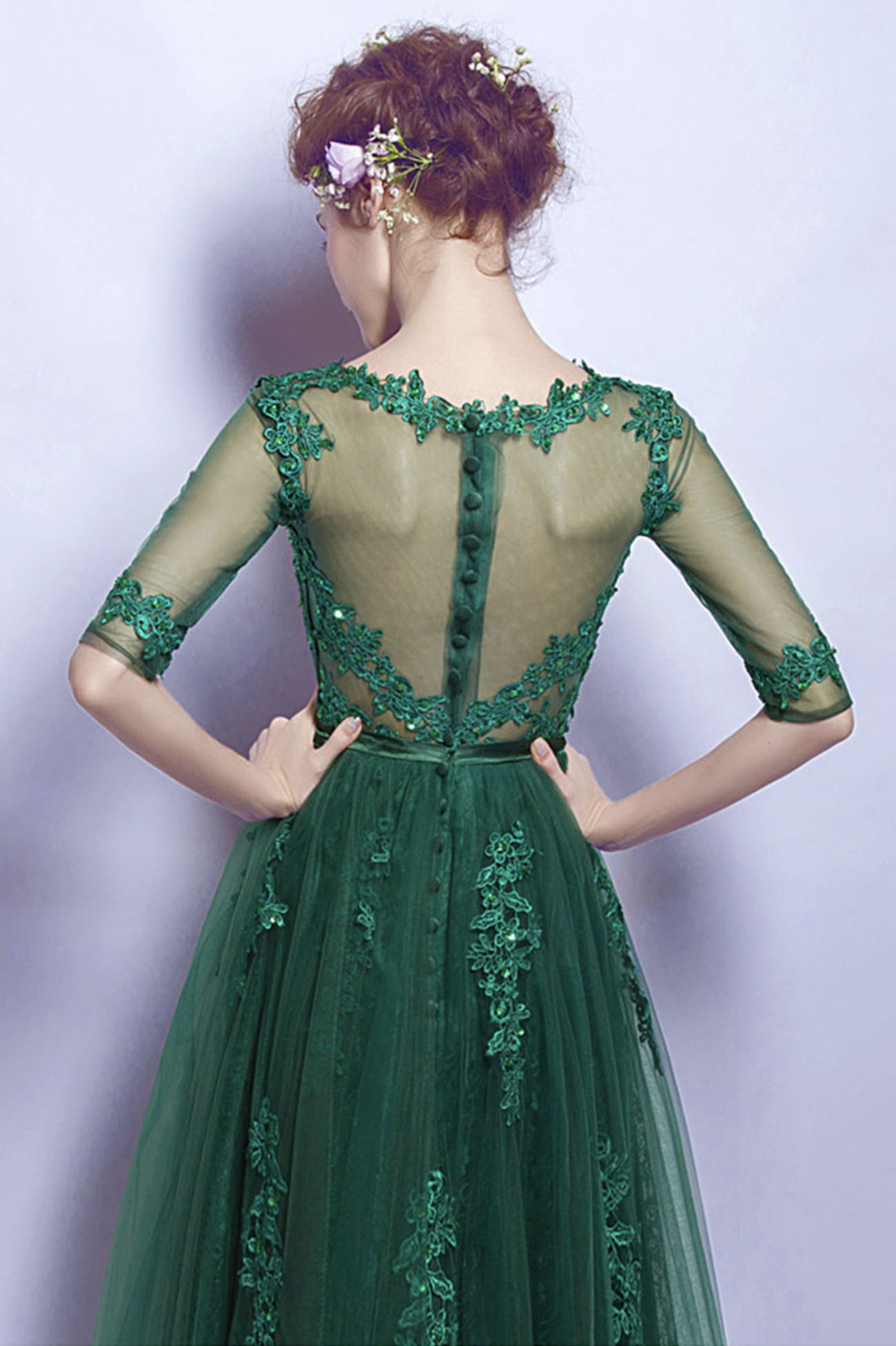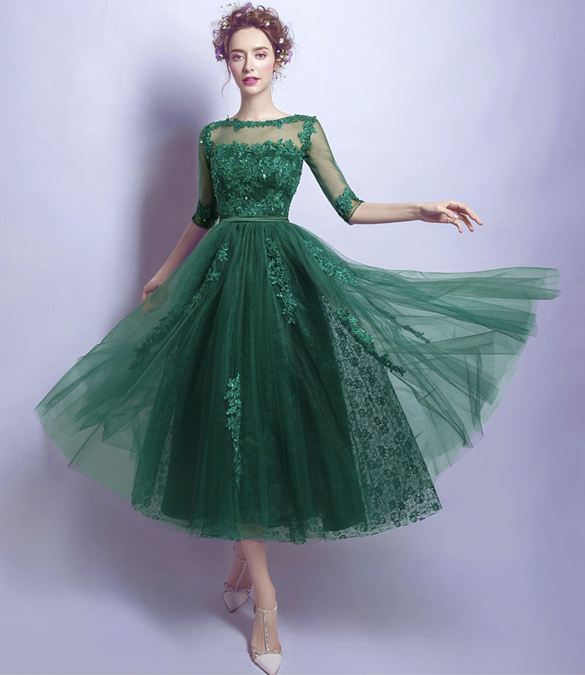 - Green tulle lace short prom dress homecoming dress -