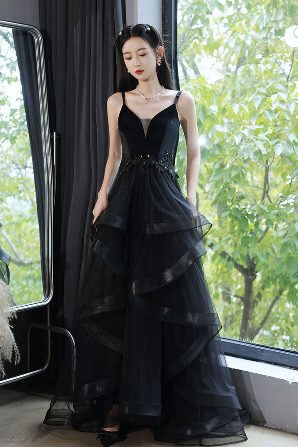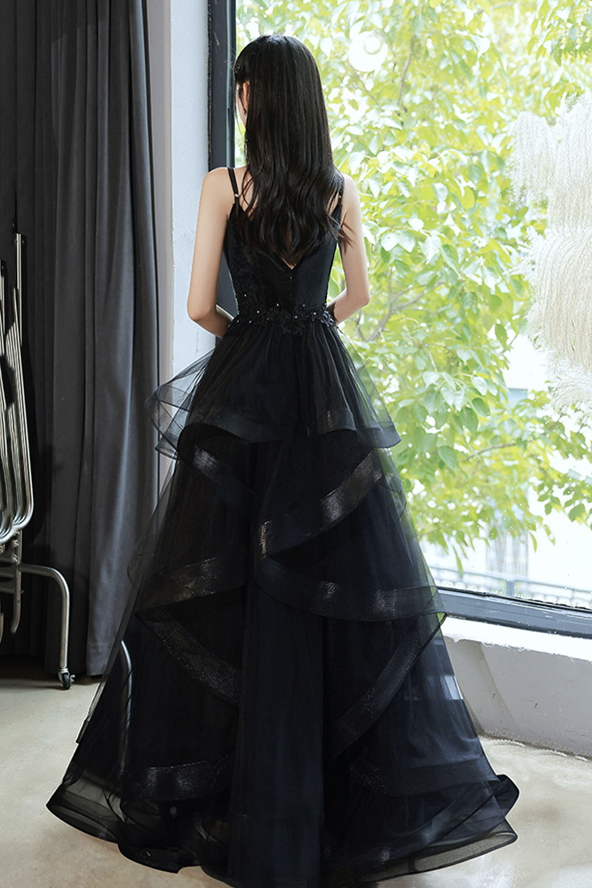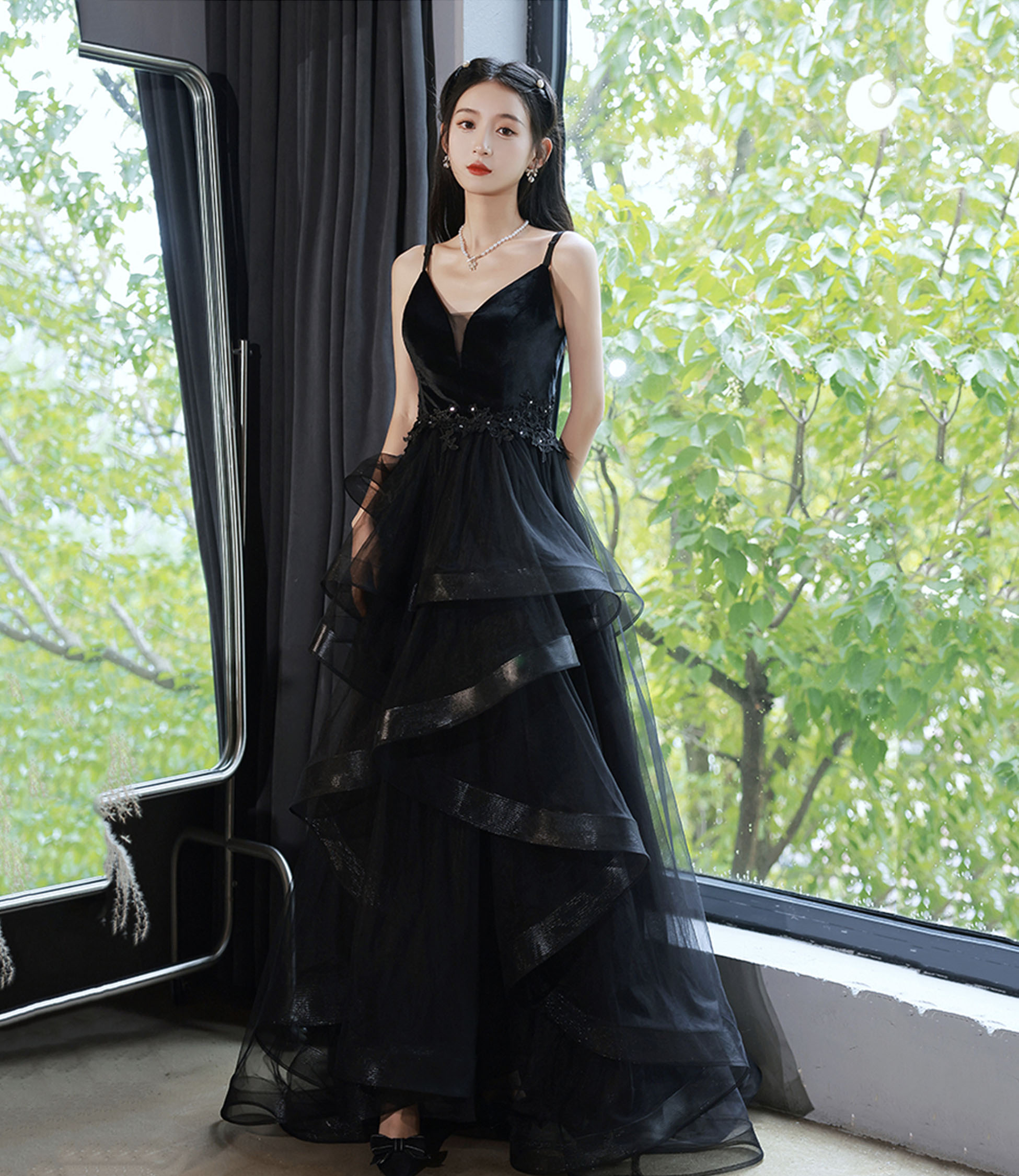 - Black V-neck tulle long prom dress A-line evening dress -