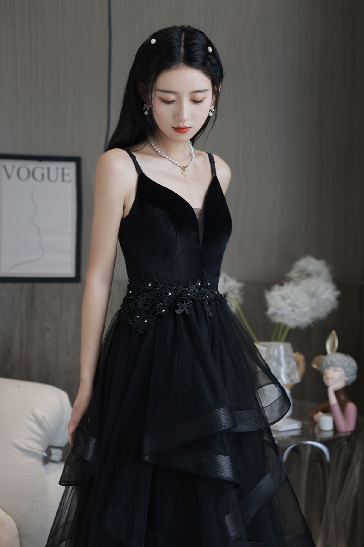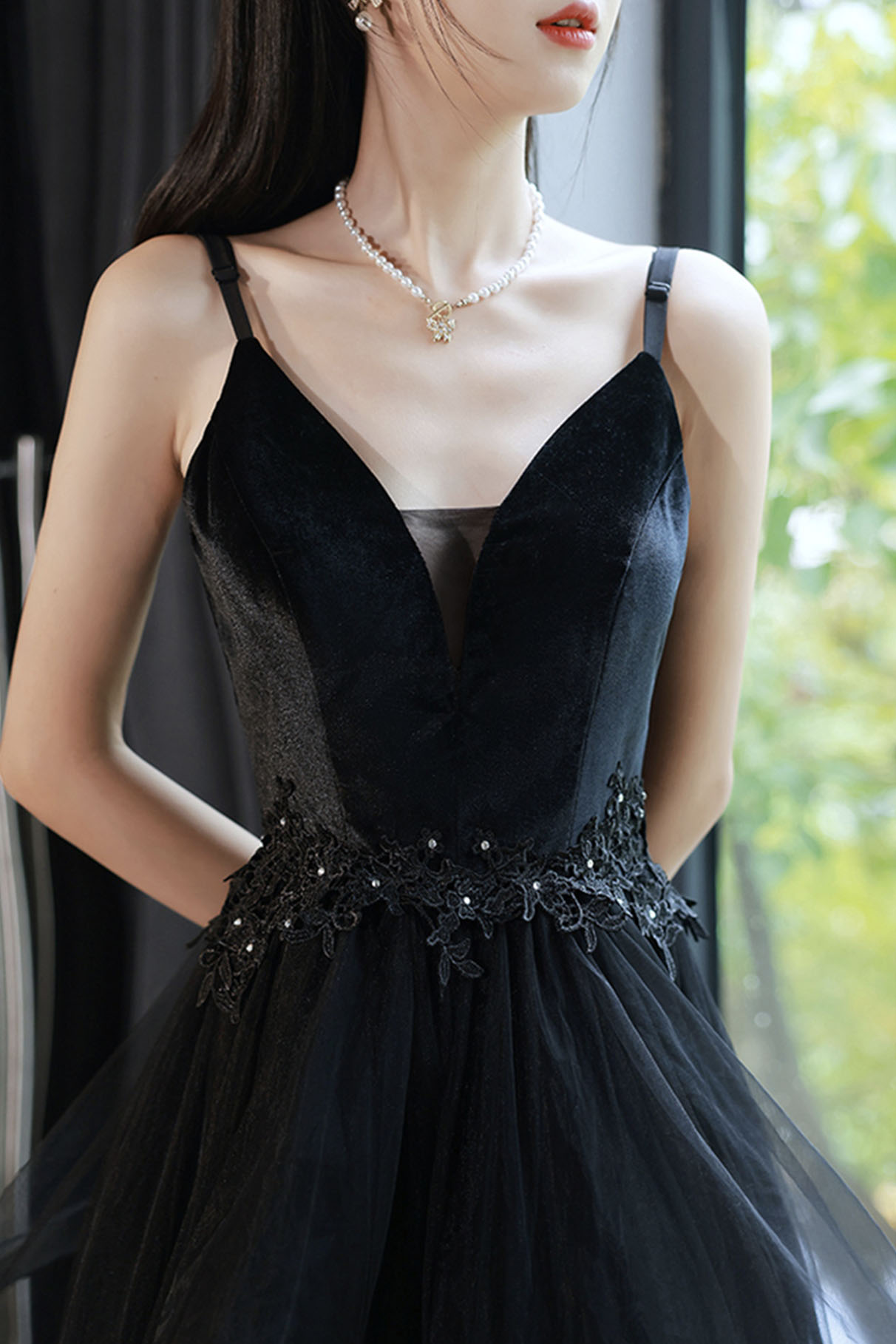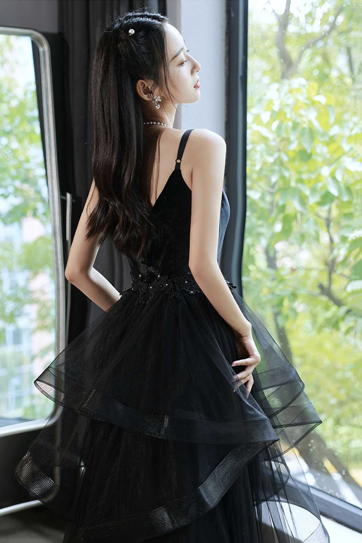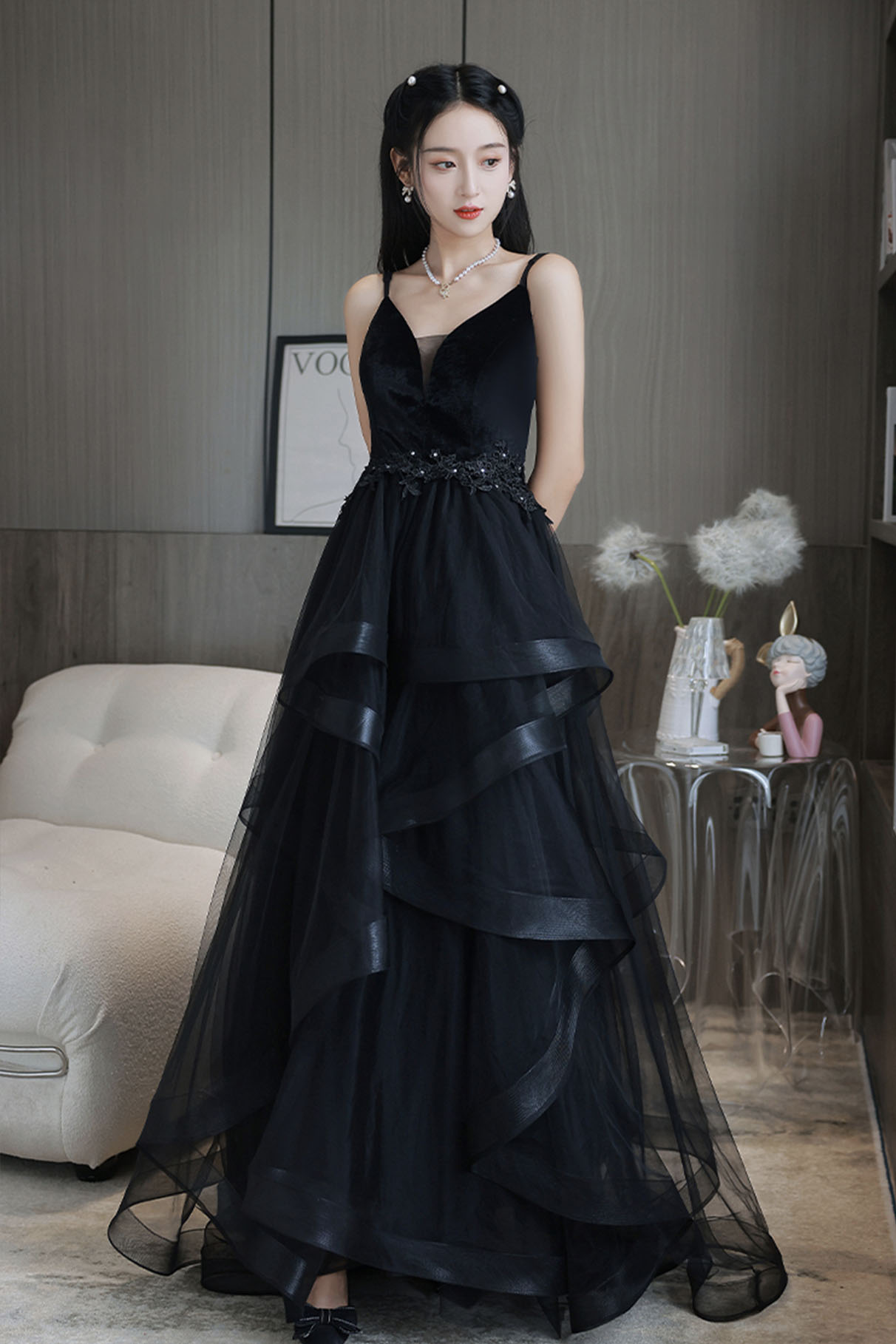 - Black V-neck tulle long prom dress A-line evening dress -