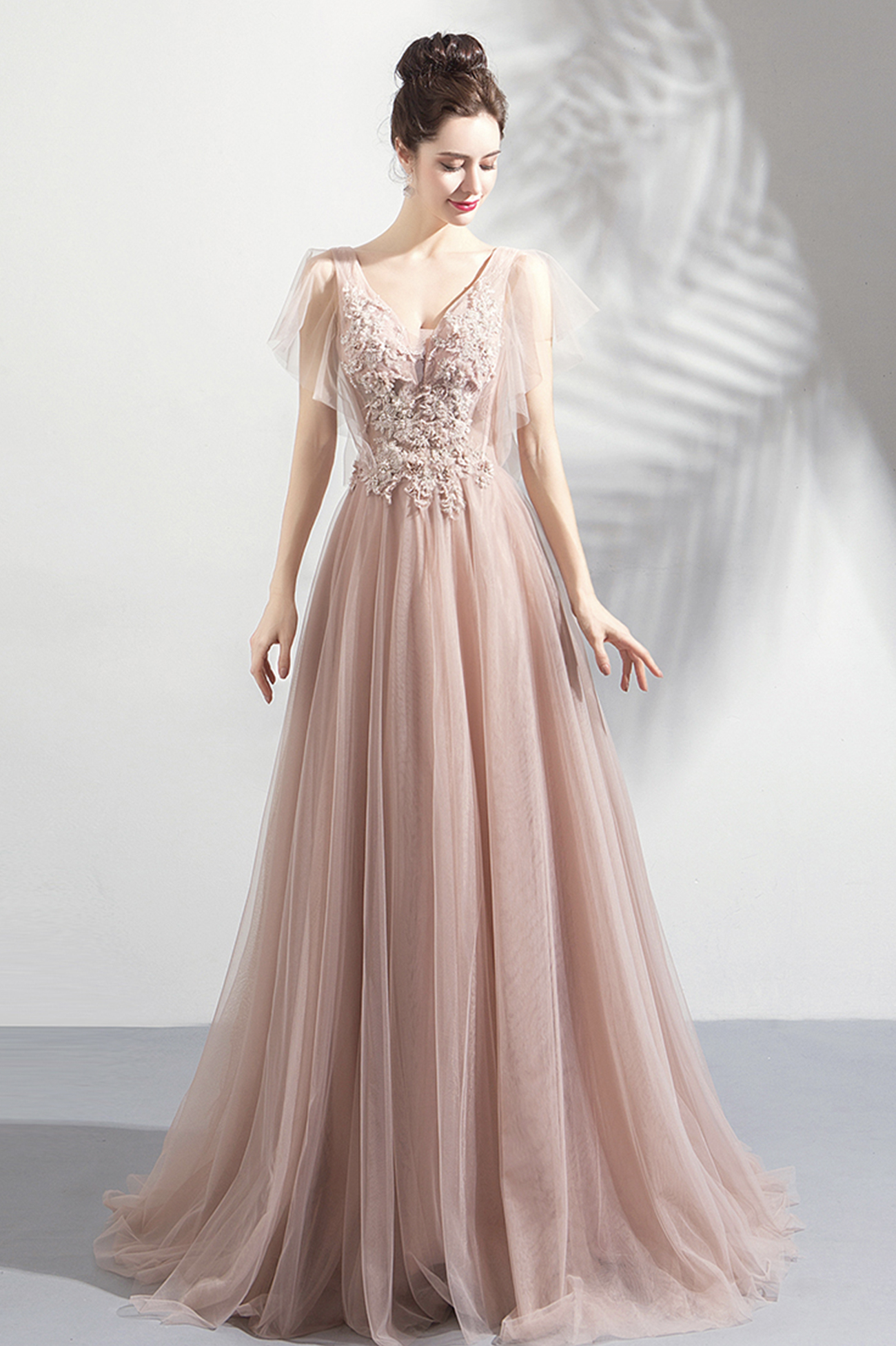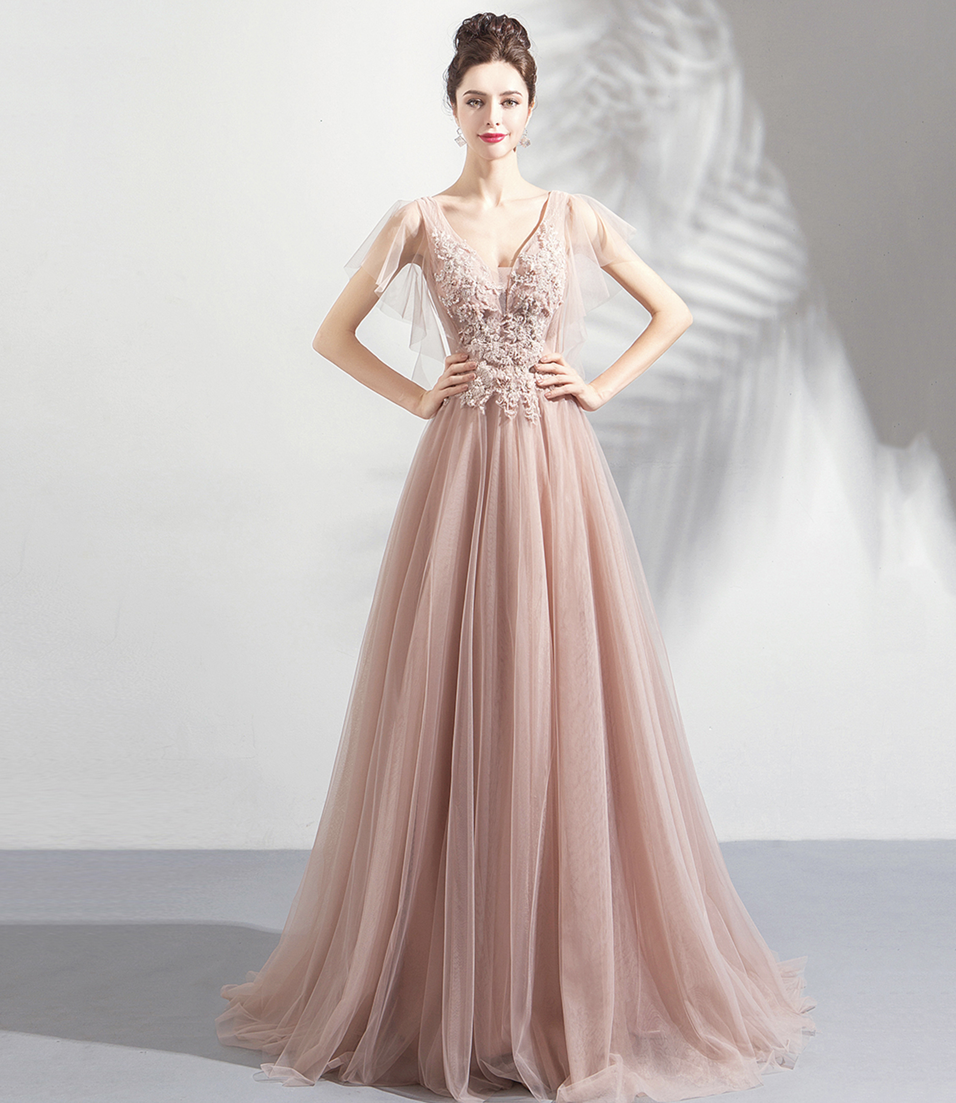 - Pink V-neck tulle lace long prom dress A-line evening dress -