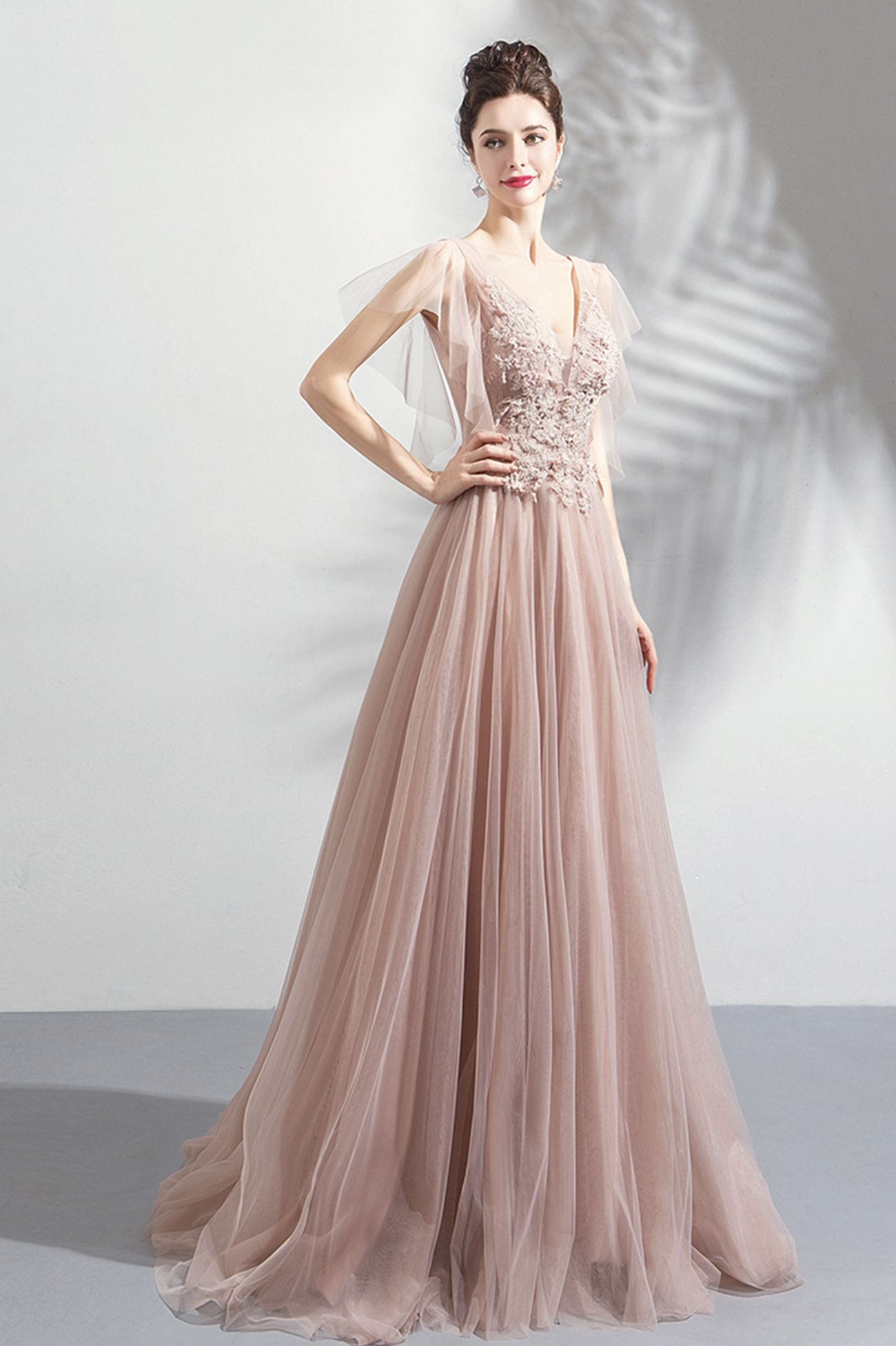 Pink V-neck tulle lace long prom dress A-line evening dress