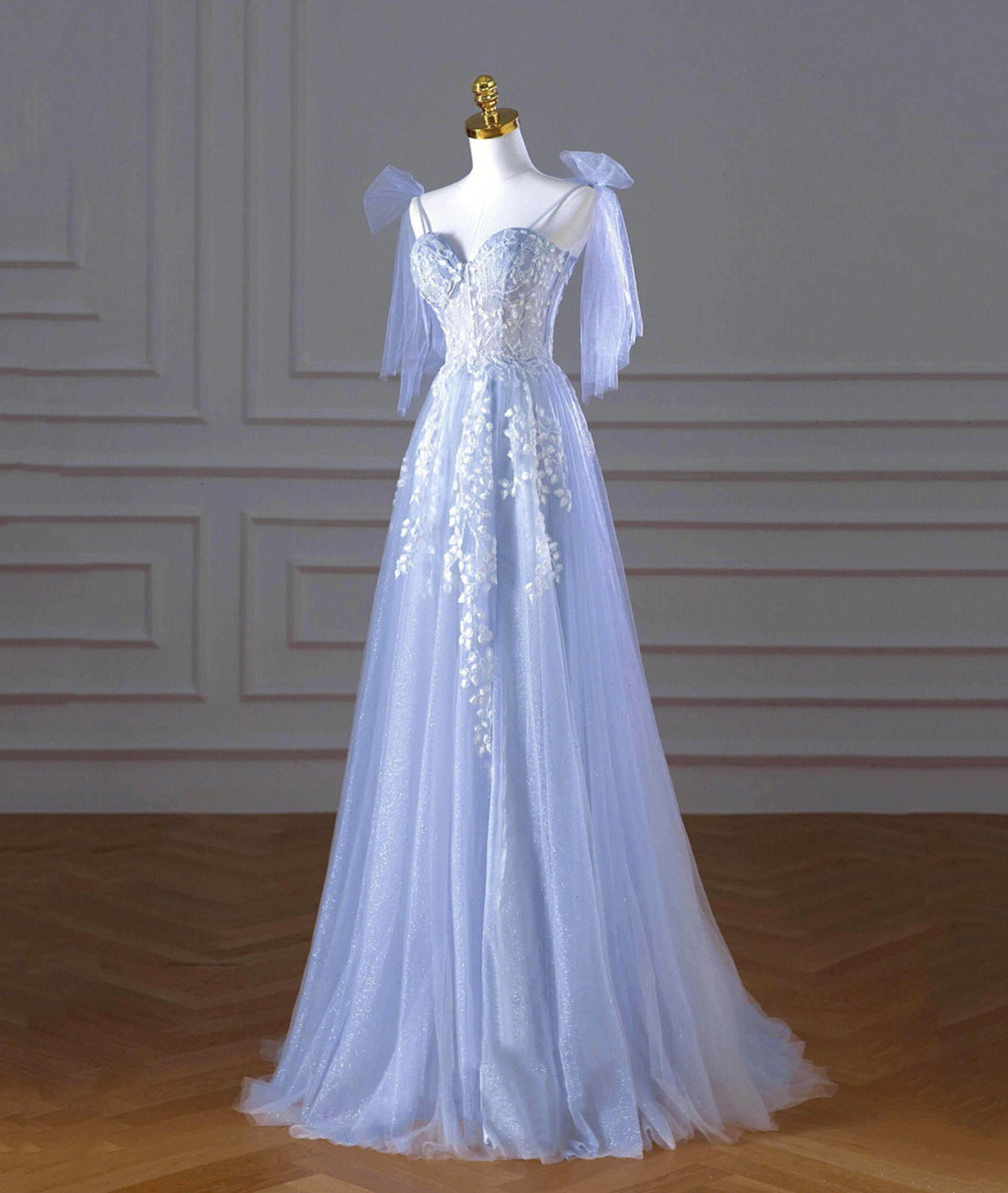- Blue Lace Long A Line Prom Dress -