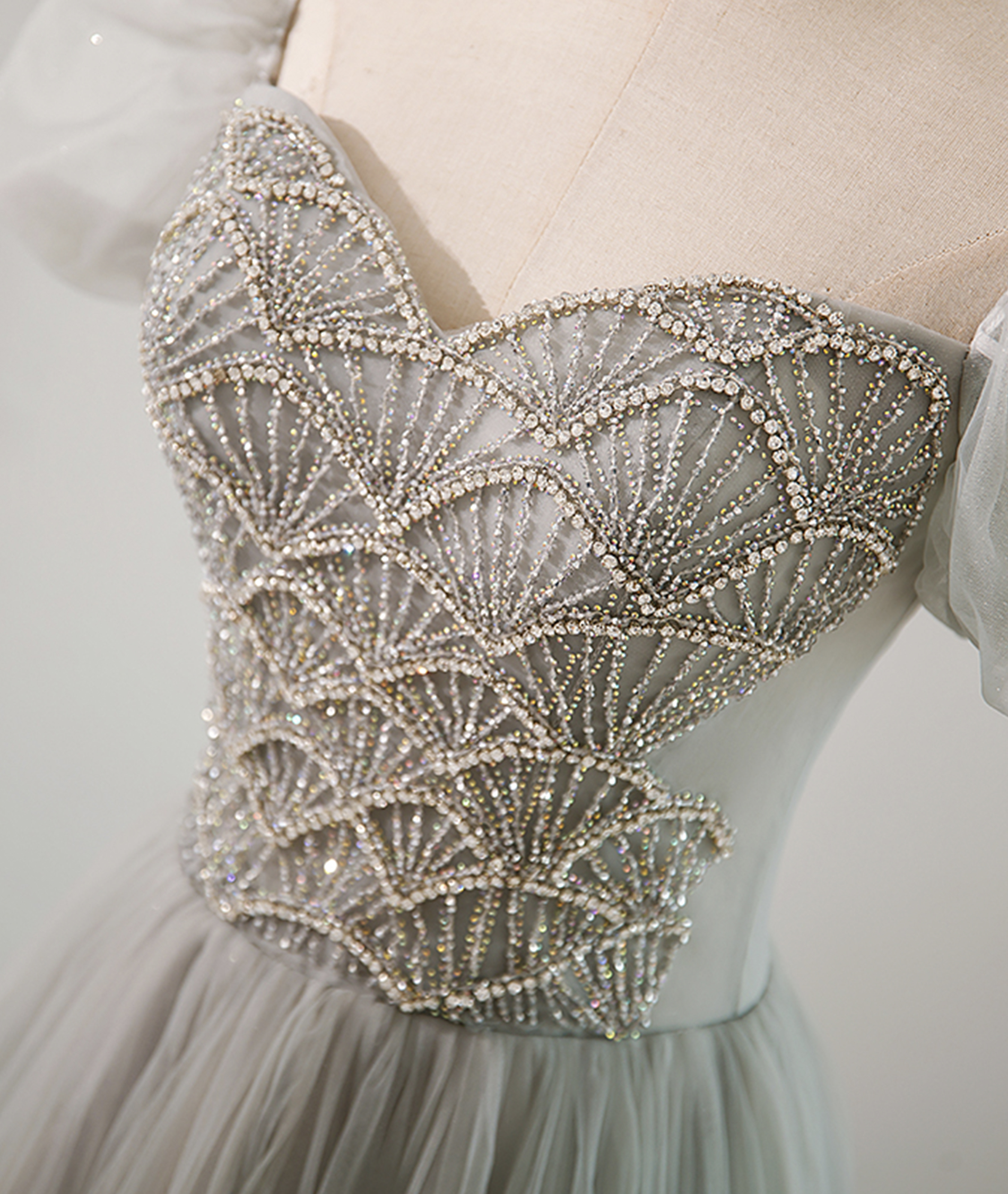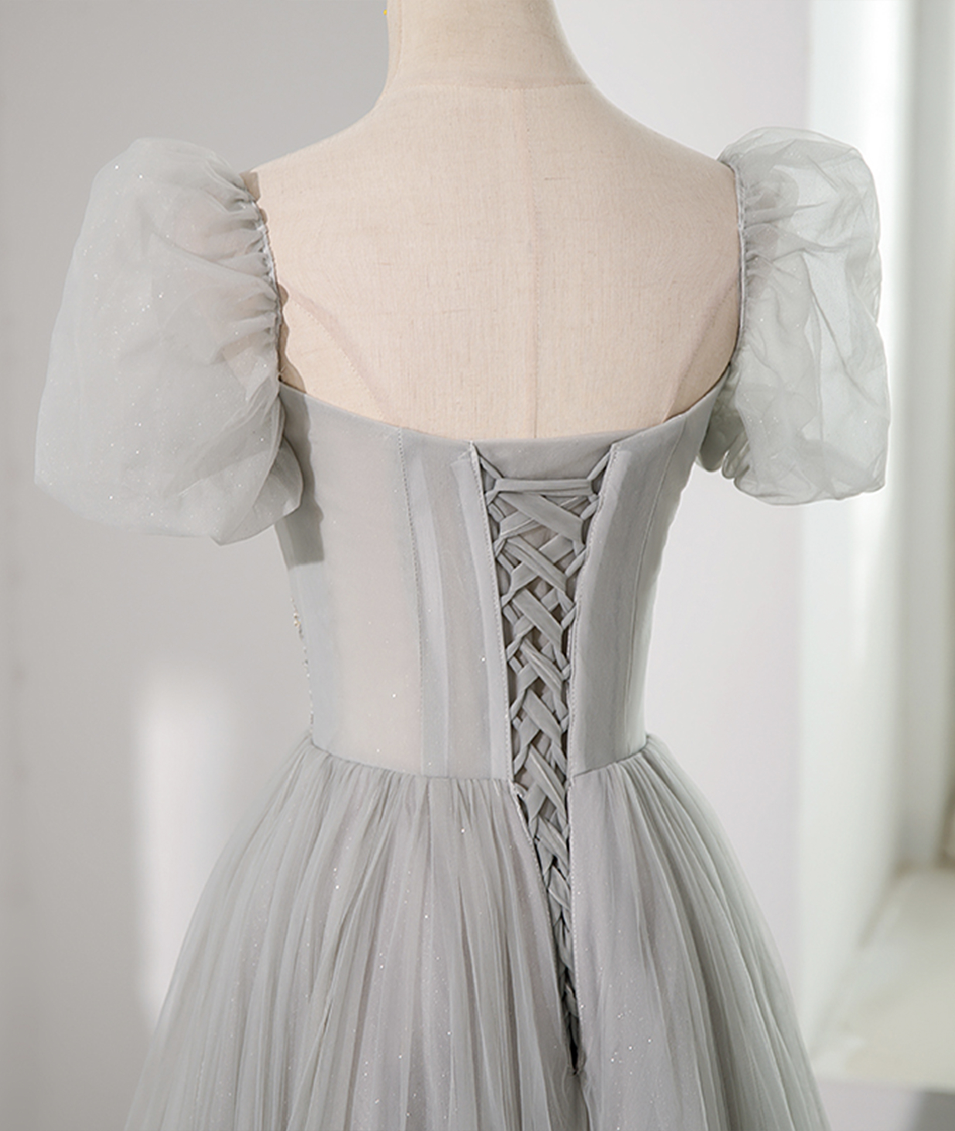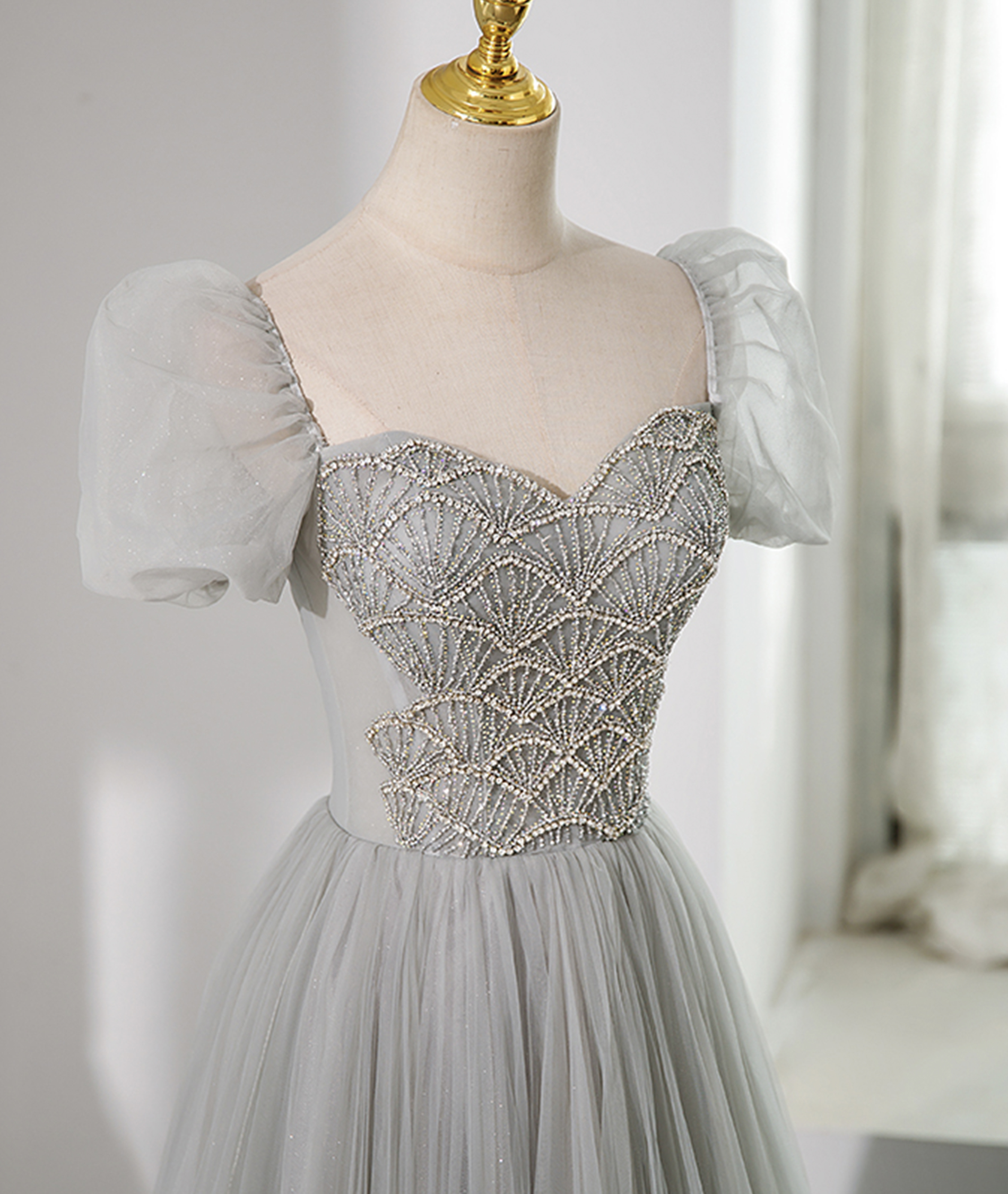 - Grey Tulle Beading Long Prom Dresses, A Line Evening Dresses -