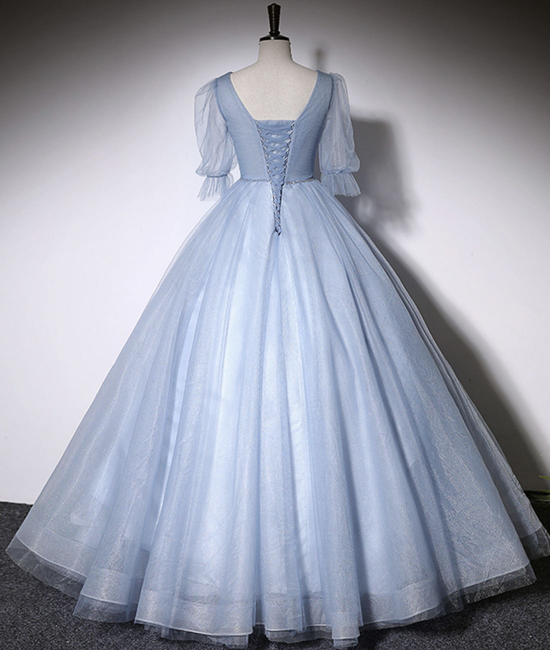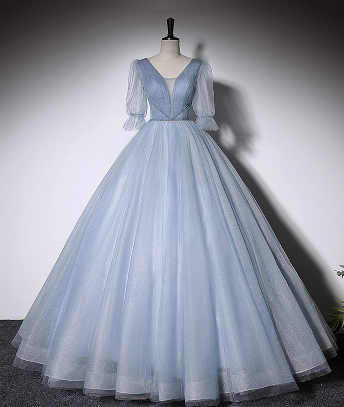 - Blue V-Neck Tulle Long Prom Dress, Blue Short Sleeve Evening Gown -
