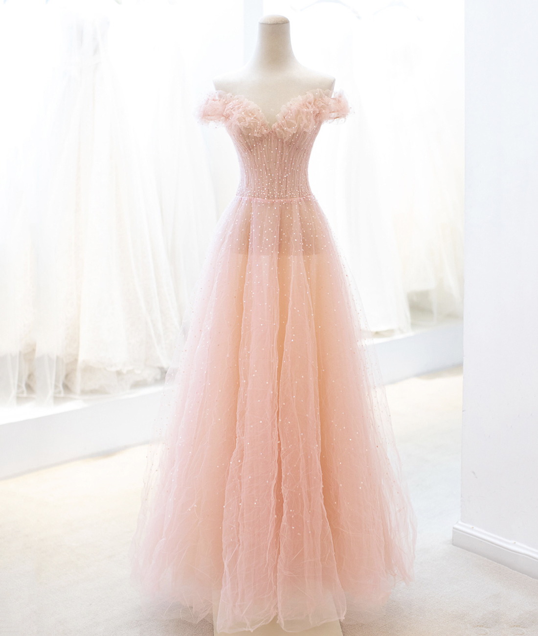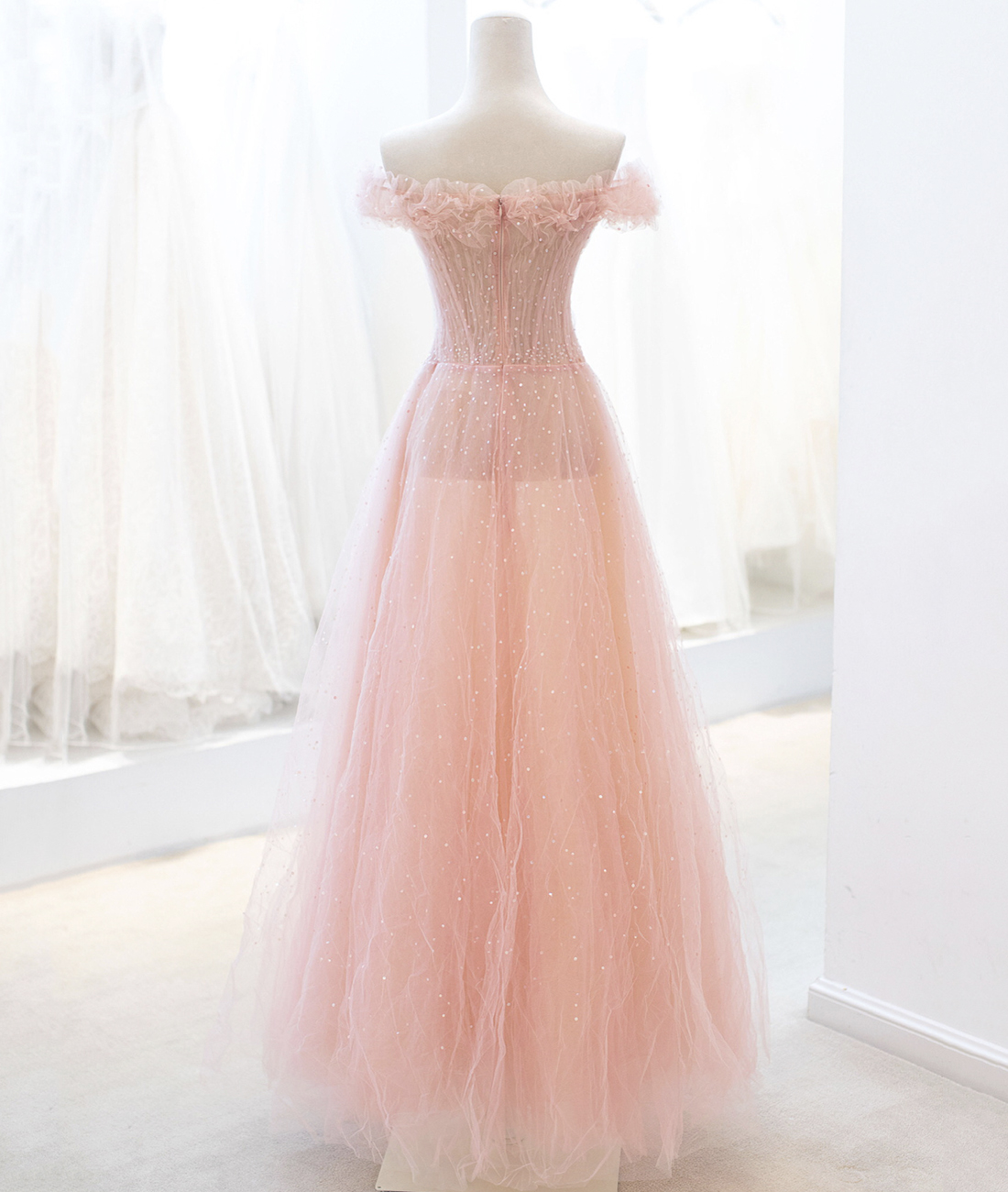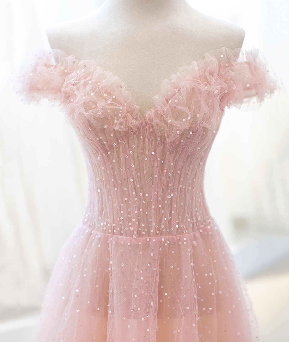 - Pink Tulle Sequins Long Prom Dress, A-Line Pink Evening Dress -