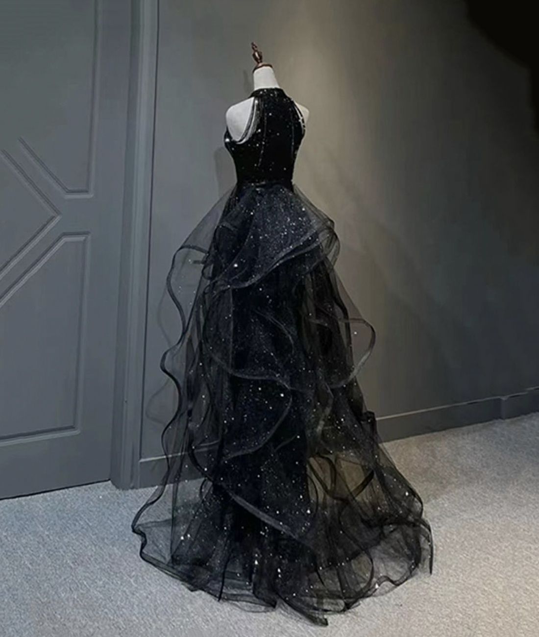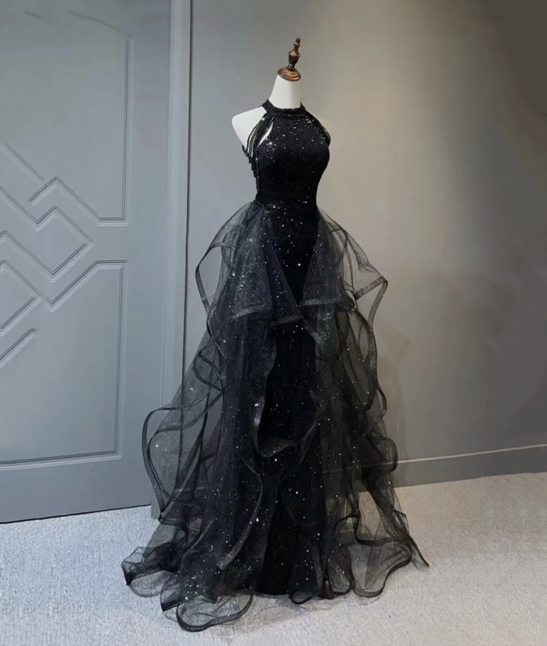 - Black Halter Shiny Tulle Long Prom Dress, Black Tulle Evening Dress with Sequins -