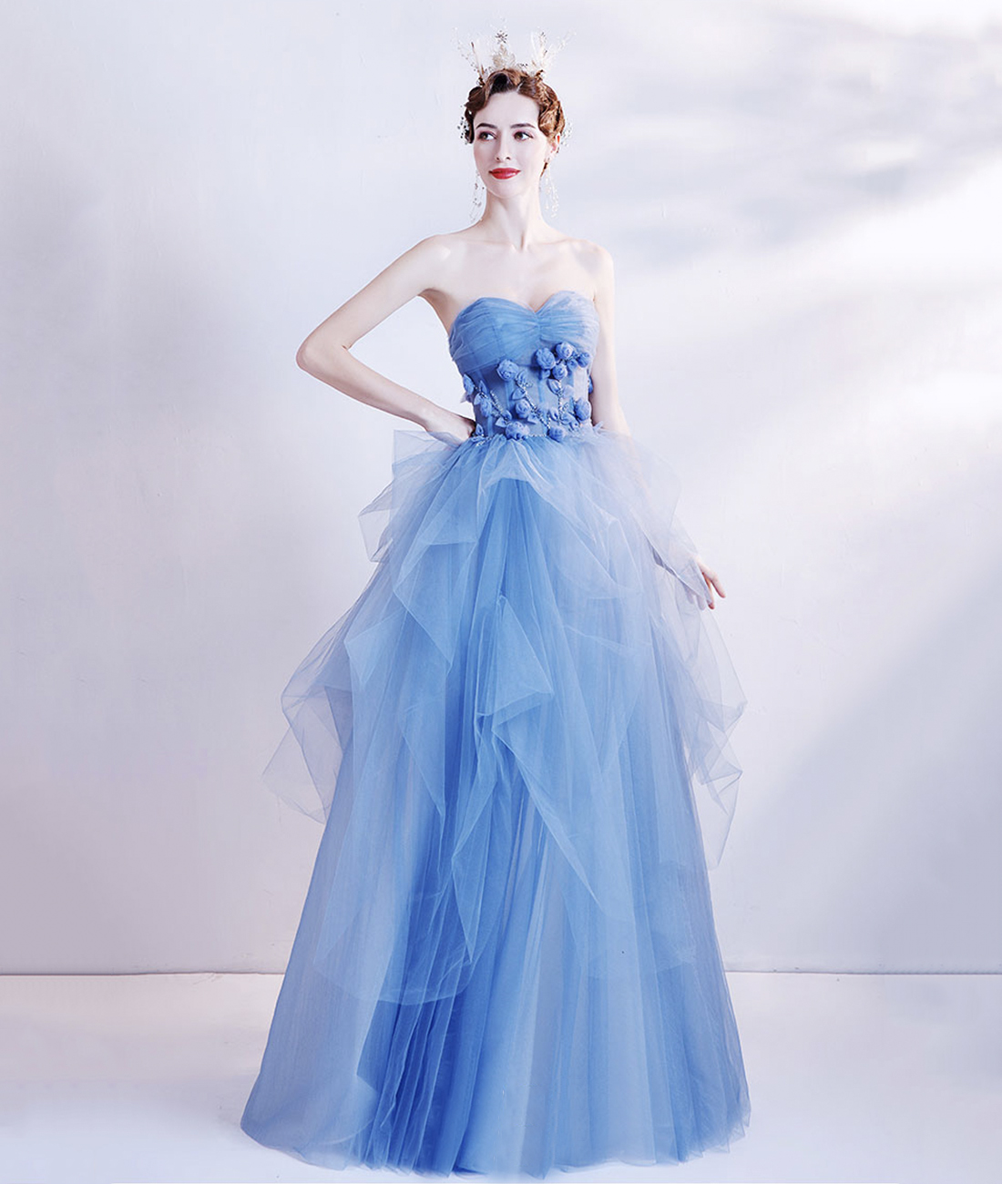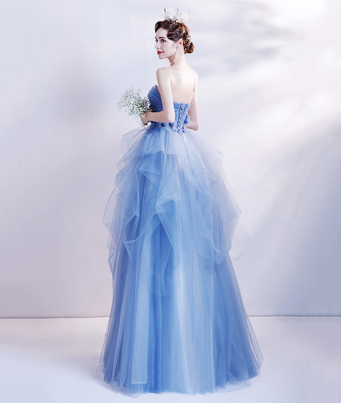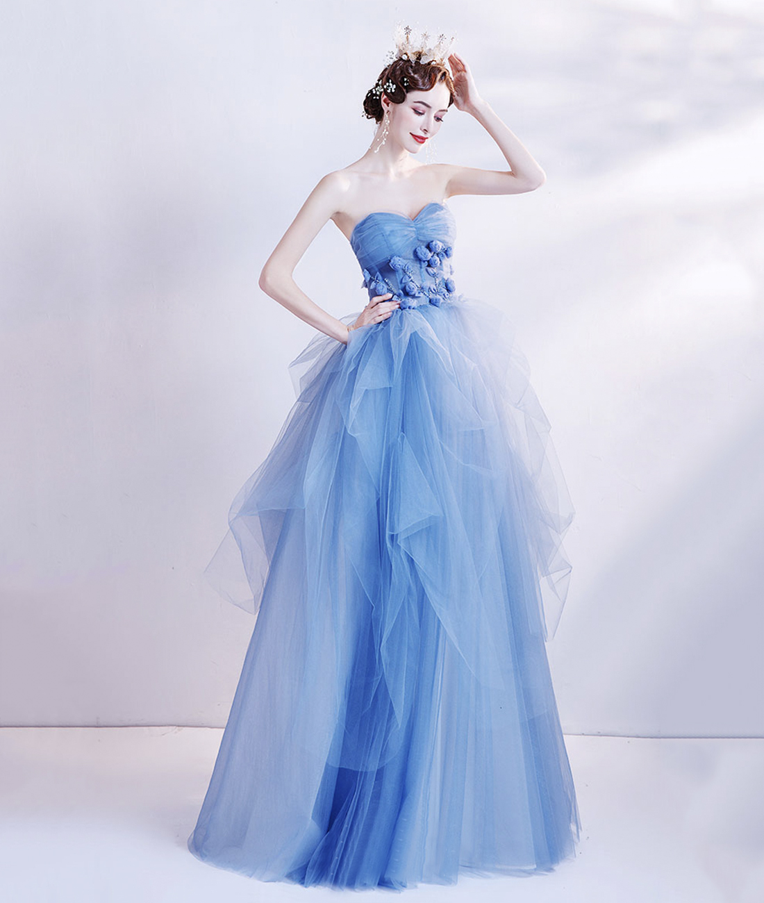 - Blue Strapless Tulle Long Formal Dress, Blue Evening Dress -