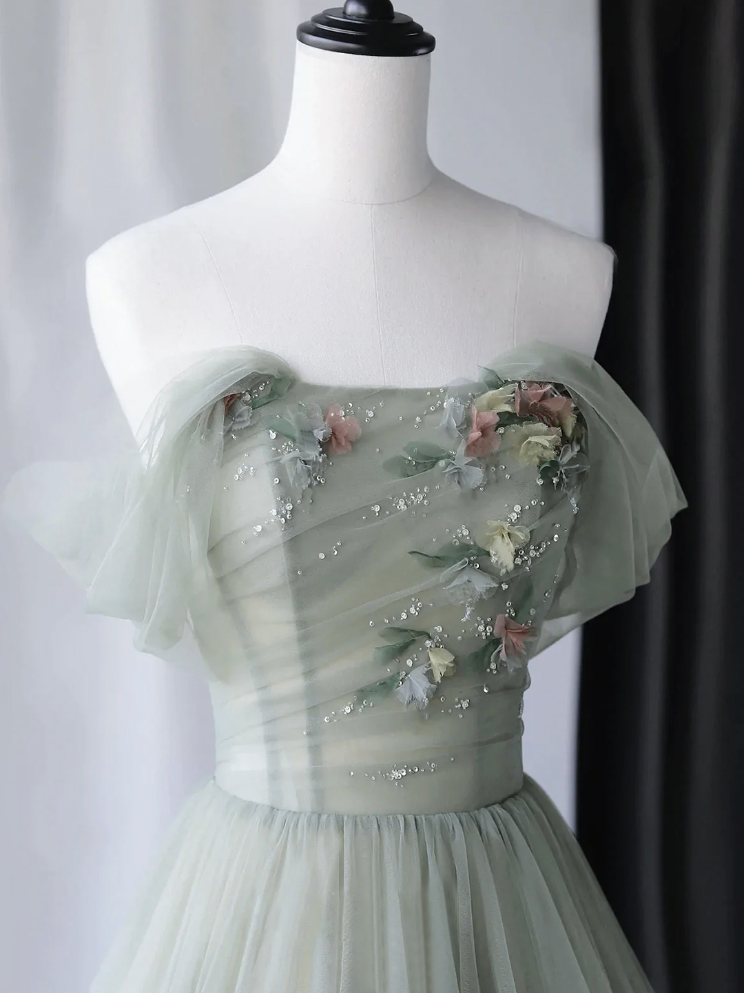 - Green Tulle Sequins Long Prom Dress, Off Shoulder Evening Dress -
