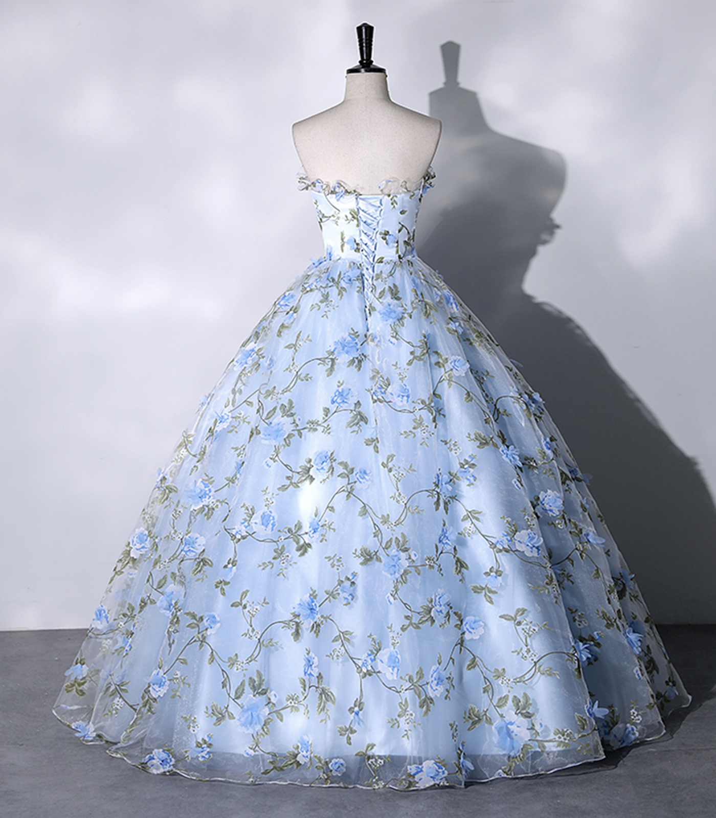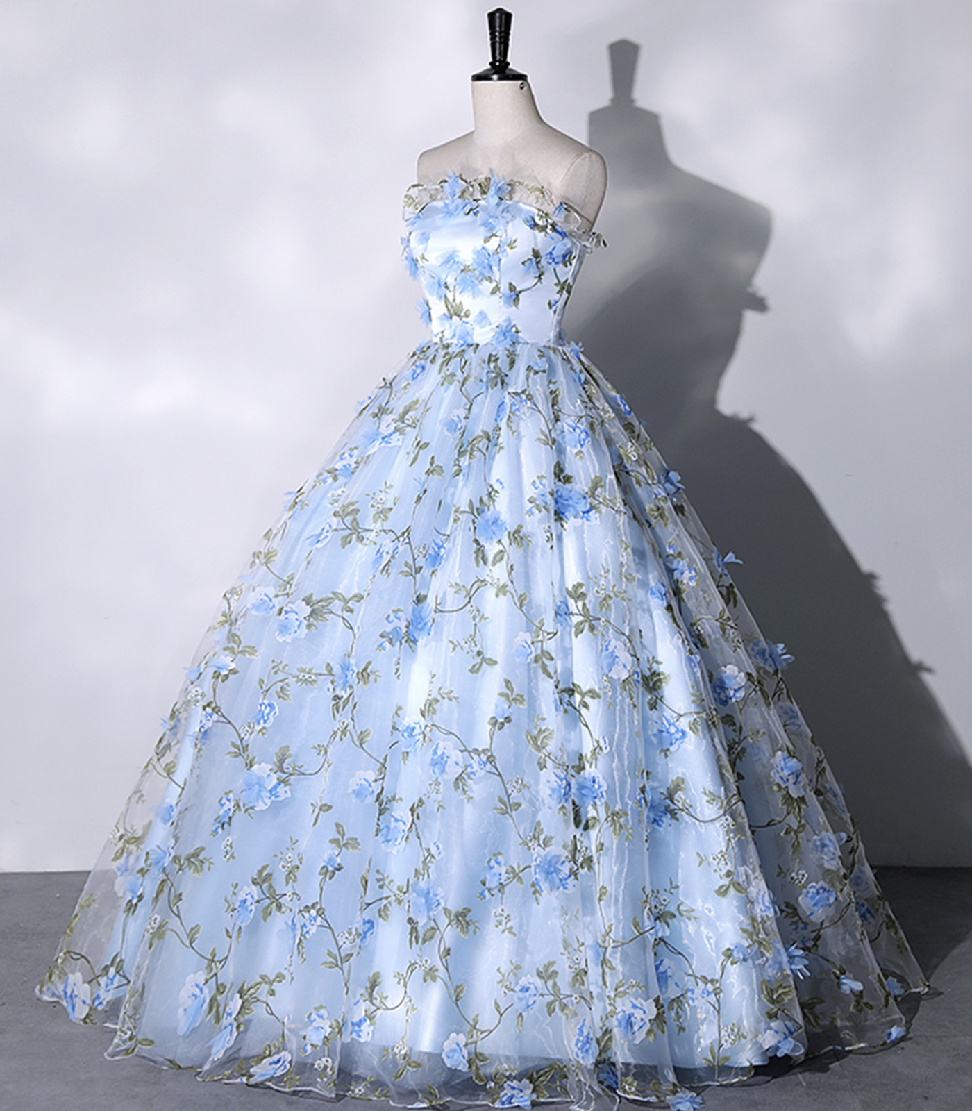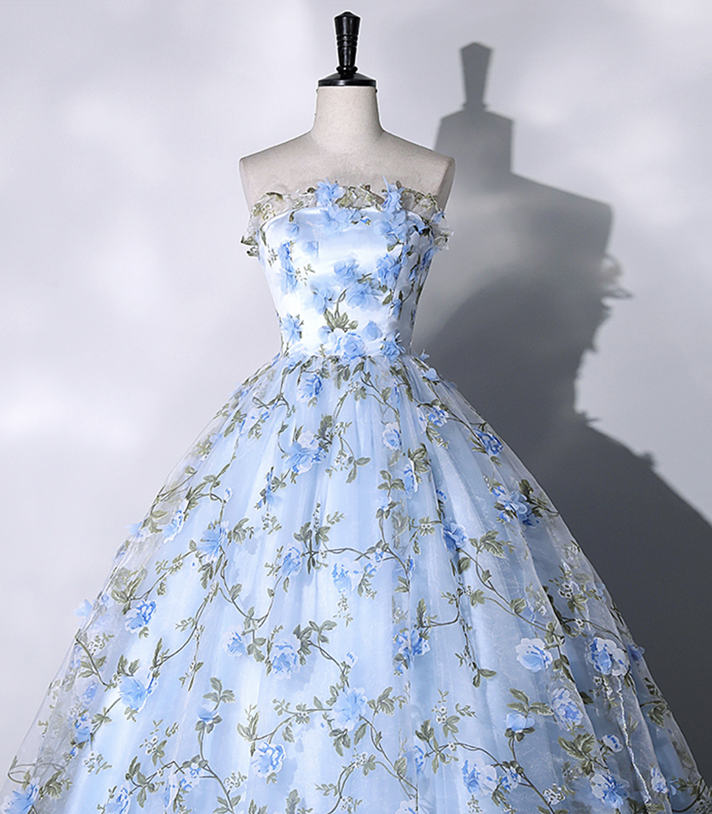 - Lovely Blue 3D Flower Long Formal Dress, Blue Strapless Prom Dress -