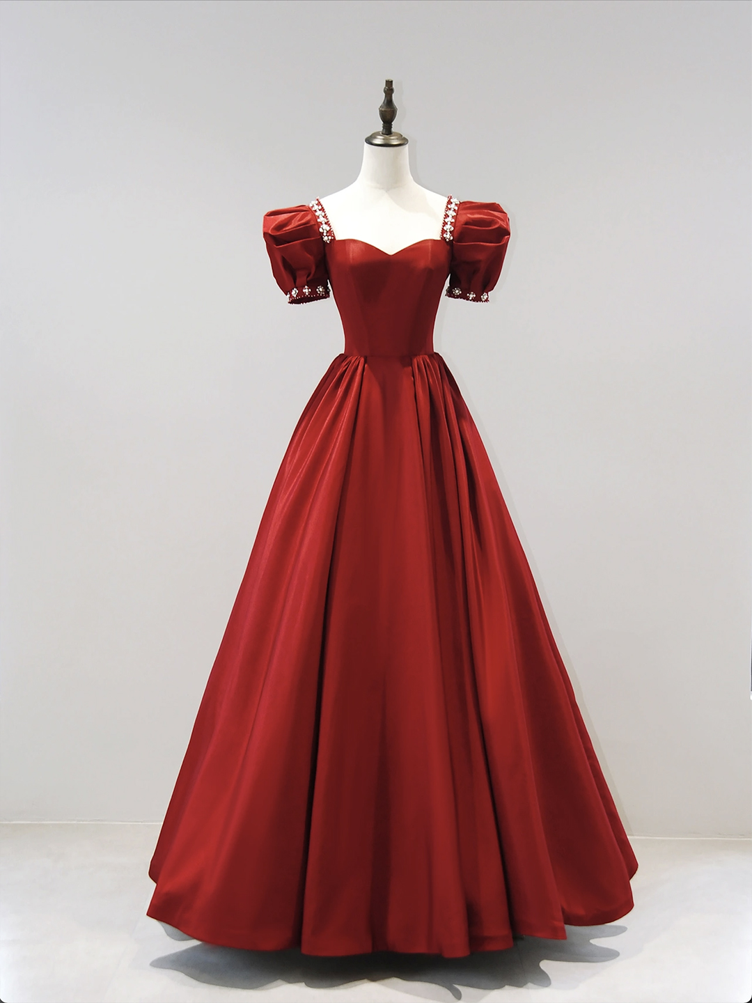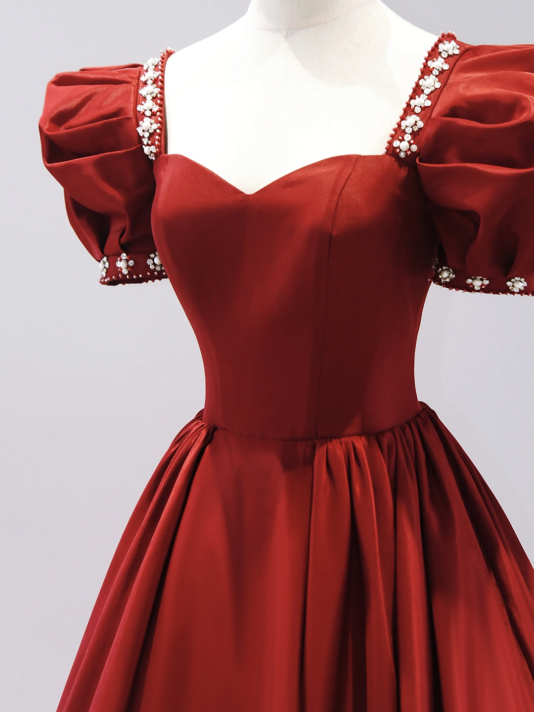 - Burgundy Satin Beaded Long Prom Dress, A-Line Short Sleeve Evening Dress -