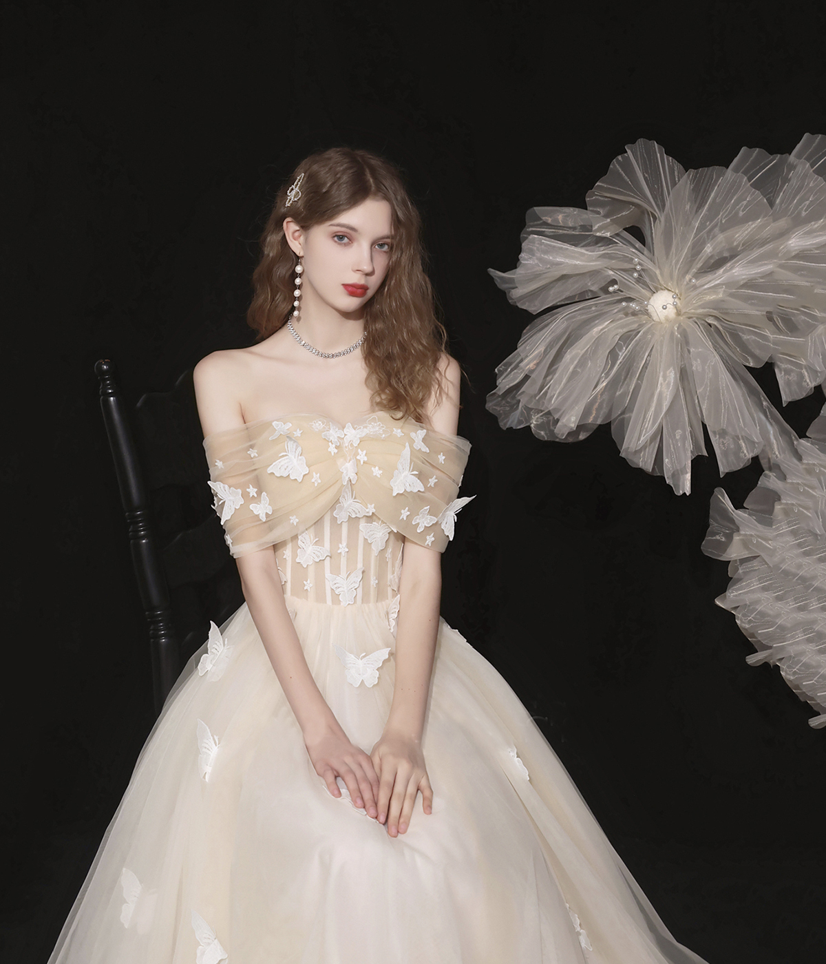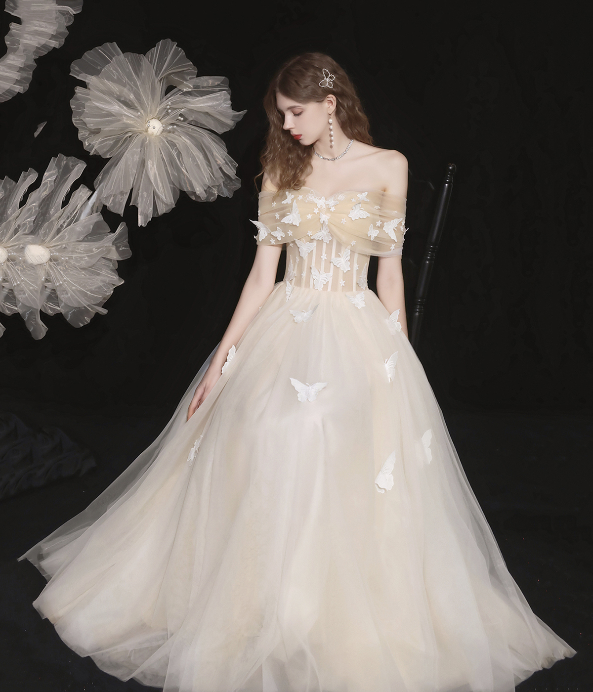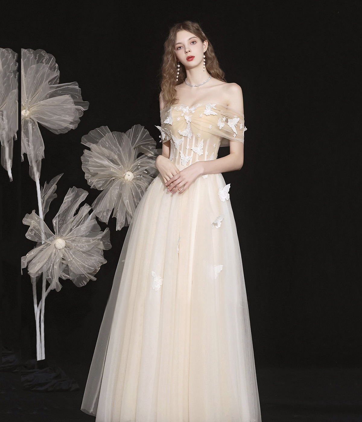 - Champagne Tulle Lace Long Prom Dress, Beautiful A-Line Evening Dress -