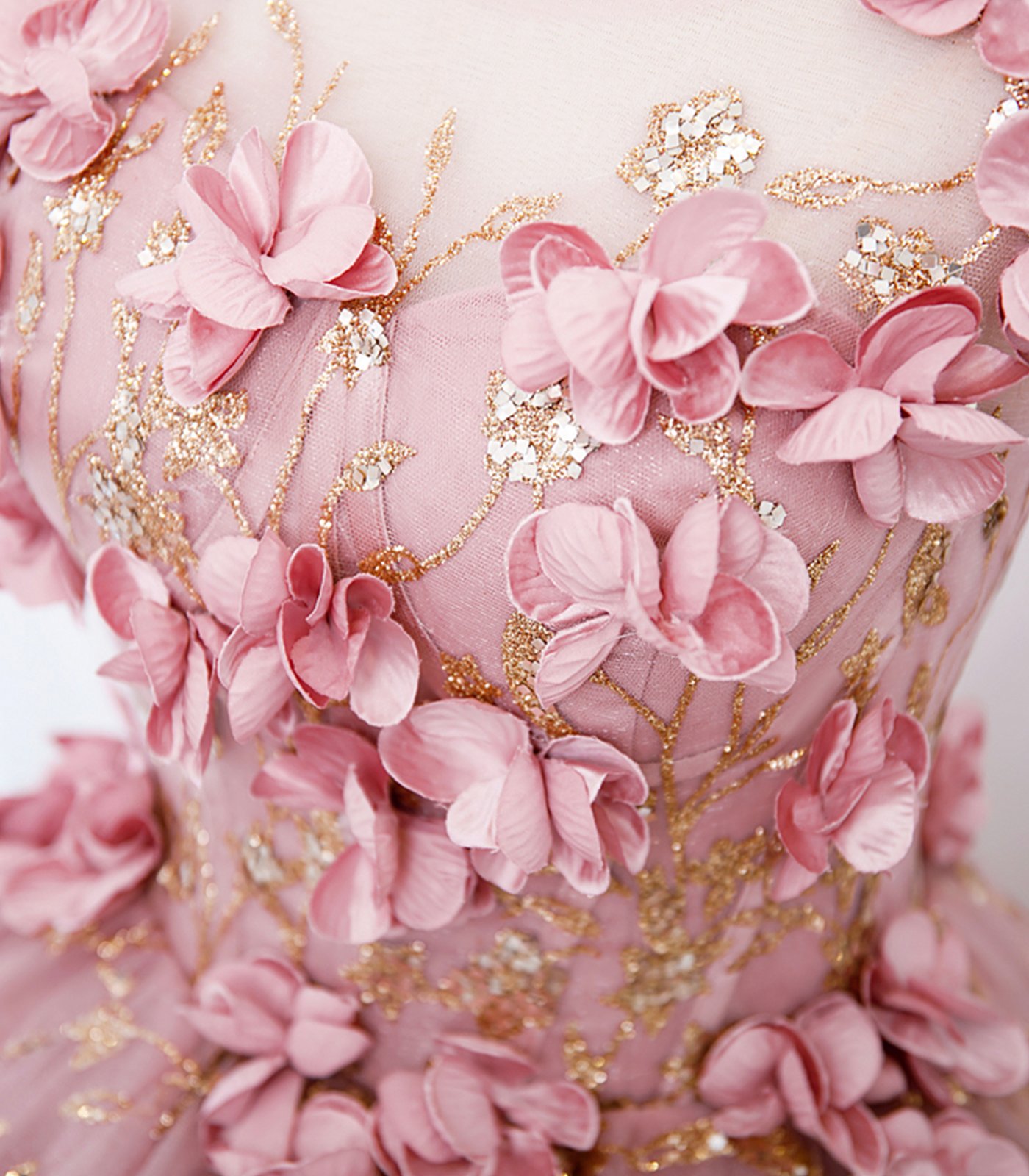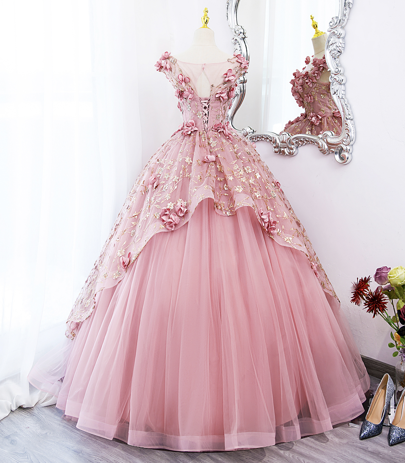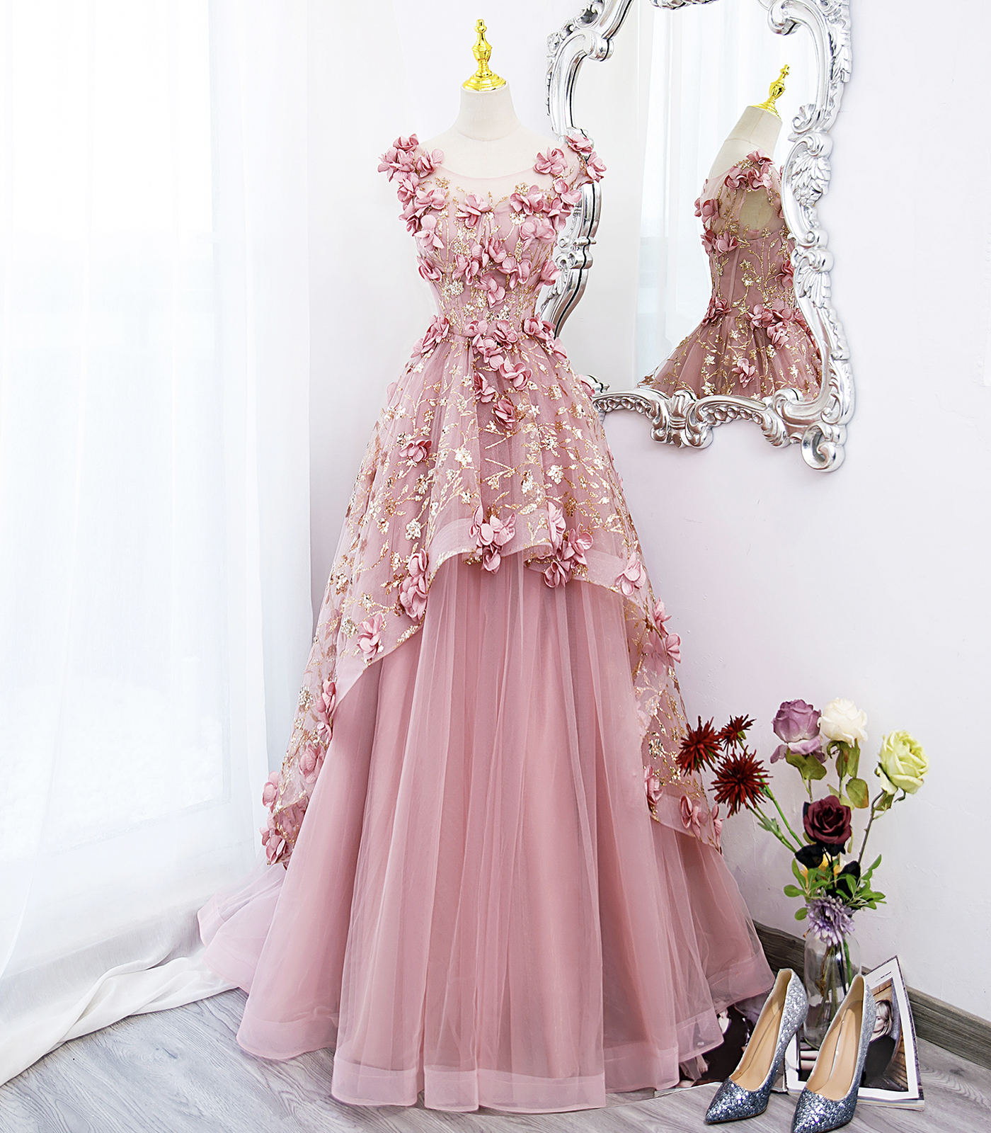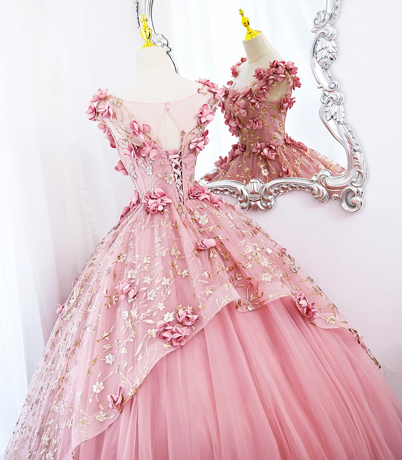 - Beautiful Pink Tulle Long Prom Dress with Flowers, Lovely Party Dress Sweet 16 Dress -
