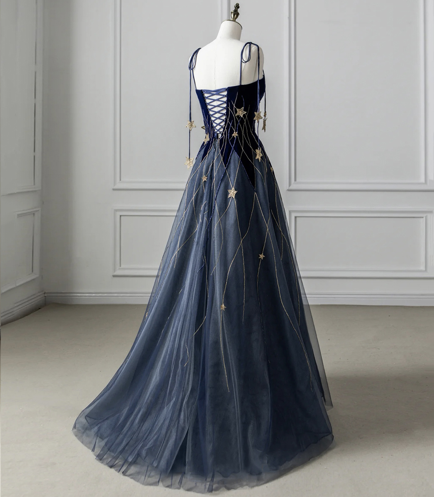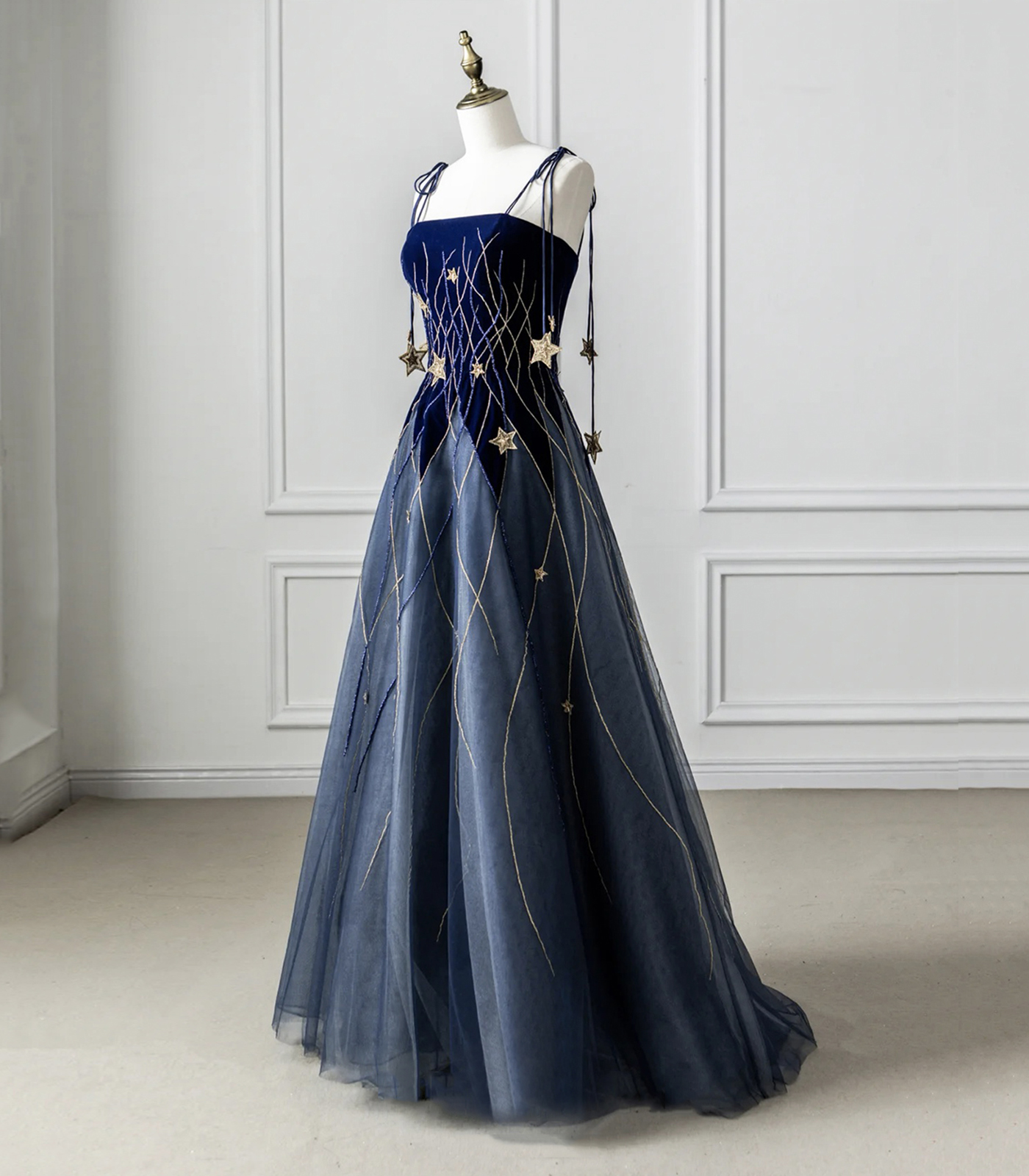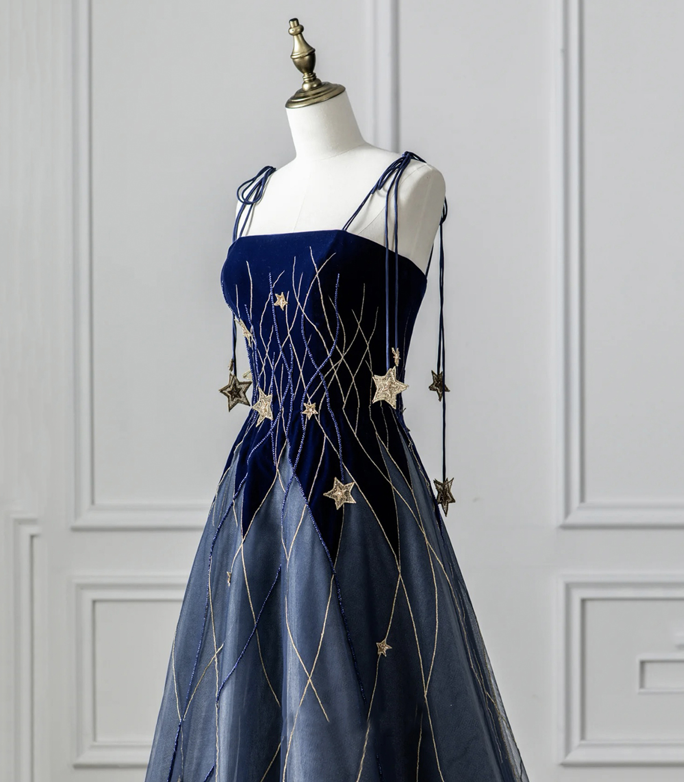 - Blue Spaghetti Strap Velvet Long Prom Dress with Star, Blue Evening Dress Party Dress -