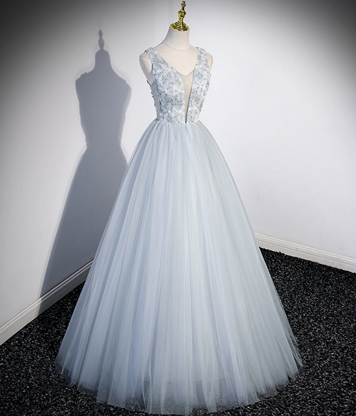 - Cute V-Neck Tulle Long Prom Dress, Gray Evening Dress Party Dress -
