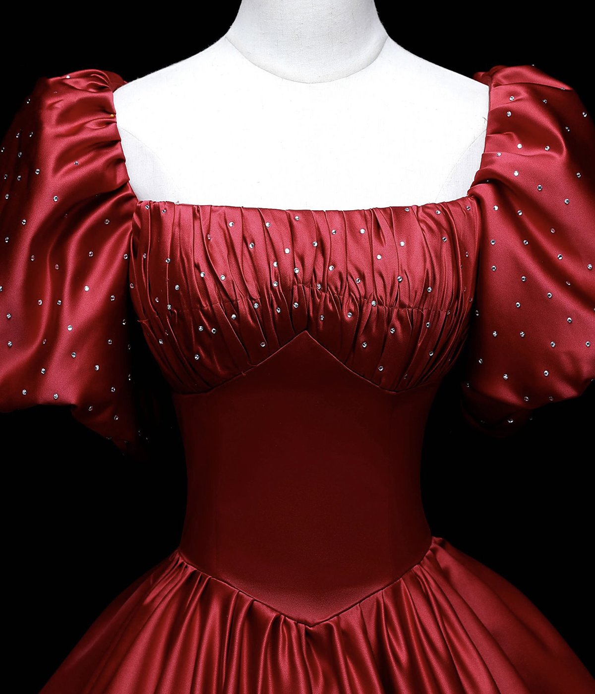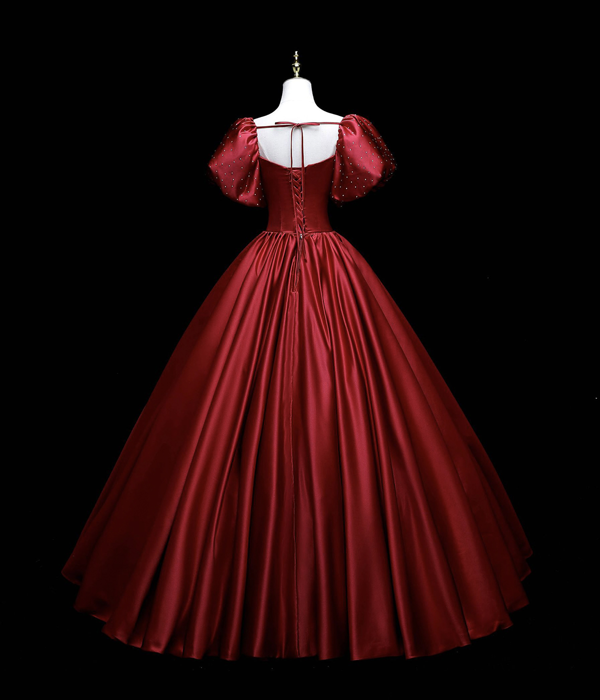 - Burgundy Satin Beaded Long Princess Ball Gown Dress -