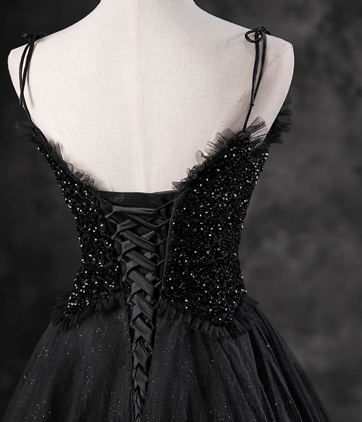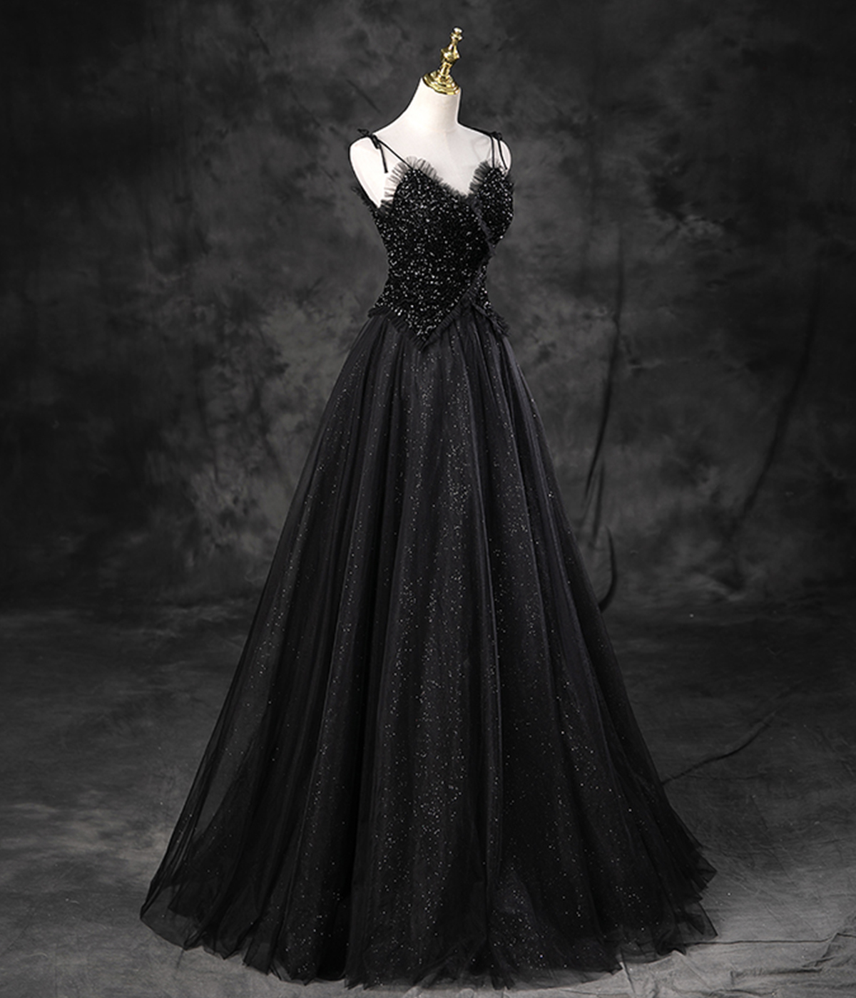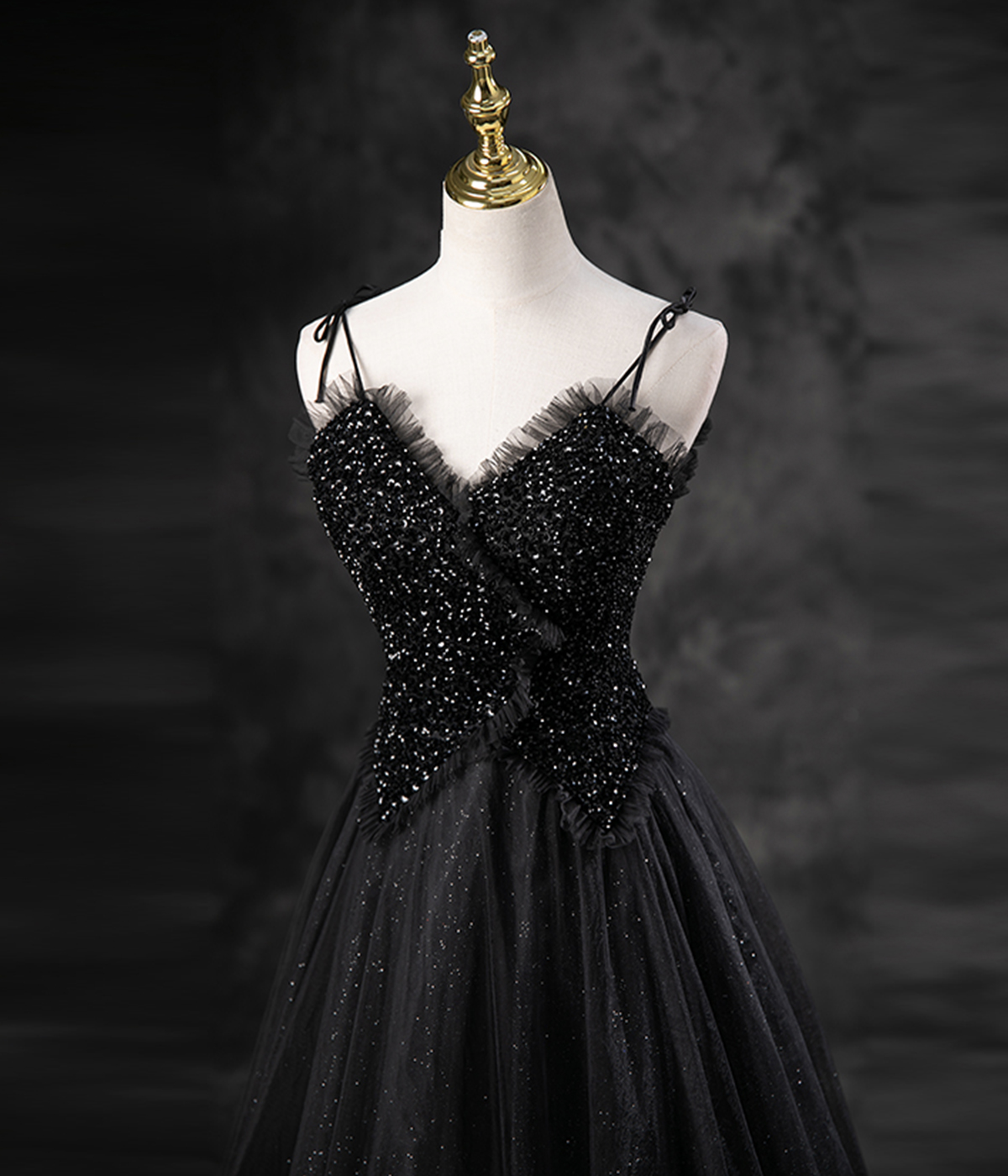 - Black Spaghetti Strap Tulle Sequin Long Prom Dress -