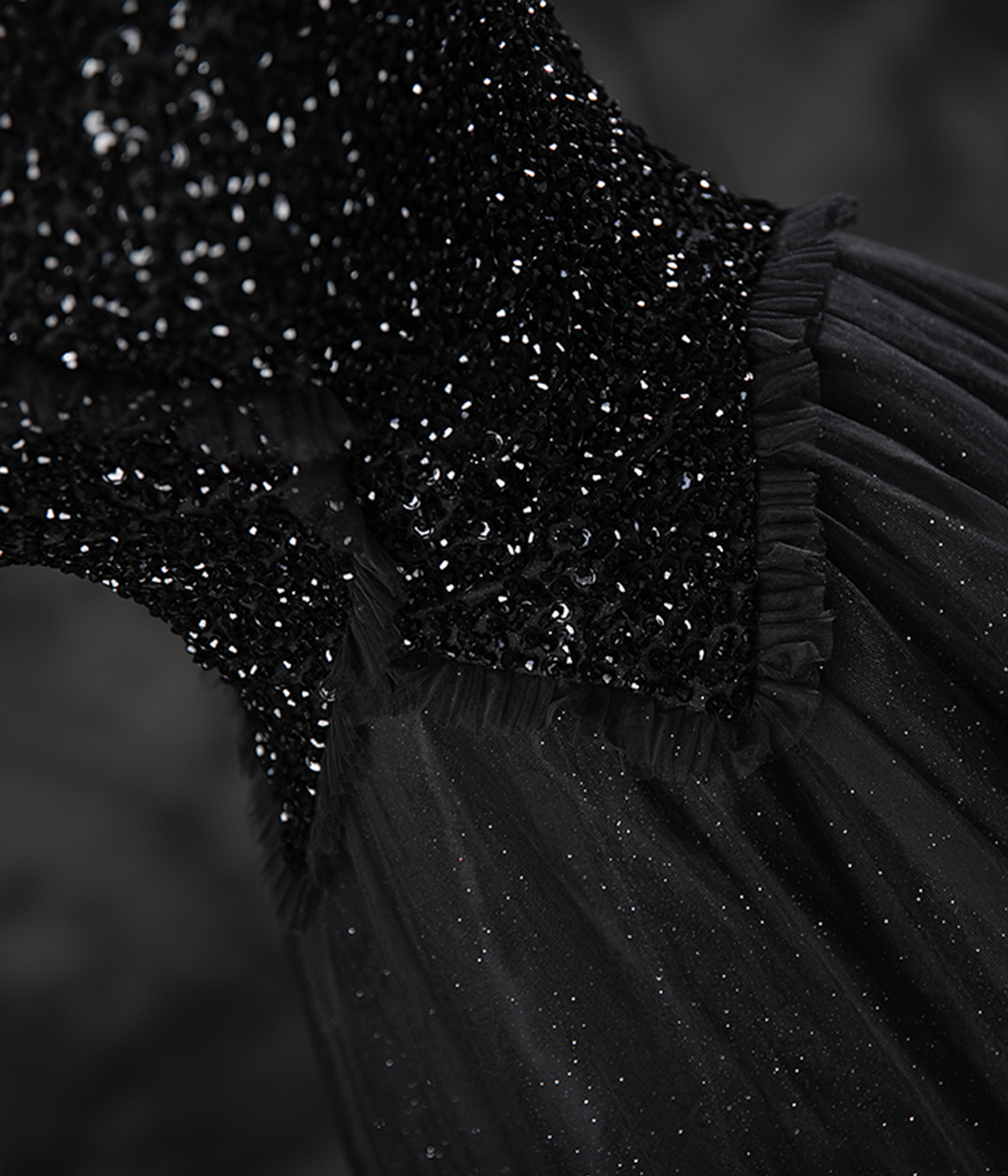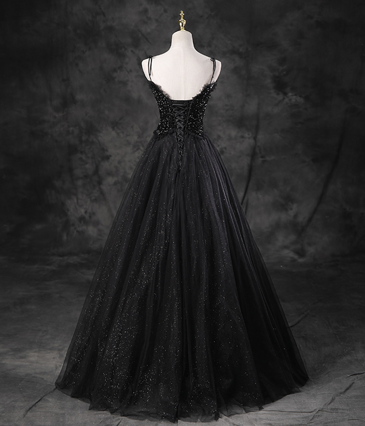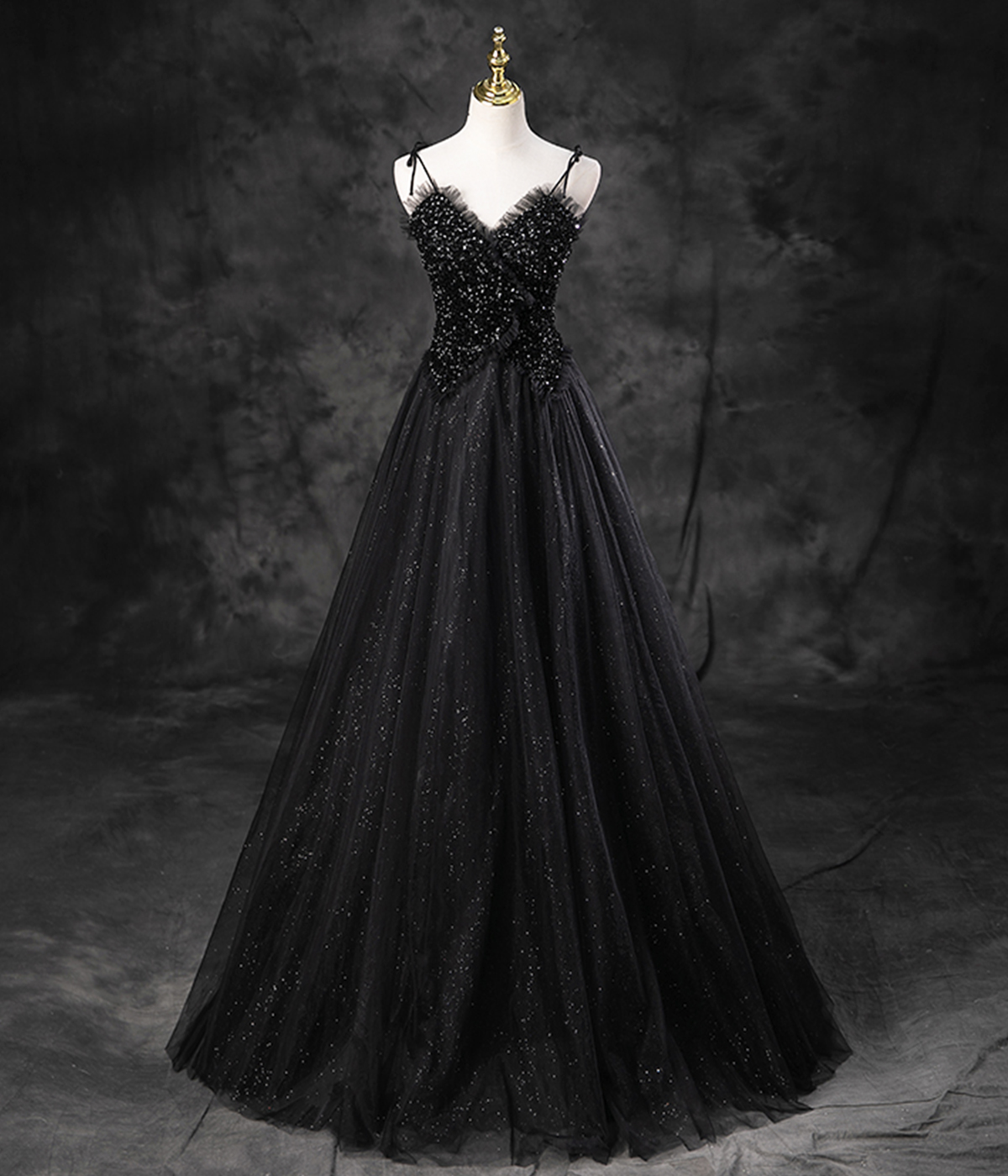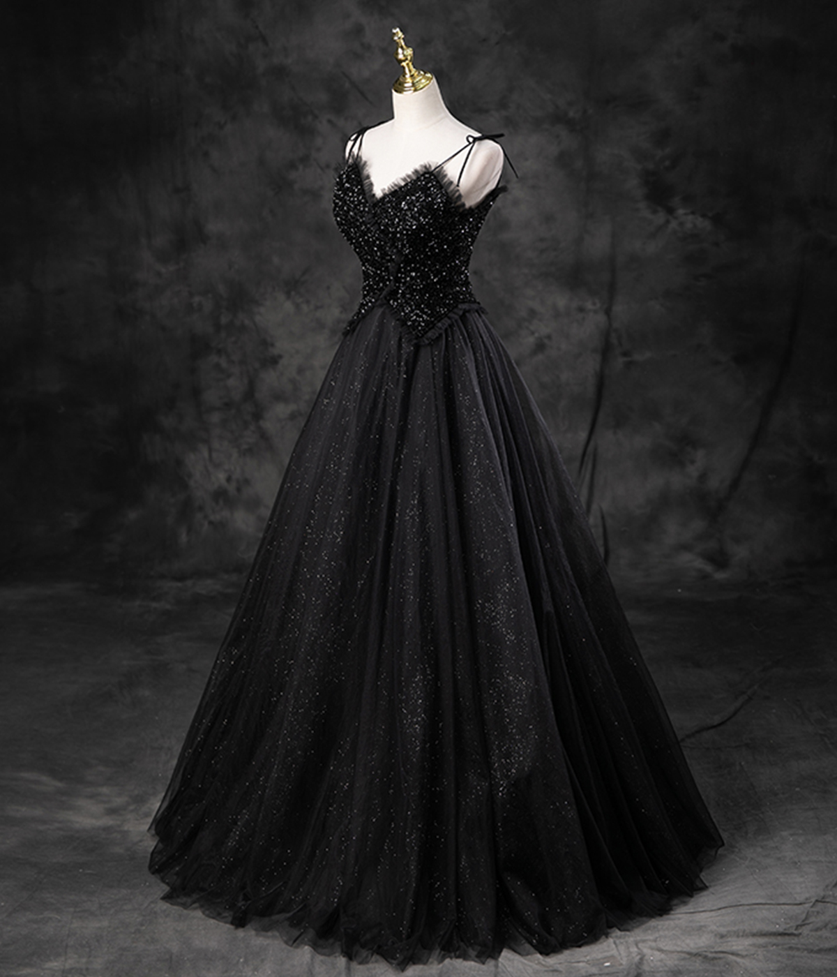 - Black Spaghetti Strap Tulle Sequin Long Prom Dress -