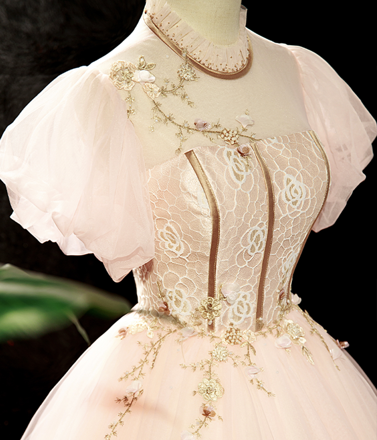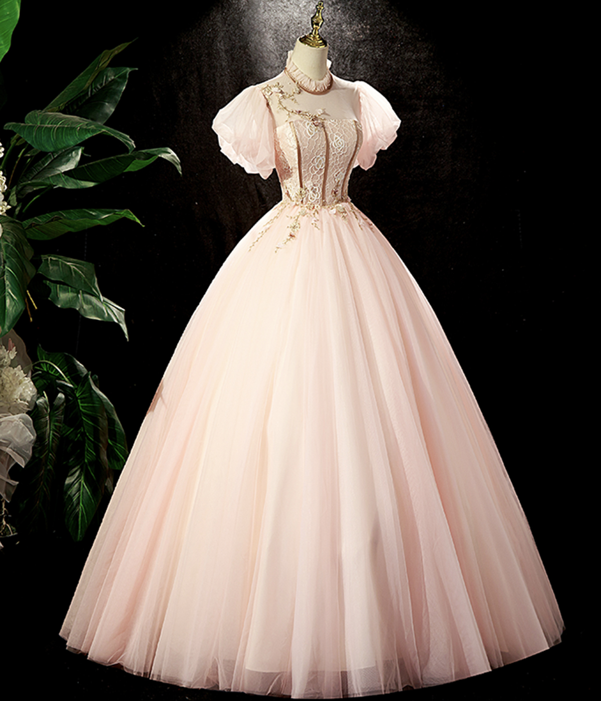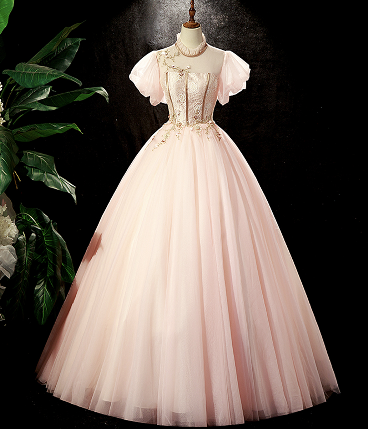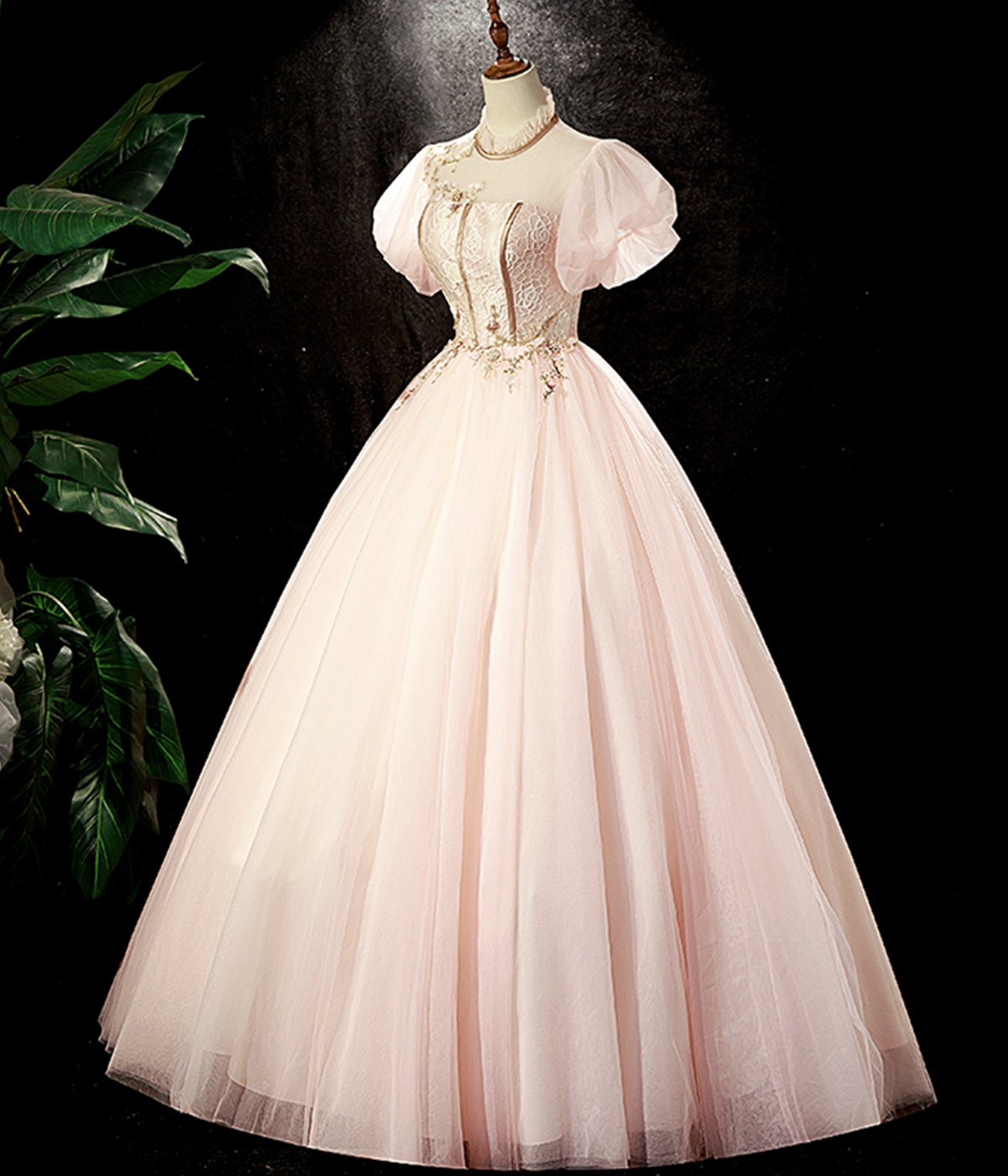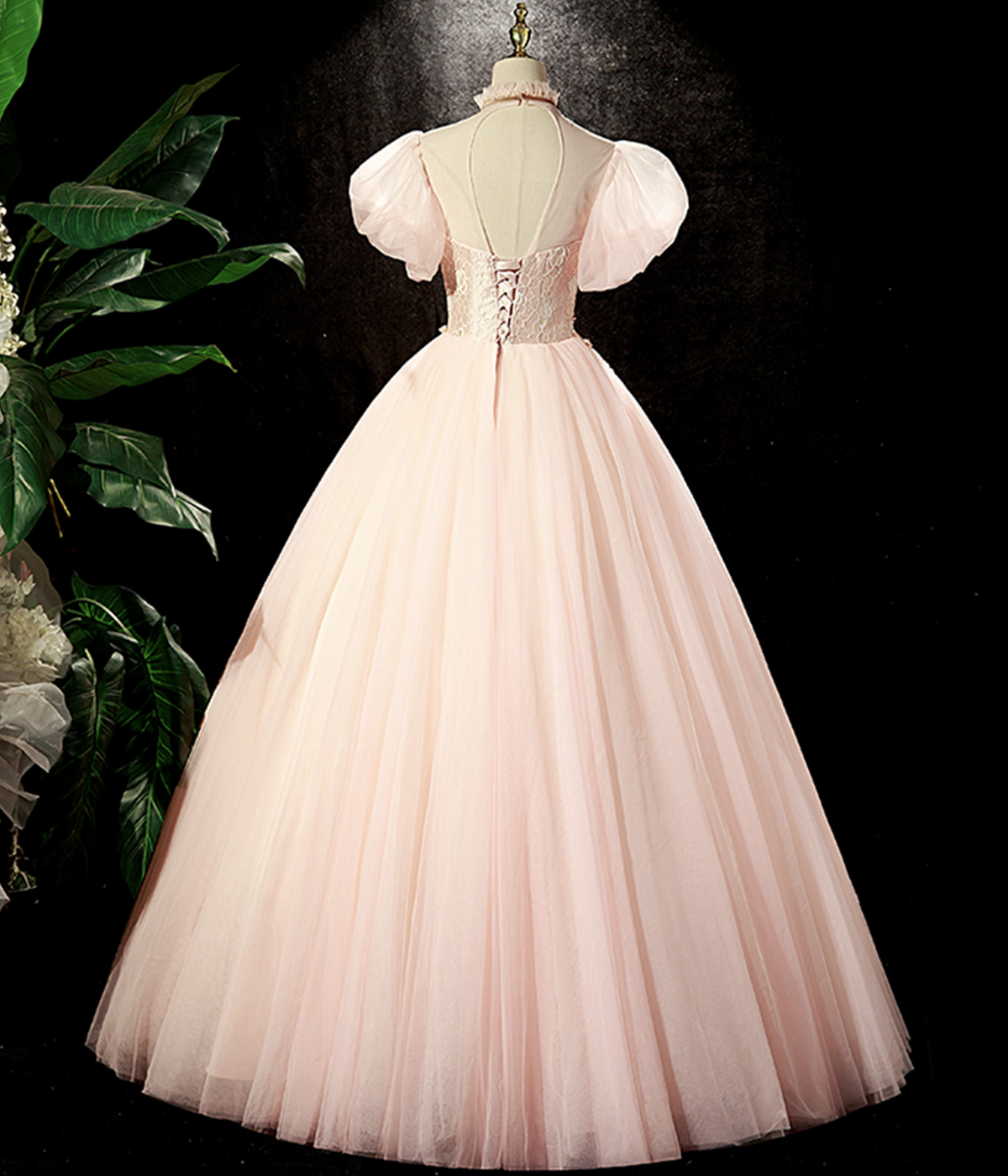- Pink Tulle Lace Long Prom Dress, A-Line Beautiful Evening Party Dress -