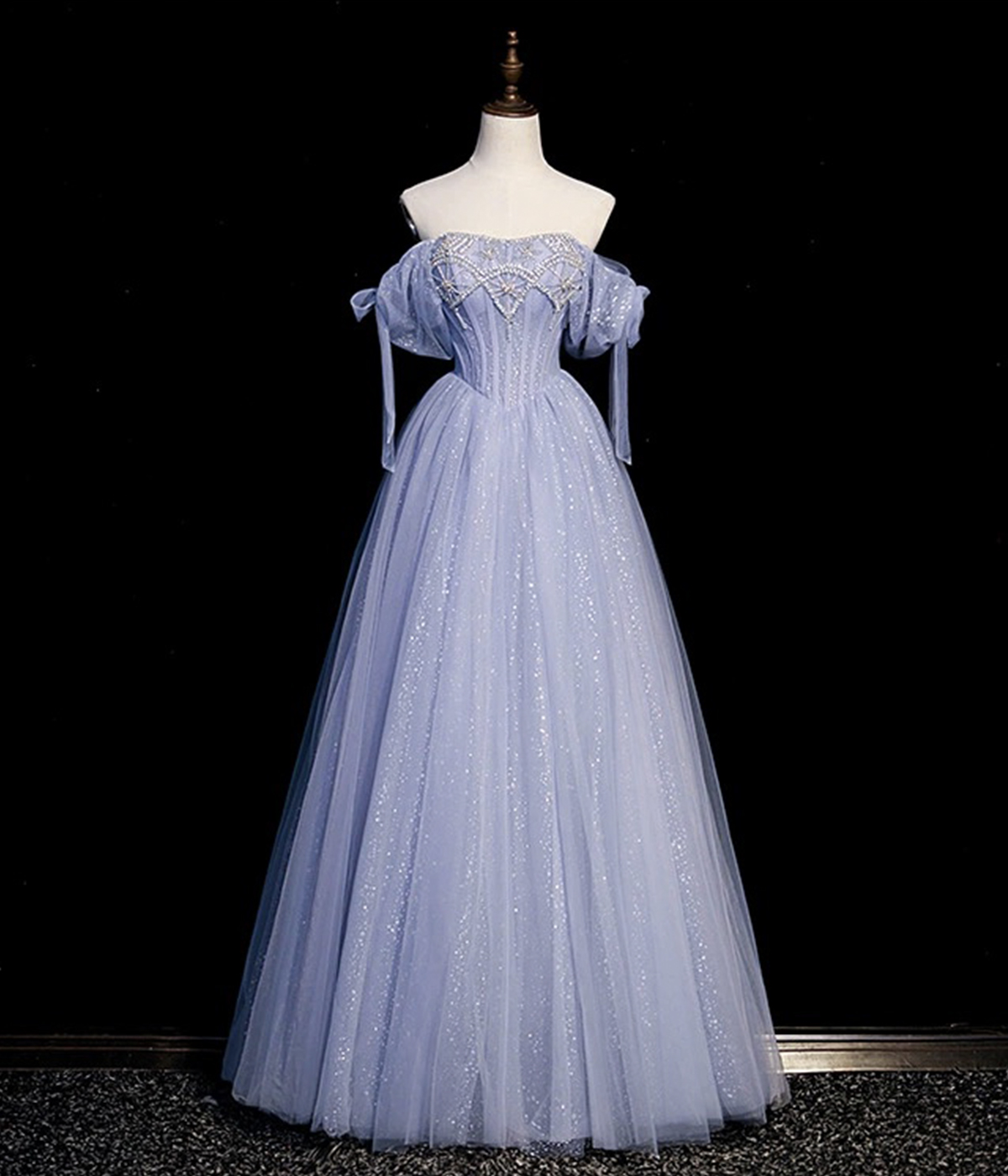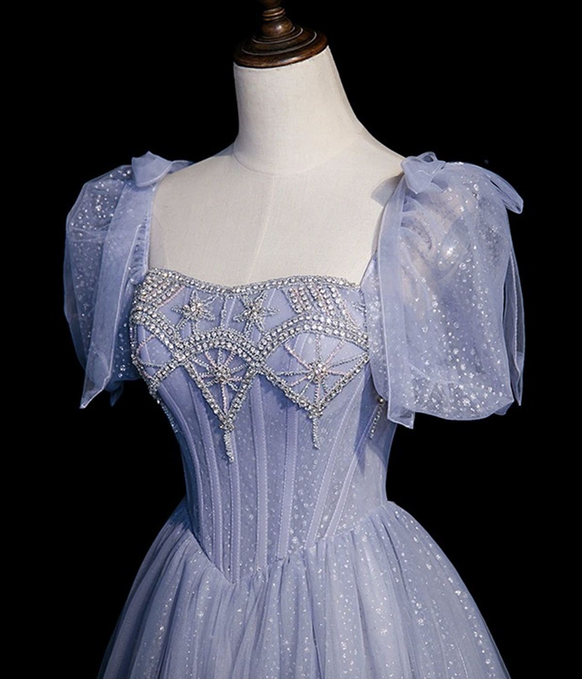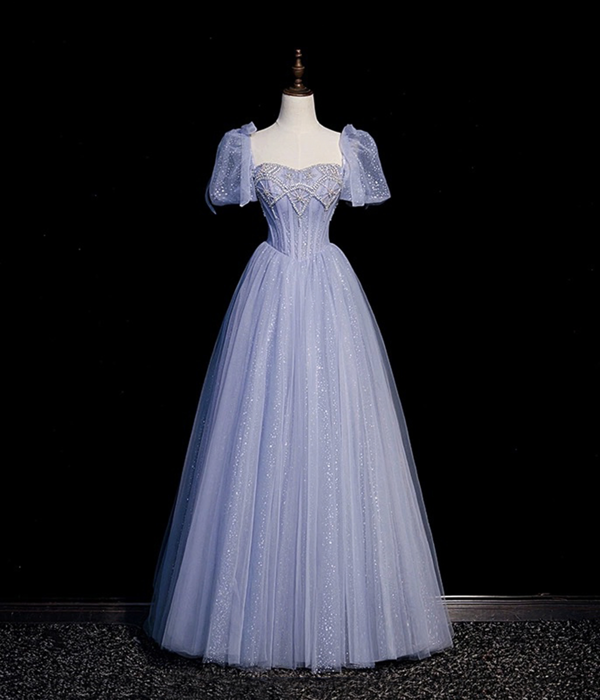- Blue Tulle Beaded Floor Length Prom Dress -