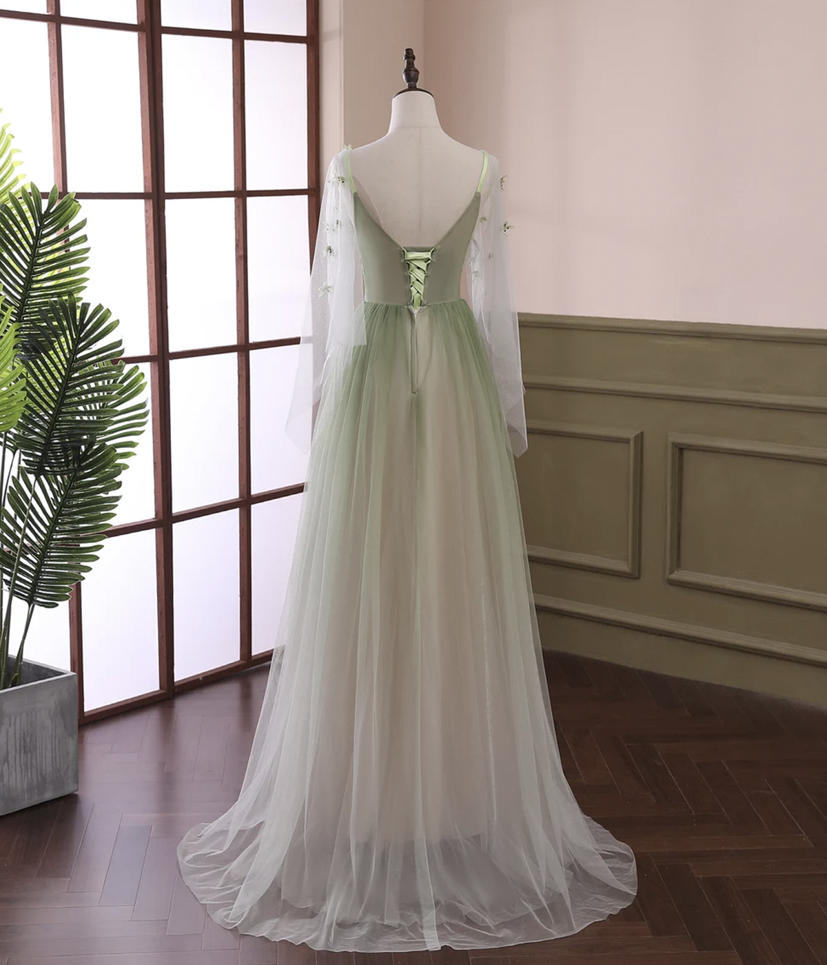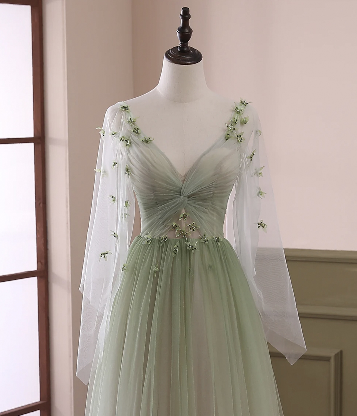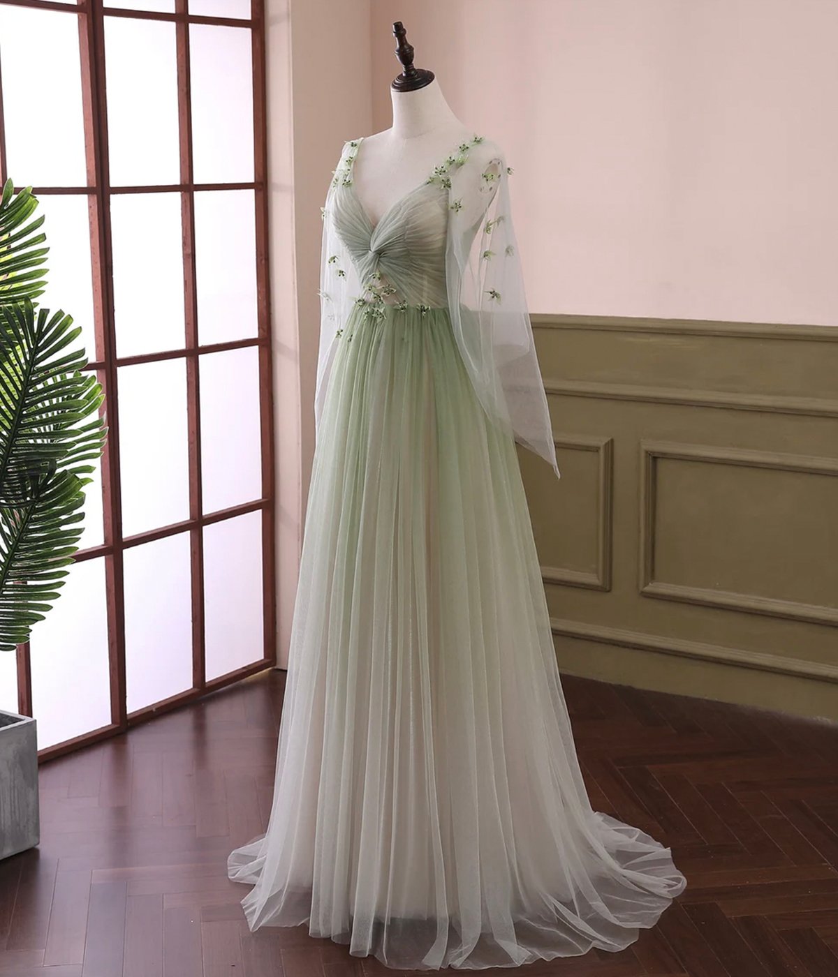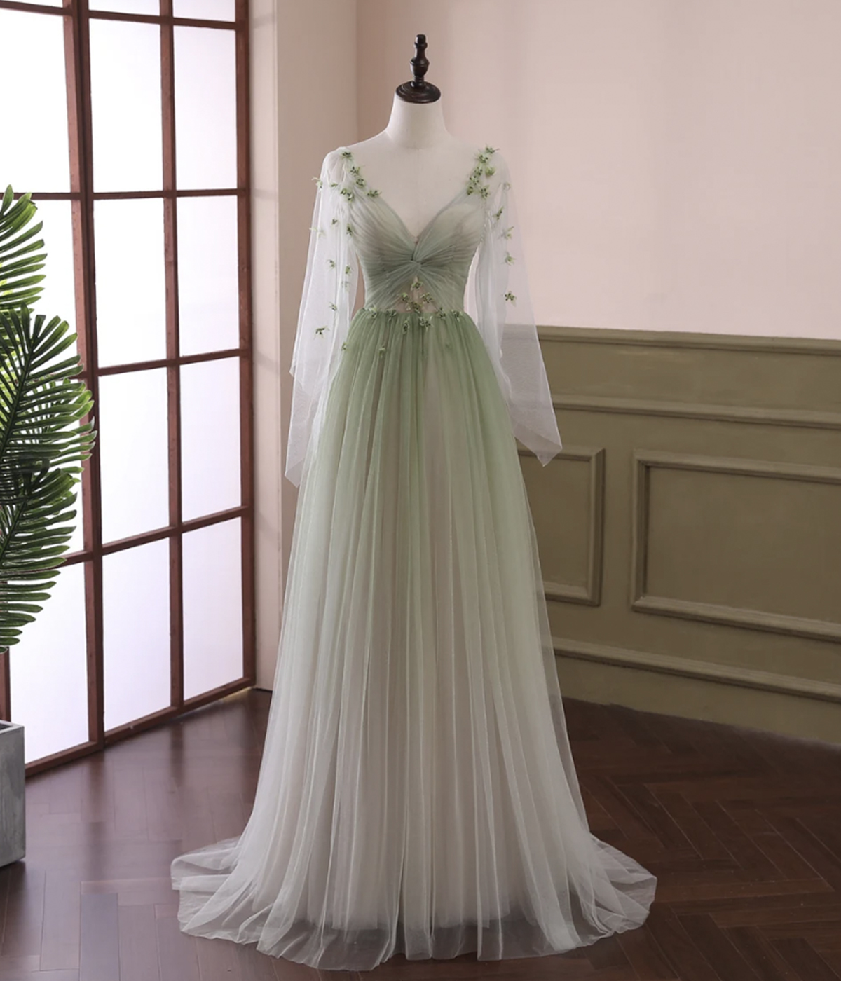 - Light Green Tulle Long Sleeve Prom Dress, Green Gradient Floor Length Evening Dress -