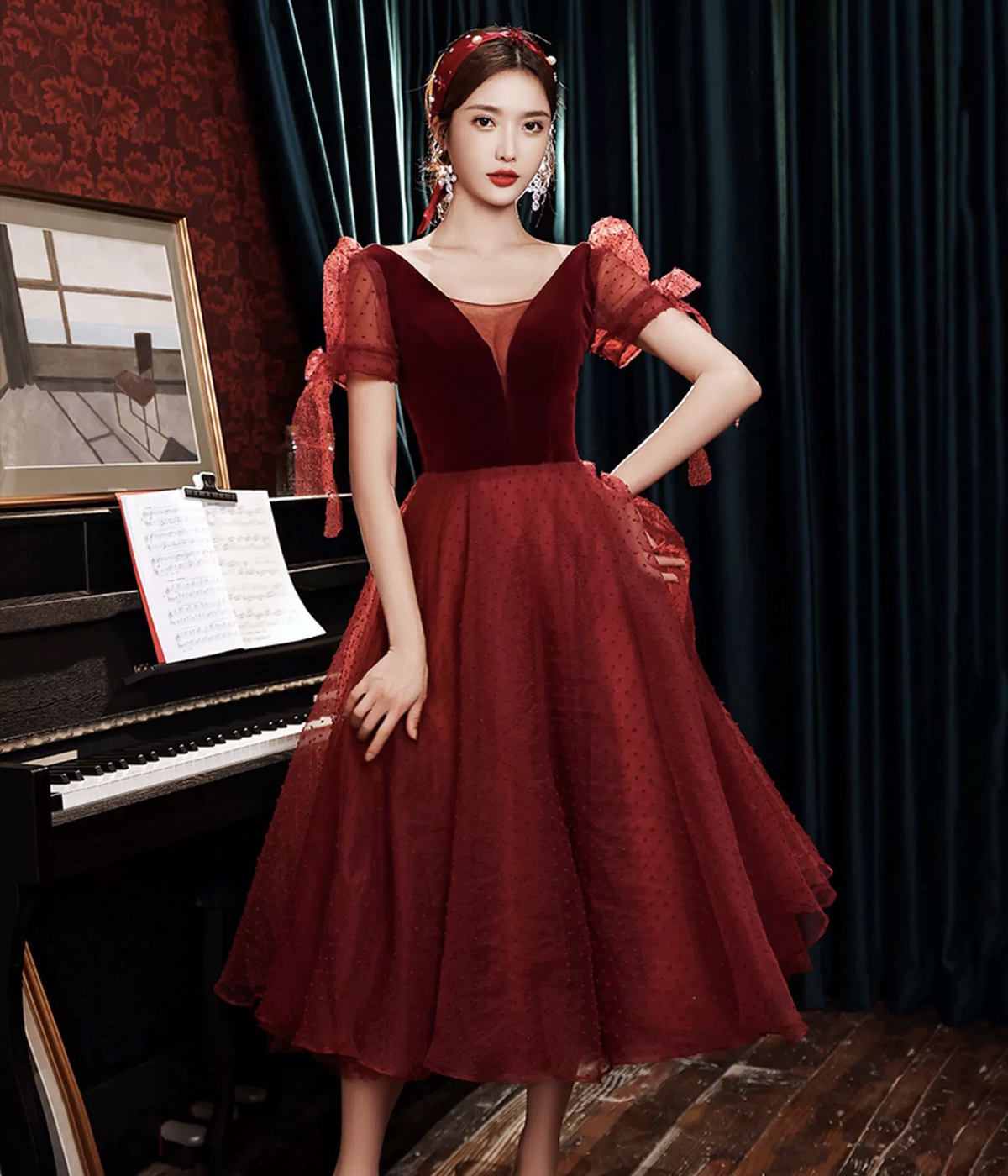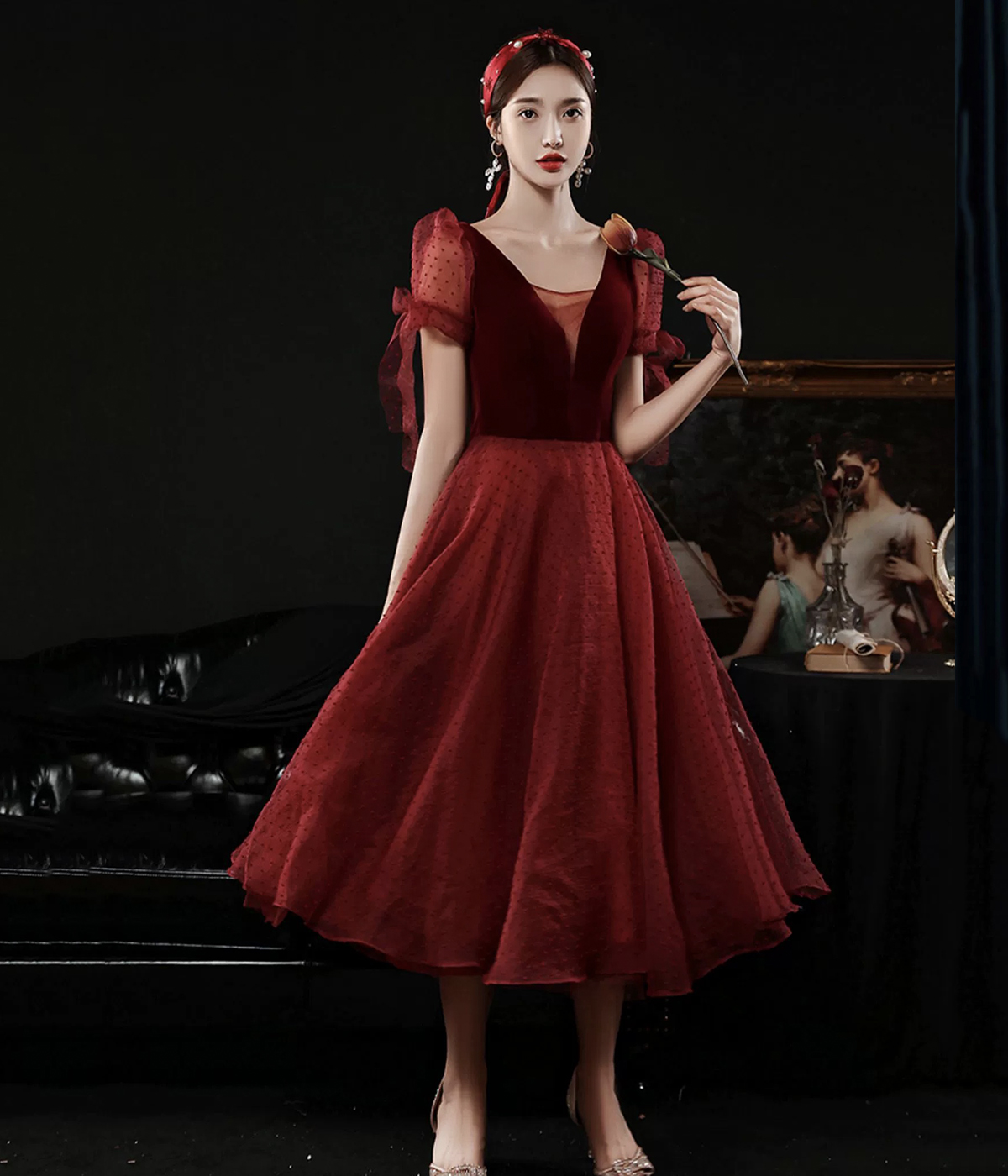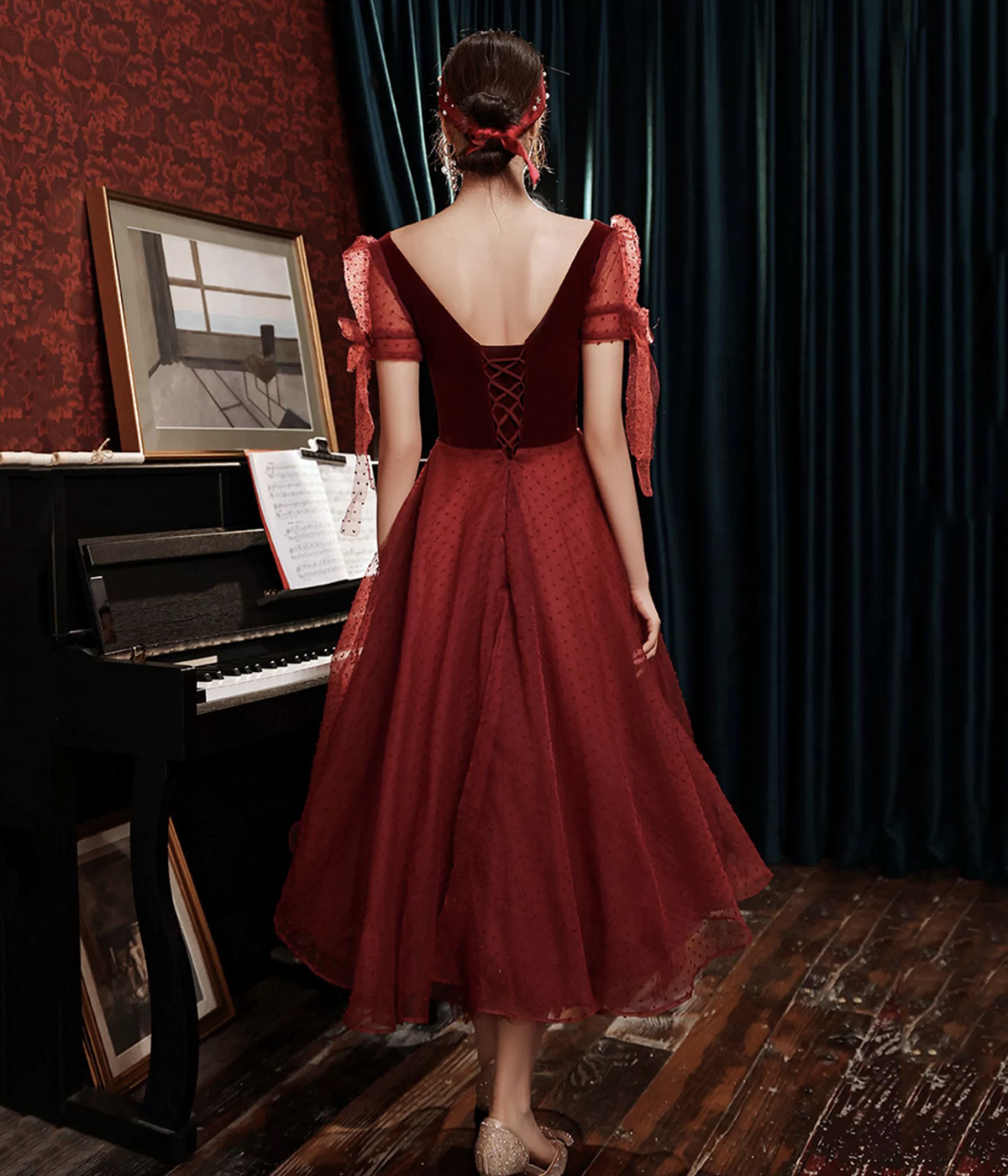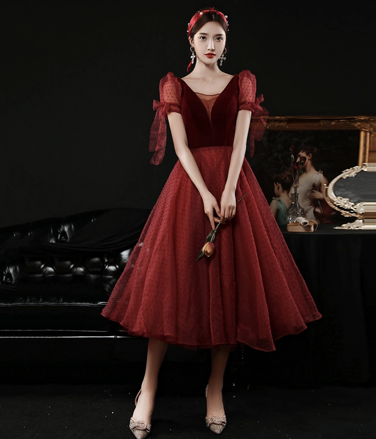 - Burgundy V-Neck Velvet and Tulle Tea Length Prom Dress -