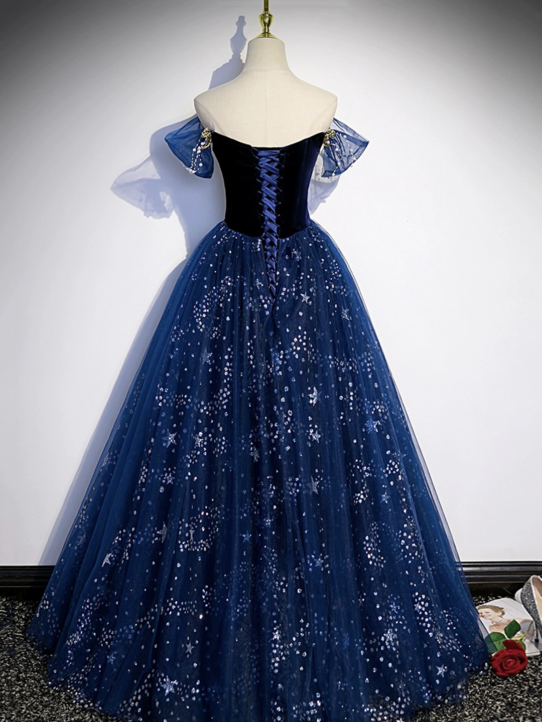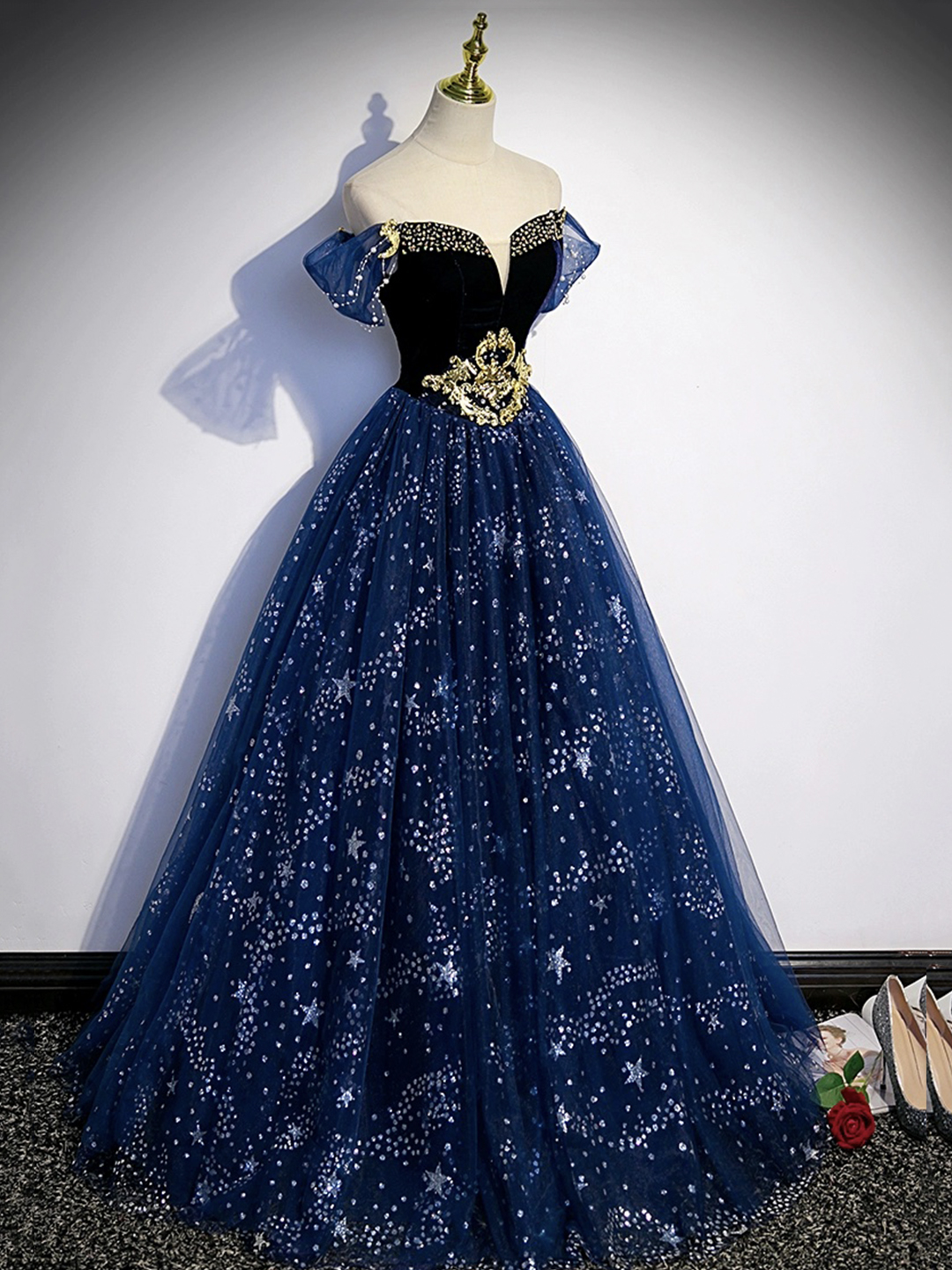 - Blue Velvet Tulle Long A-Line Prom Dress -
