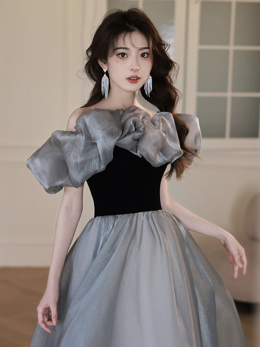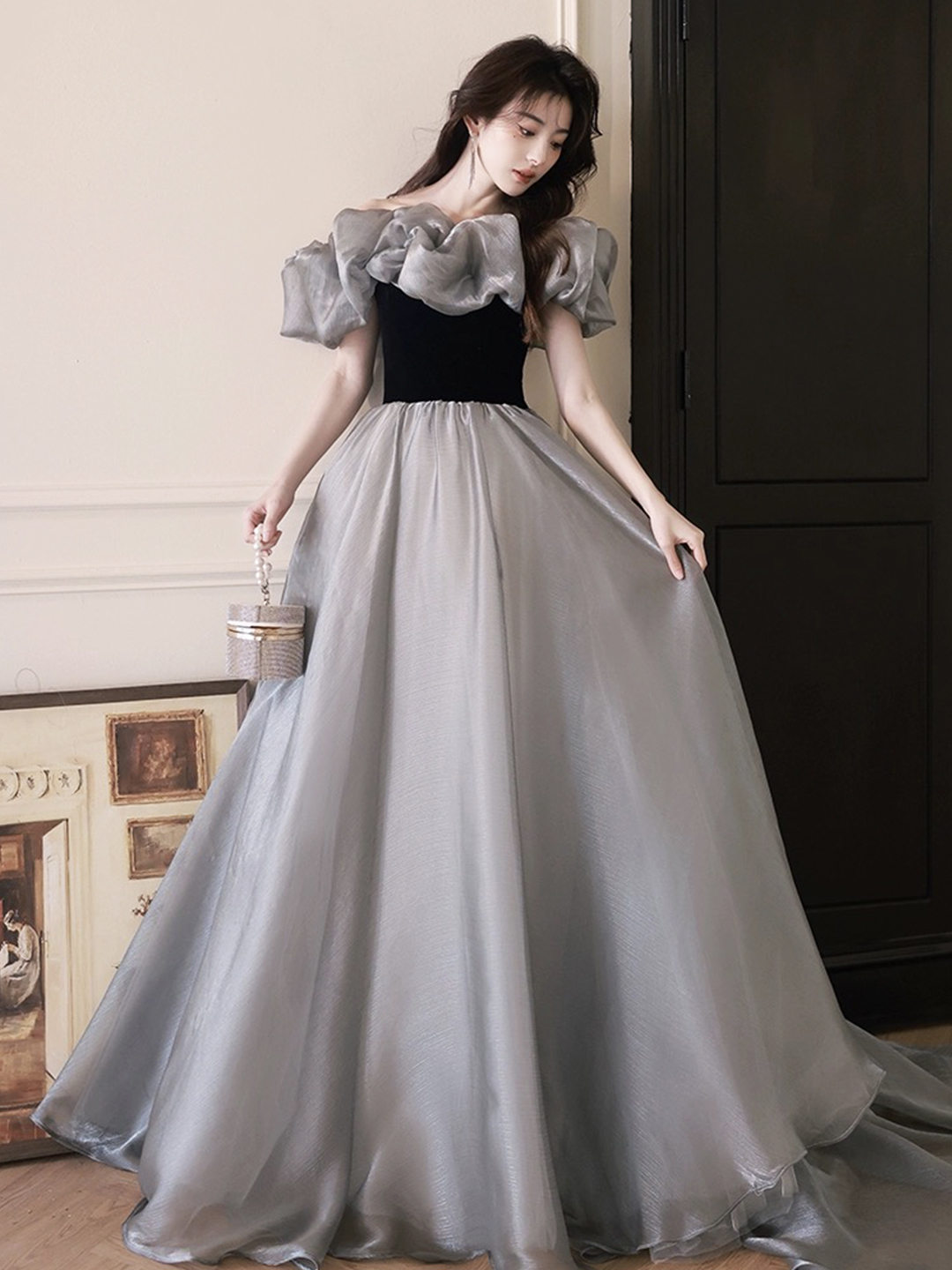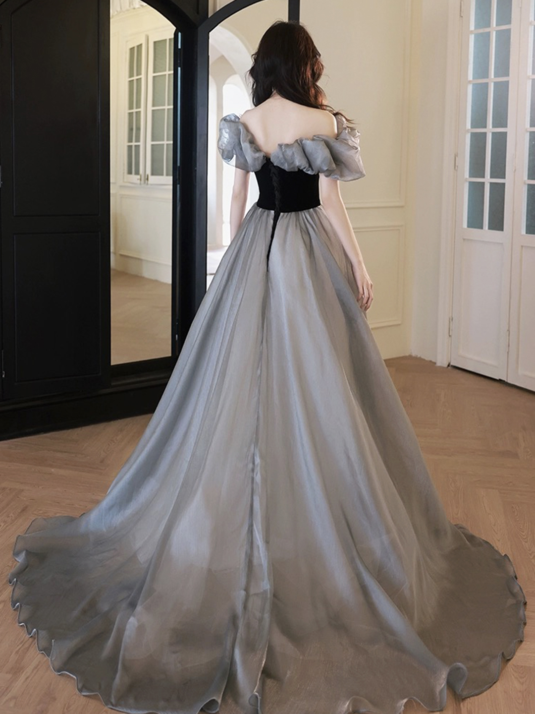 - Black Velvet and Gray Tulle Long Prom Dress -