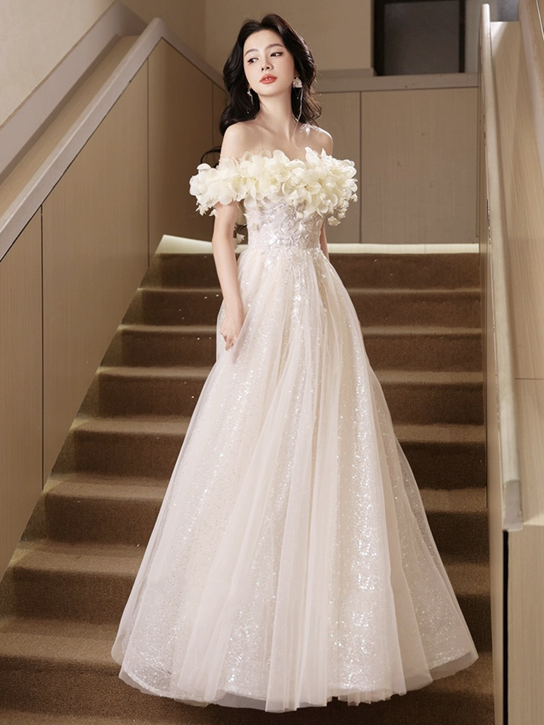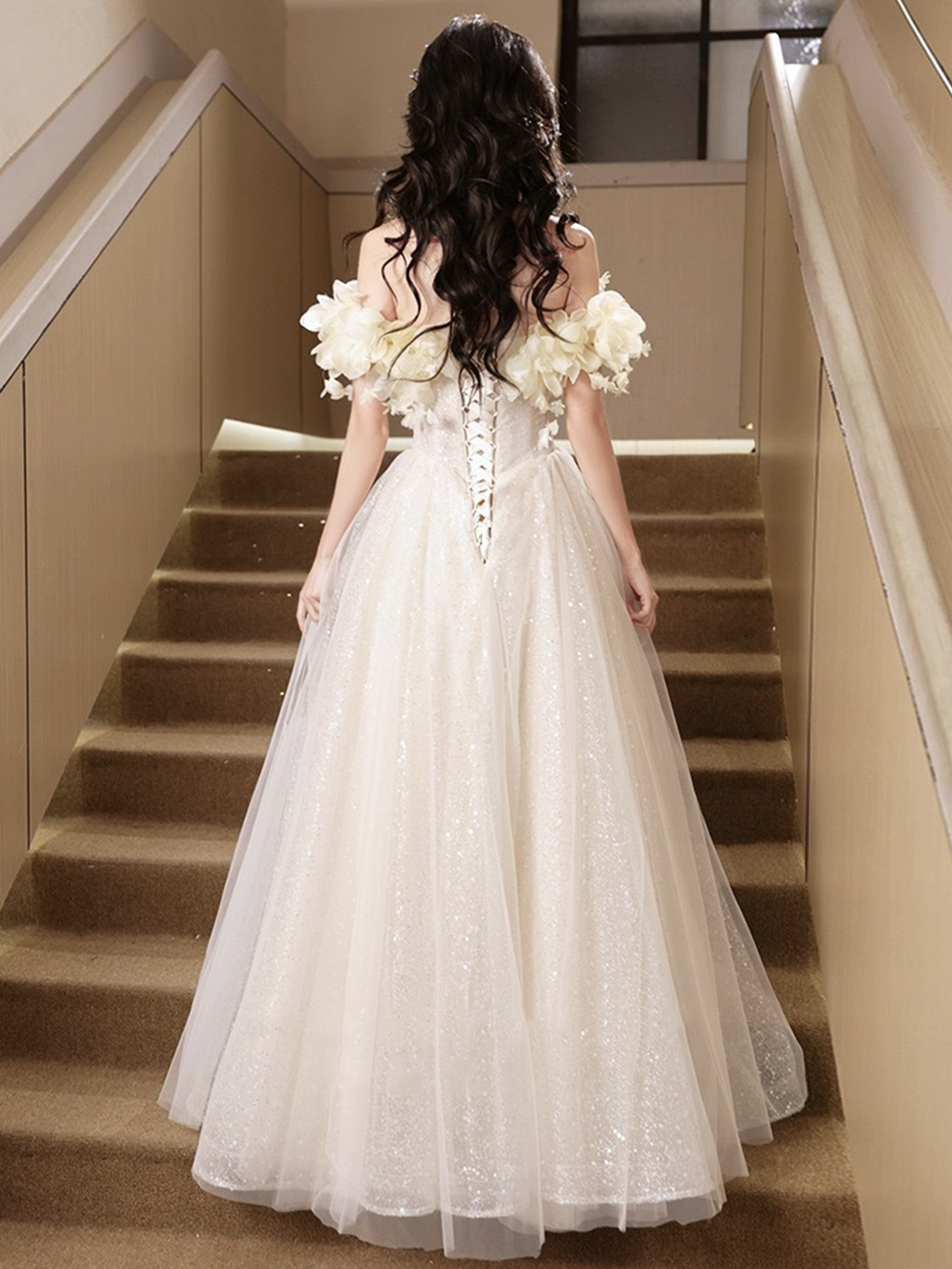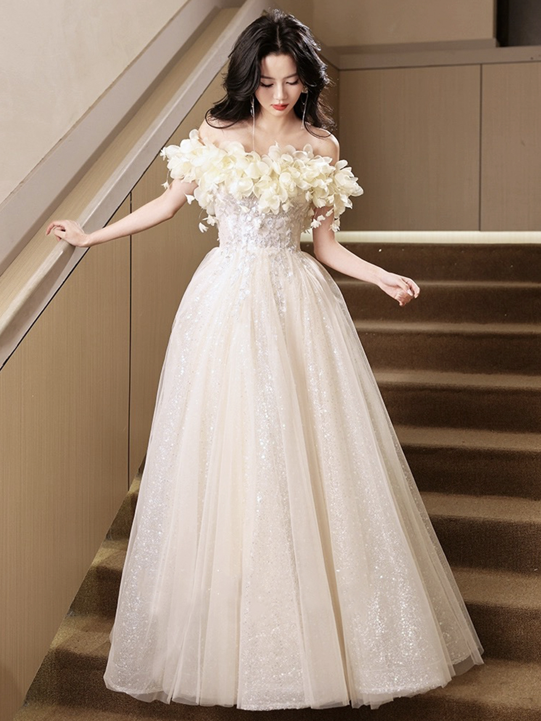 - Champagne Tulle Long Prom Dress, Off the Shoulder Evening Party Dress -