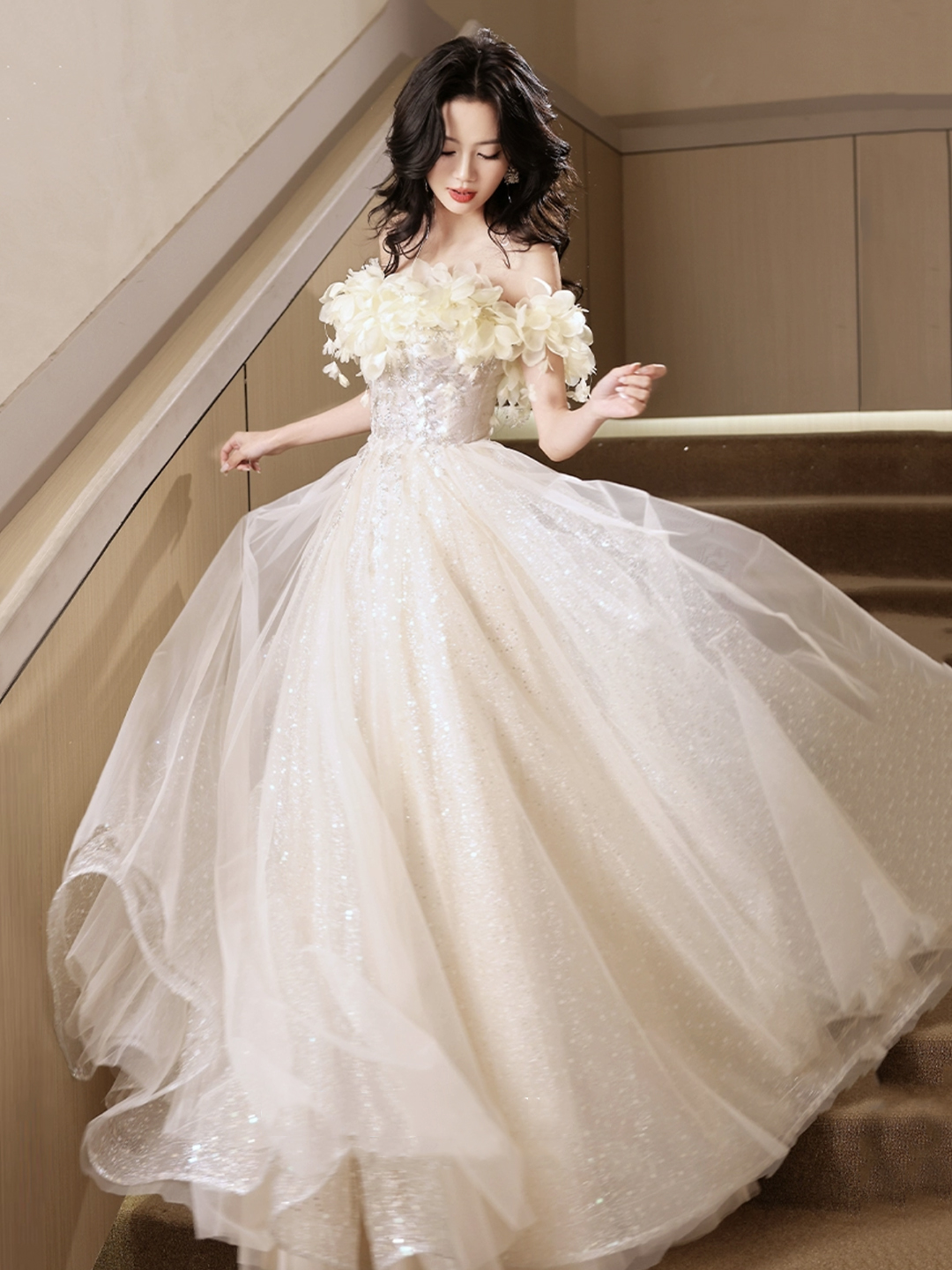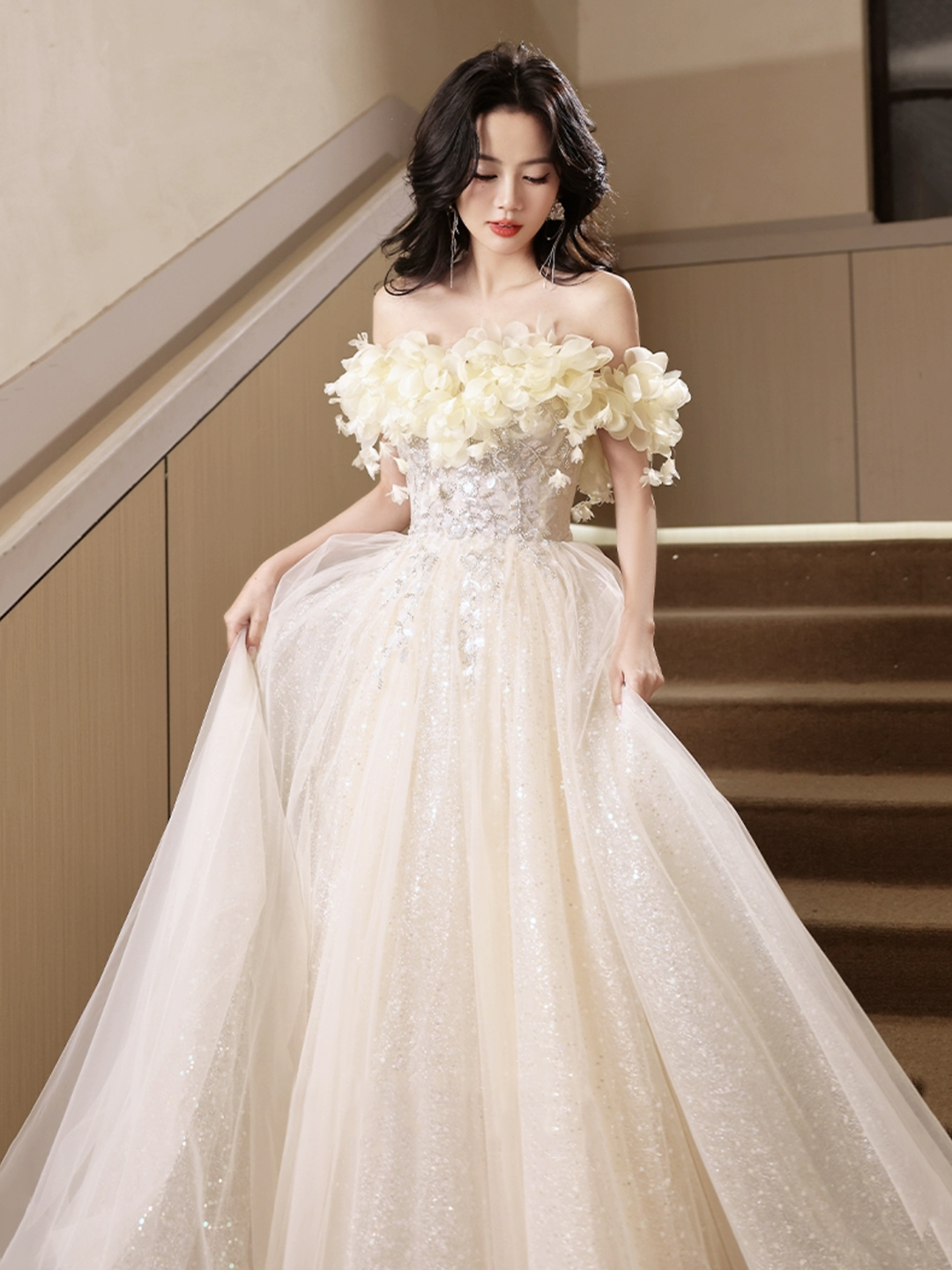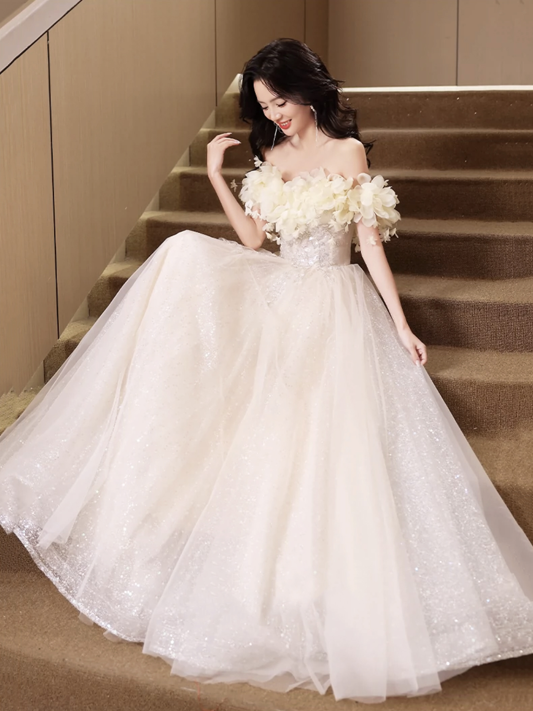 - Champagne Tulle Long Prom Dress, Off the Shoulder Evening Party Dress -